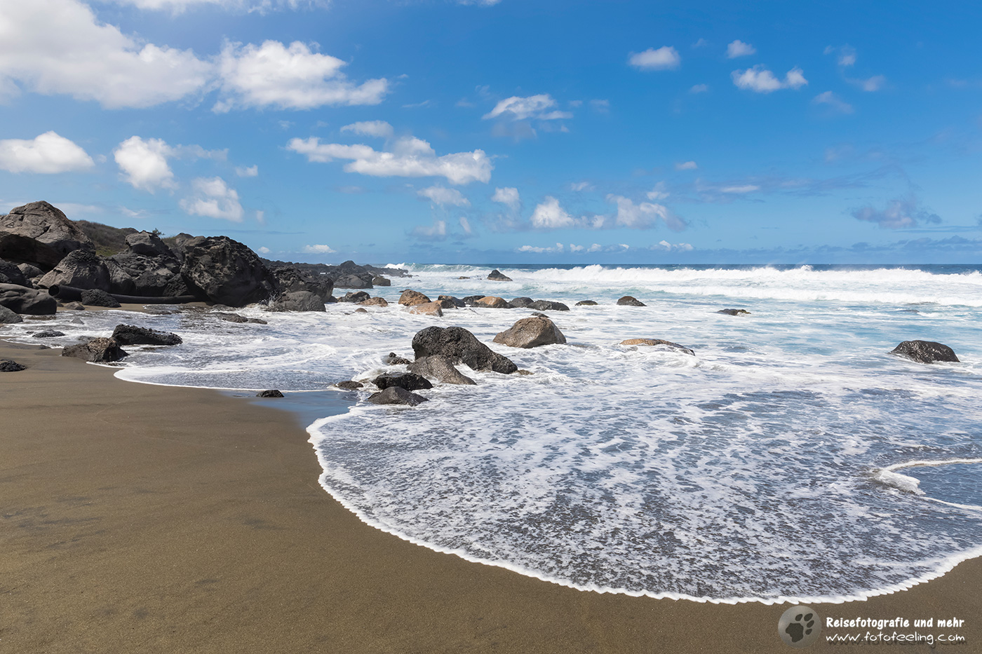 Je weiter wir uns vom Vulkan entfernten, desto schöner wurde auch wieder das Wetter. So fuhren wir spontan zur Ostküste, wo wir uns an einem Straßengrill das letzte knusprige Hühnchen kauften, das wir genüsslich mit Blick auf das Meer verspeisten. Leider wehte ein ganz schön heftiger Wind und Schaumkronen tanzten auf den Wellen, aber das Hühnchen schmeckte hervorragend.