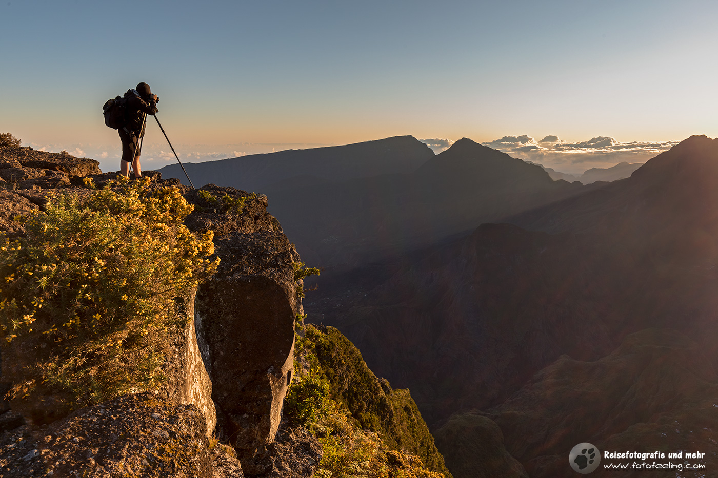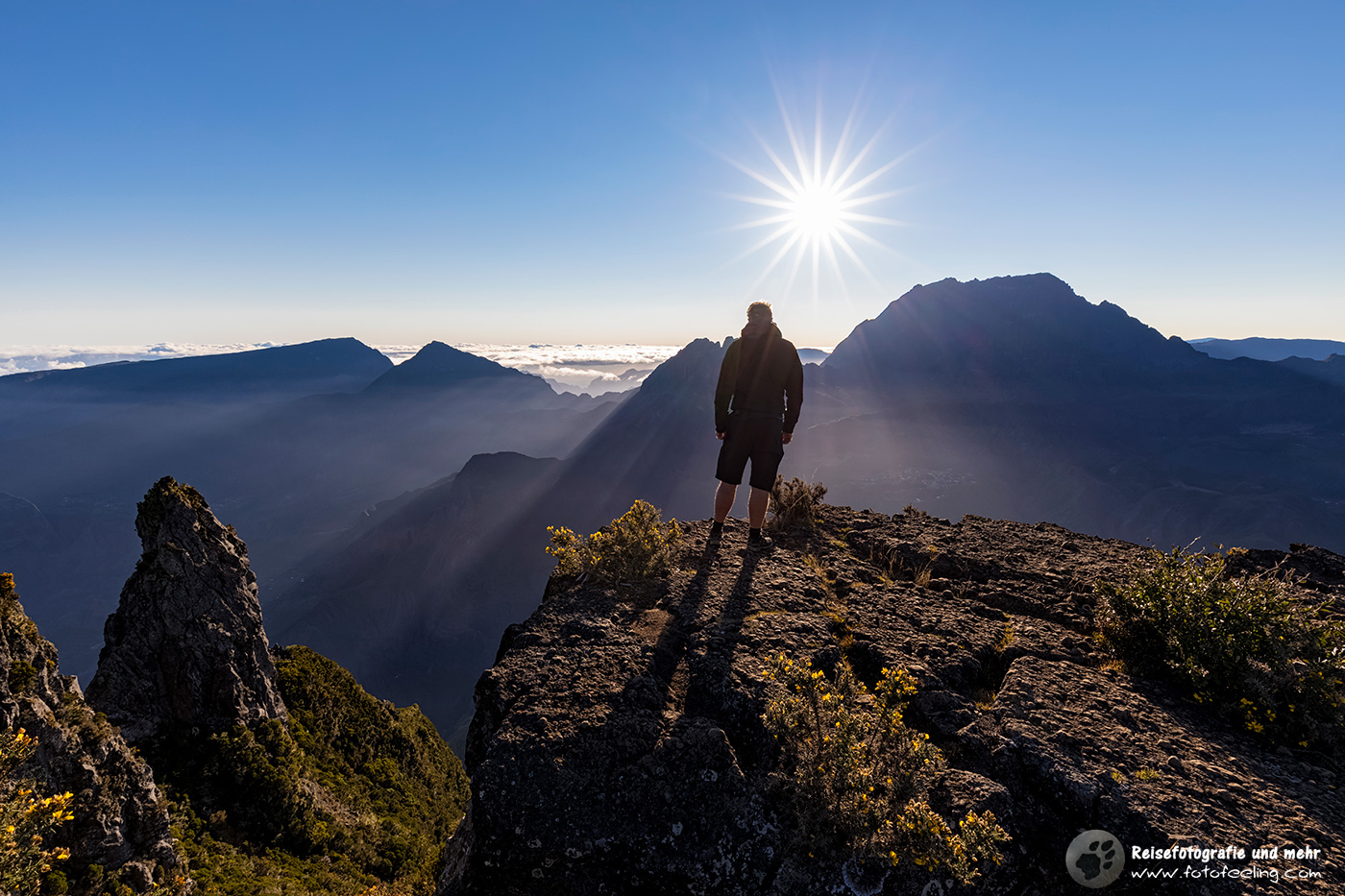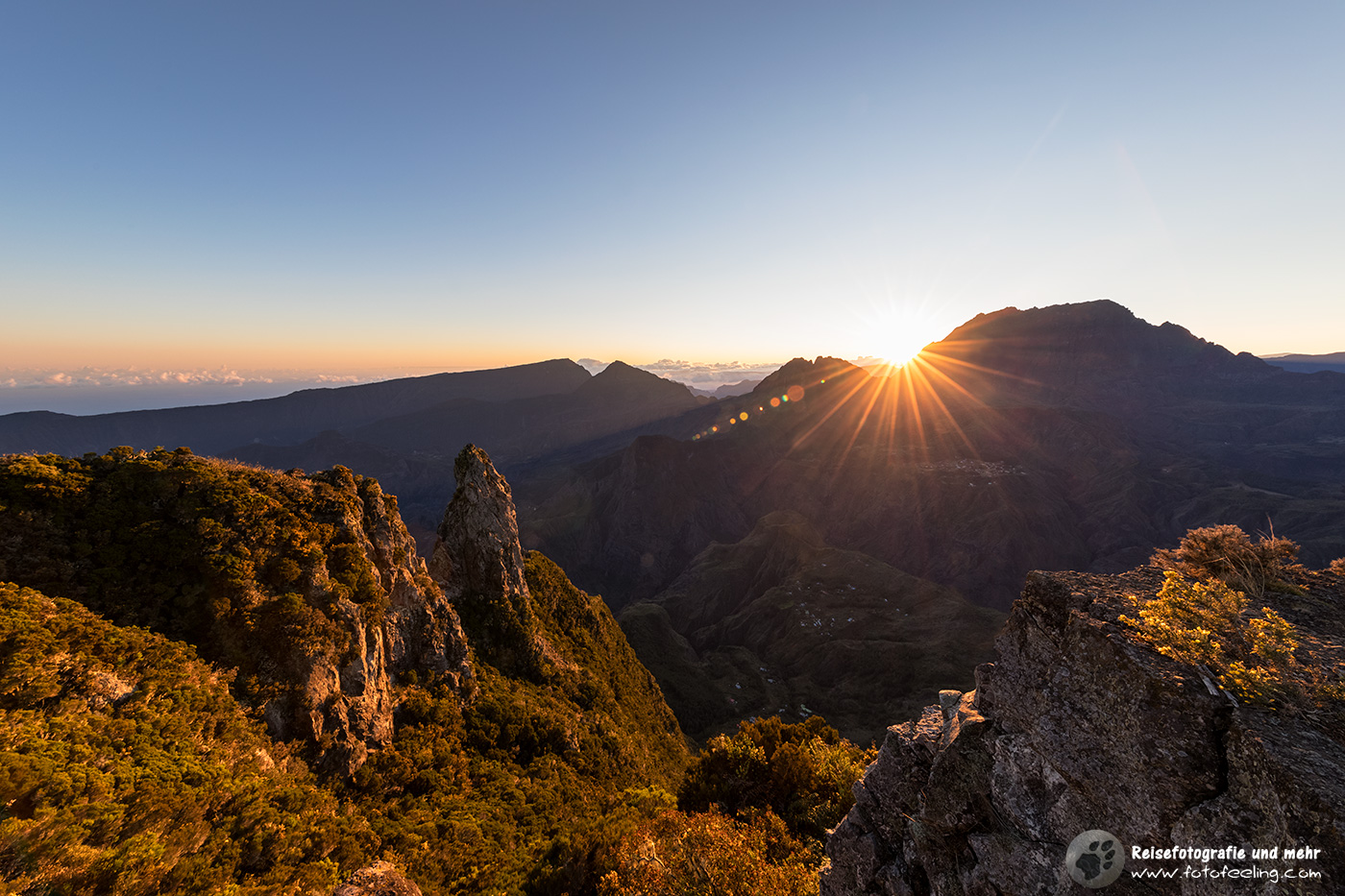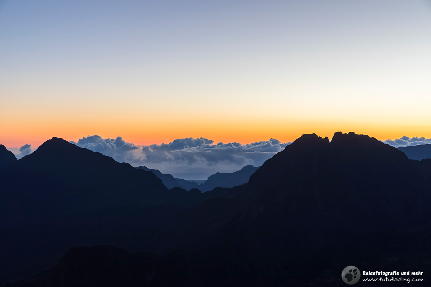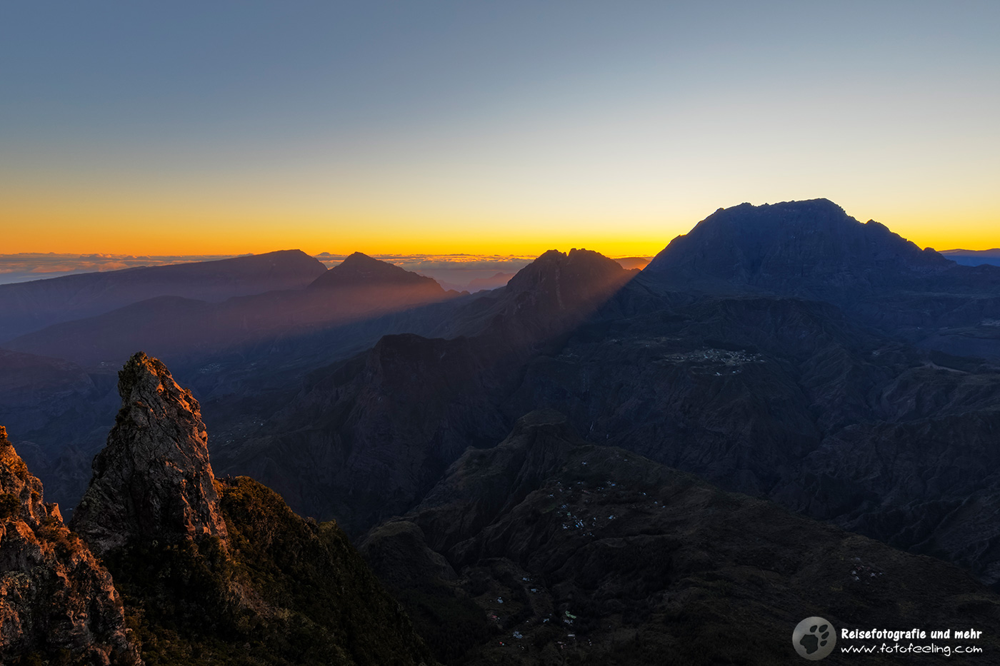 Schon waren wir startklar und es ging los. Unser Ziel war an diesem Morgen der Maido. Diesmal wollten wir es unbedingt schaffen. Das Auto war vollgetankt und unser Navi wies uns den Weg. So fuhren wir gut gelaunt unserem Ziel entgegen. Um diese Uhrzeit waren wir noch fast alleine unterwegs. Als die Straße zum Gipfel des Piton Maido abbog, die man erst ab 5.00 Uhr morgens befahren darf, kam uns nicht ein Auto mehr entgegen, oder überholte uns. Der Weg ging in vielen Kurven steil bergauf. Aber unser Duster kämpfte sich tapfer in völliger Dunkelheit den Berg hinauf. Wir dachten wirklich, dass wir alleine oben sind, aber natürlich hatten auch einige andere Leute diese Idee und standen schon am Aussichtspunkt, als wir ankamen. Wir waren sogar einen Tick zu spät und das schönste Licht der Dämmerung war schon vorbei. So nutzten wir die Zeit bis zum Sonnenaufgang und wanderten am Aussichtspunkt entlang bis zum höchsten Punkt, wo wir zu den Felsen an die Abbruchkante herankamen und perfekt in den Talkessel des Mafate schauen konnten. Die Bergwelt vor uns mit ihren Spitzen und den Tälern wirkte seltsam surreal und absolut berauschend auf uns. Es war so schön, dass wir uns kaum satt sehen konnten. Hinter den Bergen lauerten schon die Wolken wie eine Wand aus Watte. Dann kam langsam die Sonne heraus und kletterte über die Wolken. Mit 4 Grad war es sehr kühl an diesem Morgen, aber davon merkten wir fast nichts, so begeistert waren wir von unserer Aussicht und der felsigen Umgebung. Trotzdem genossen wir das erste Licht, das uns langsam in die Gesichter fiel und uns wärmte. Das Licht eroberte ganz langsam die Felsen um uns herum und schlich sich hinunter in das Tal. Aus den Grautönen wurden warme Farben, die die Landschaft verzauberten. Vögel zwitscherten und aus den Siedlungen unter uns drangen Geräusche zu uns hinauf. Erste Hubschrauber flogen durch das Tal und um uns herum.