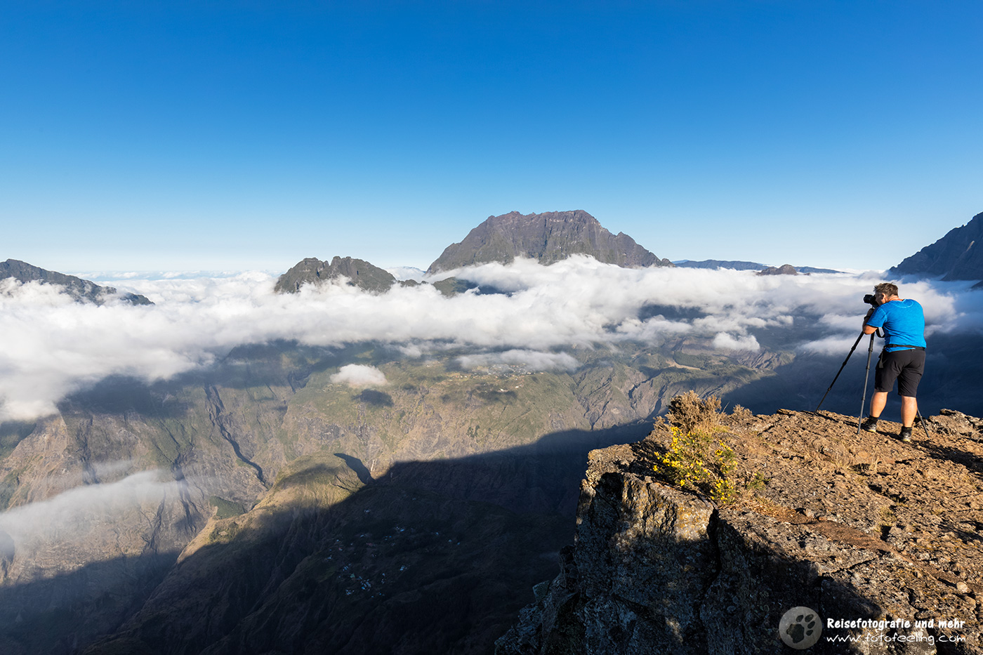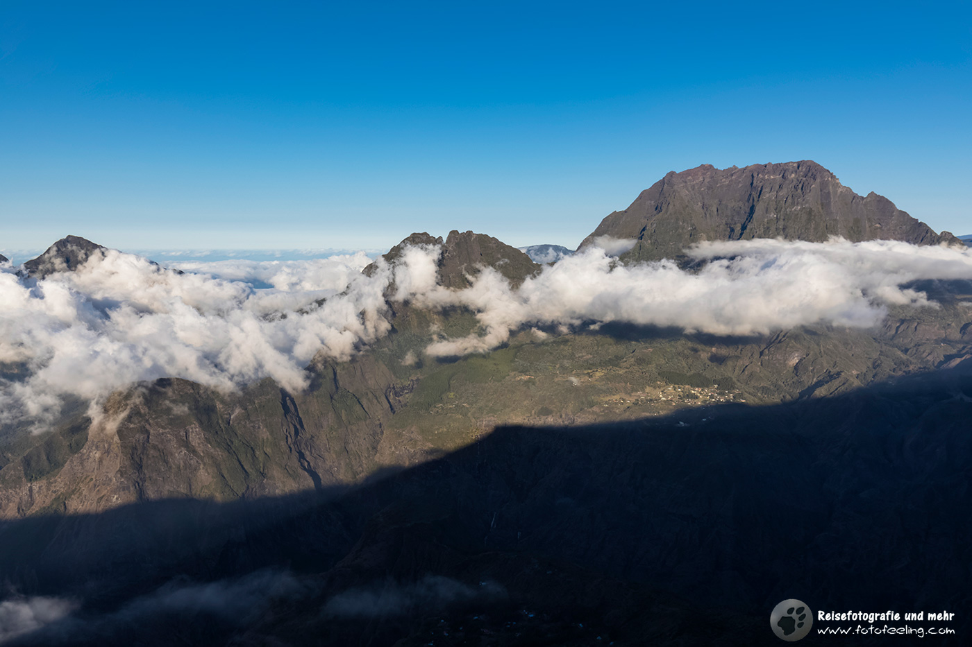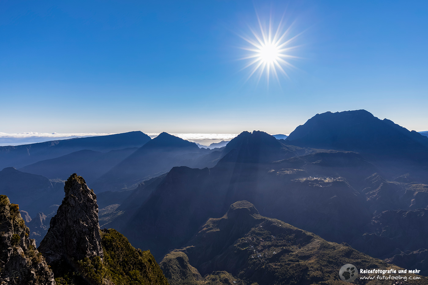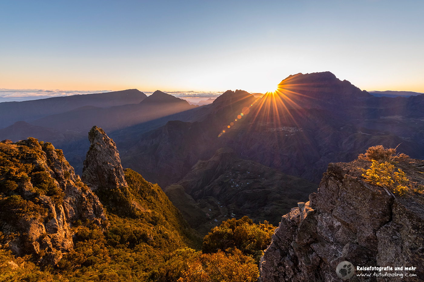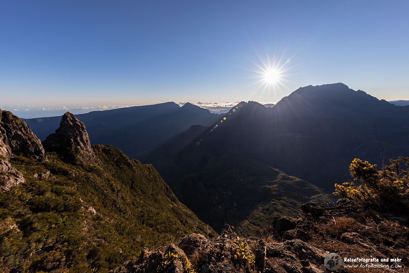 Schon waren wir startklar und es ging los. Unser Ziel war an diesem Morgen der Maido. Diesmal wollten wir es unbedingt schaffen. Das Auto war vollgetankt und unser Navi wies uns den Weg. So fuhren wir gut gelaunt unserem Ziel entgegen. Um diese Uhrzeit waren wir noch fast alleine unterwegs. Als die Straße zum Gipfel des Piton Maido abbog, die man erst ab 5.00 Uhr morgens befahren darf, kam uns nicht ein Auto mehr entgegen, oder überholte uns. Der Weg ging in vielen Kurven steil bergauf. Aber unser Duster kämpfte sich tapfer in völliger Dunkelheit den Berg hinauf. Wir dachten wirklich, dass wir alleine oben sind, aber natürlich hatten auch einige andere Leute diese Idee und standen schon am Aussichtspunkt, als wir ankamen. Wir waren sogar einen Tick zu spät und das schönste Licht der Dämmerung war schon vorbei. So nutzten wir die Zeit bis zum Sonnenaufgang und wanderten am Aussichtspunkt entlang bis zum höchsten Punkt, wo wir zu den Felsen an die Abbruchkante herankamen und perfekt in den Talkessel des Mafate schauen konnten. Die Bergwelt vor uns mit ihren Spitzen und den Tälern wirkte seltsam surreal und absolut berauschend auf uns. Es war so schön, dass wir uns kaum satt sehen konnten. Hinter den Bergen lauerten schon die Wolken wie eine Wand aus Watte. Dann kam langsam die Sonne heraus und kletterte über die Wolken. Mit 4 Grad war es sehr kühl an diesem Morgen, aber davon merkten wir fast nichts, so begeistert waren wir von unserer Aussicht und der felsigen Umgebung. Trotzdem genossen wir das erste Licht, das uns langsam in die Gesichter fiel und uns wärmte. Das Licht eroberte ganz langsam die Felsen um uns herum und schlich sich hinunter in das Tal. Aus den Grautönen wurden warme Farben, die die Landschaft verzauberten. Vögel zwitscherten und aus den Siedlungen unter uns drangen Geräusche zu uns hinauf. Erste Hubschrauber flogen durch das Tal und um uns herum.