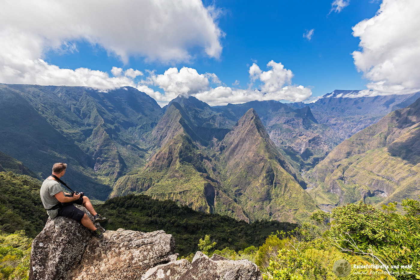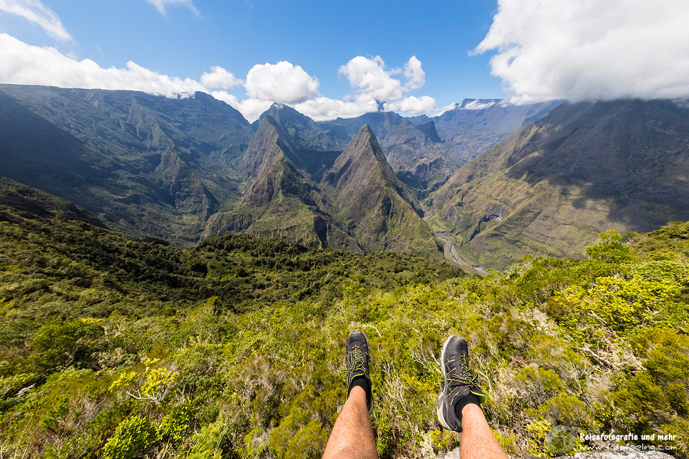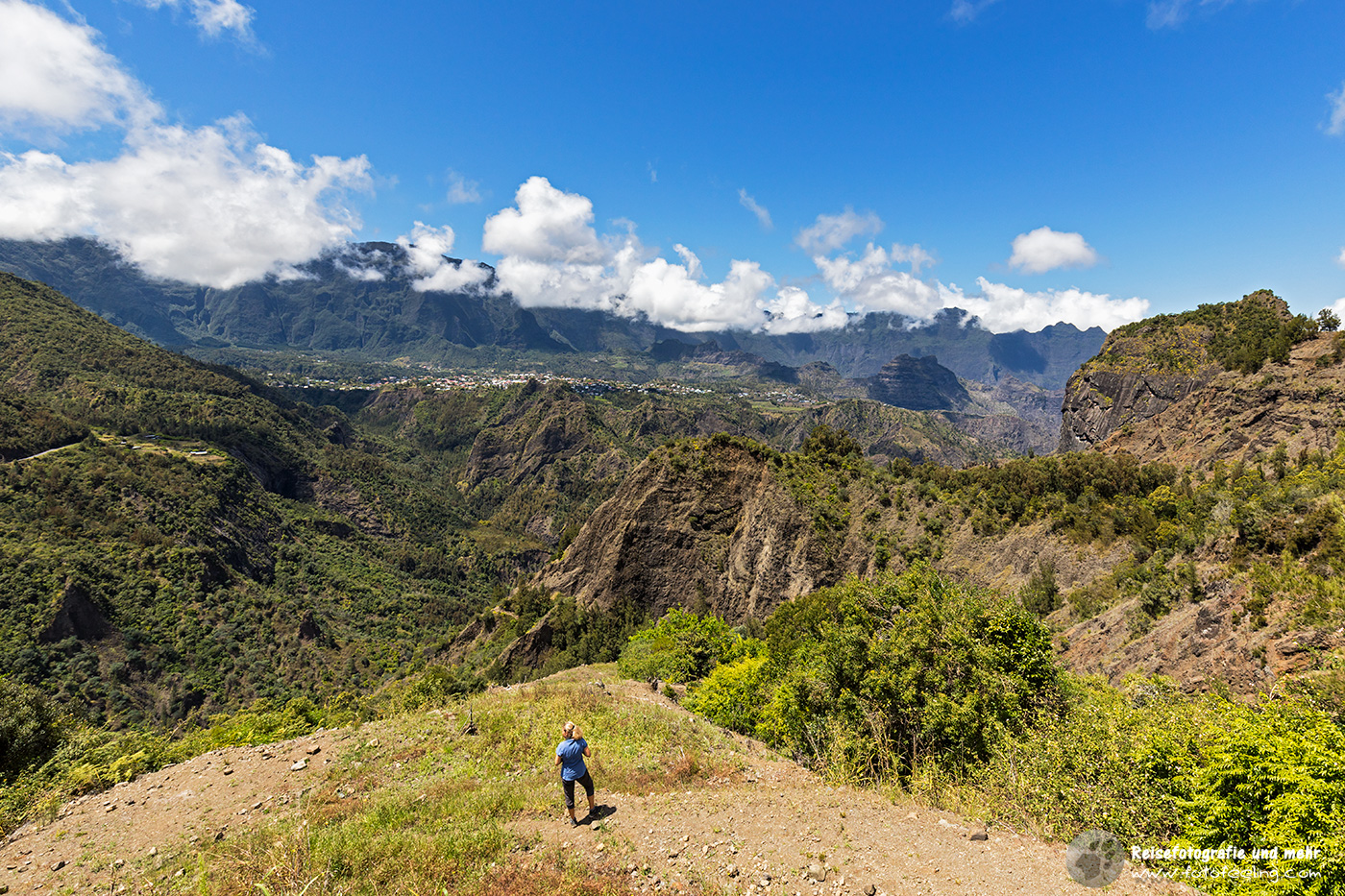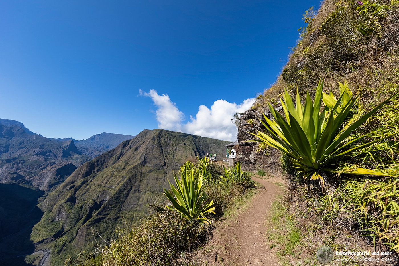 Da das Wetter absolut super aussah, beschlossen wir spontan zur Nordseite zum Dos d'Âne zu fahren und vom Cap Noir den Blick in den Talkessel von Mafate zu genießen. Doch vorher mussten wir dorthin kommen. Das sah von hier oben recht einfach aus, denn es lag ja in Blickweite, aber mit dem Auto war das eine ganz andere Geschichte, denn wir mussten zuerst wieder den Berg hinab und danach einmal quer über die Insel. Natürlich staute es sich und es hatte relativ viel Verkehr, aber irgendwann gefühlte Stunden später kamen wir auf dem Parkplatz vom Cap Noir an. Für die knapp 40 Kilometer hatten wir über eine Stunde gebraucht. Natürlich war kein Parkplatz mehr frei und wir mussten etwas weiter unten an der Straße parken. Doch der Grund waren nicht die vielen Wanderer, sondern ein Hubschrauber, der Kisten und Ausrüstung in den Cirque de Mafate transportierte. Wir schauten ein wenig zu und begaben uns dann auf den Trail, der am unteren Ende vom Parkplatz beginnt. Das Wetter war immer noch traumhaft und so wanderten wir frohen Mutes los. Der Weg war gut markiert und wir folgten einfach den Wegweisern zum Cap Noir. Nach ca. 100 Metern gabelte sich der Weg, wir hielten uns rechts und gingen erst einmal etwas bergab. Nach knapp 700 Metern erreichten wir den Aussichtspavillon am Cap Noir und blickten in den Talkessel von Mafate, der von einer senkrecht abfallenden Felswand umrahmt ist. Tief unter uns die Schlucht des Rivère des Galets mit den beiden markanten Bergrücken Crête de la Marianne und Crête d'Aurère sowie dem kegelförmigen Piton Cabris. Ein wirklich atemberaubender Anblick aus einer anderen Perspektive.