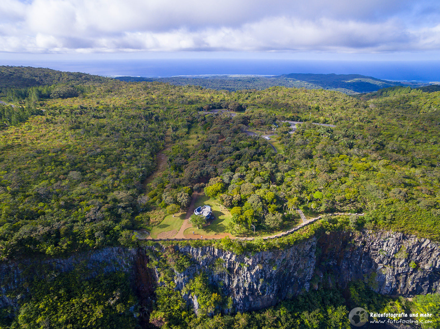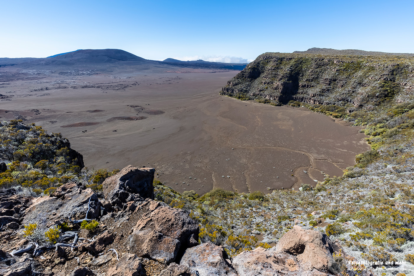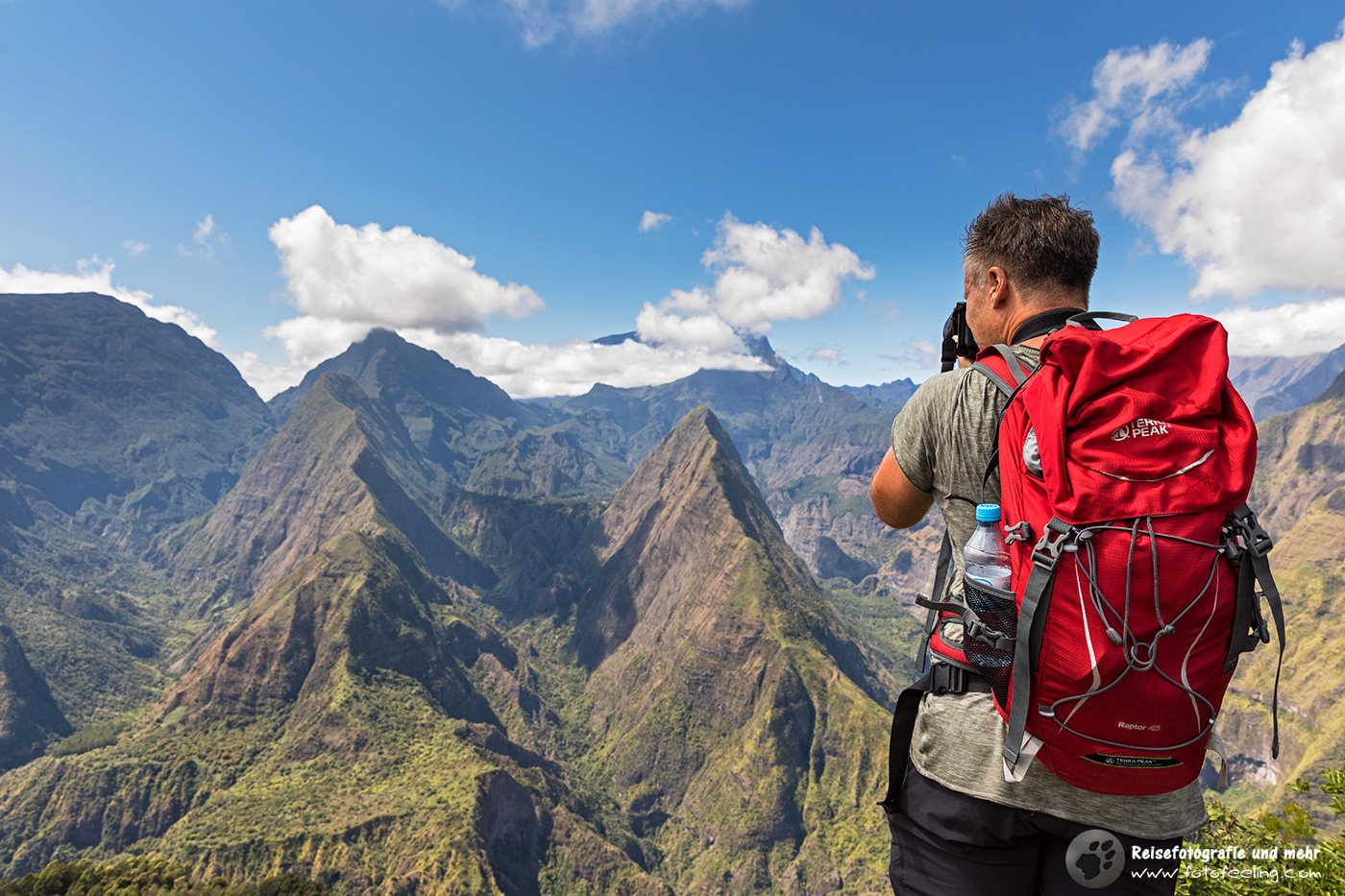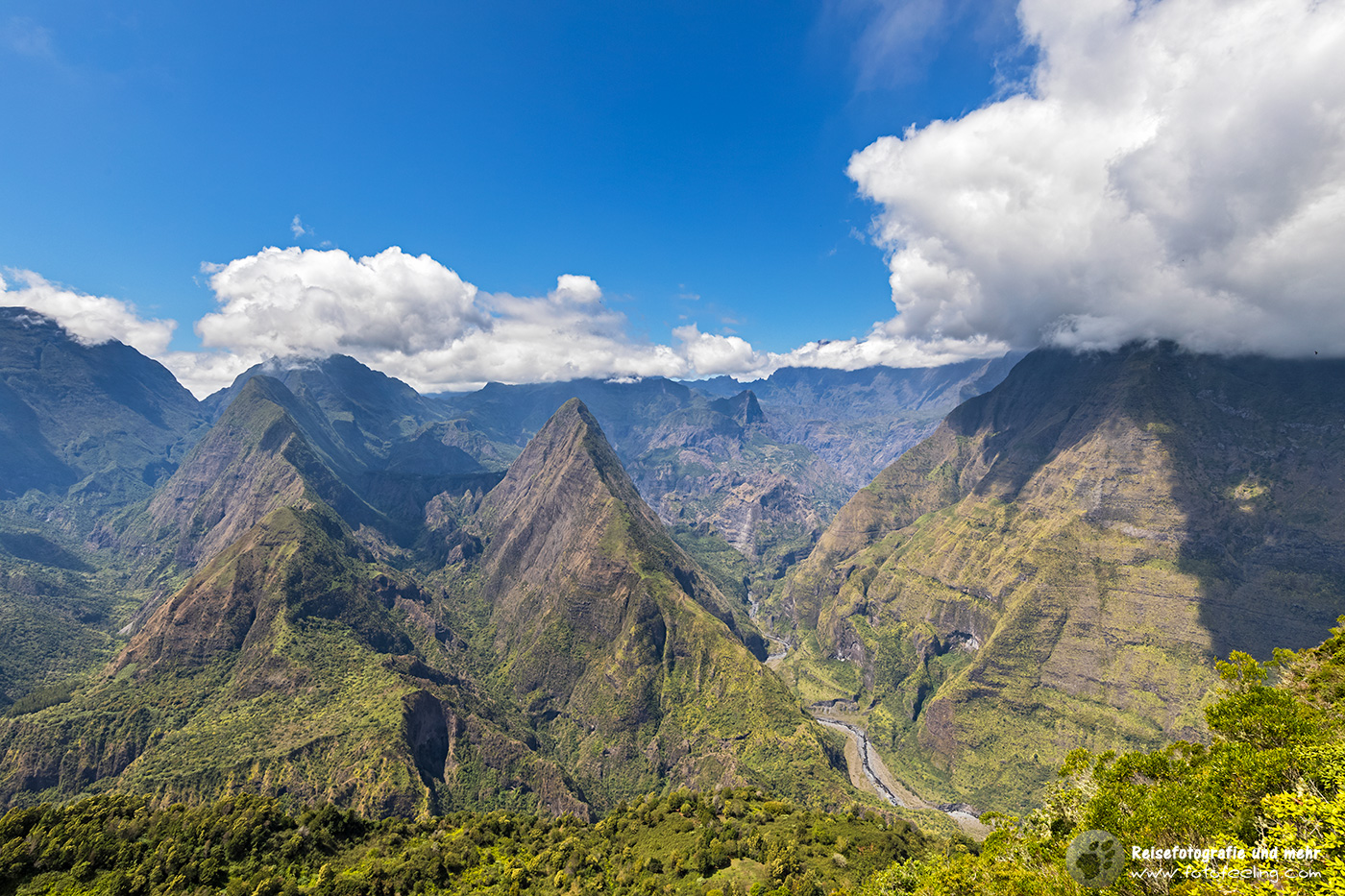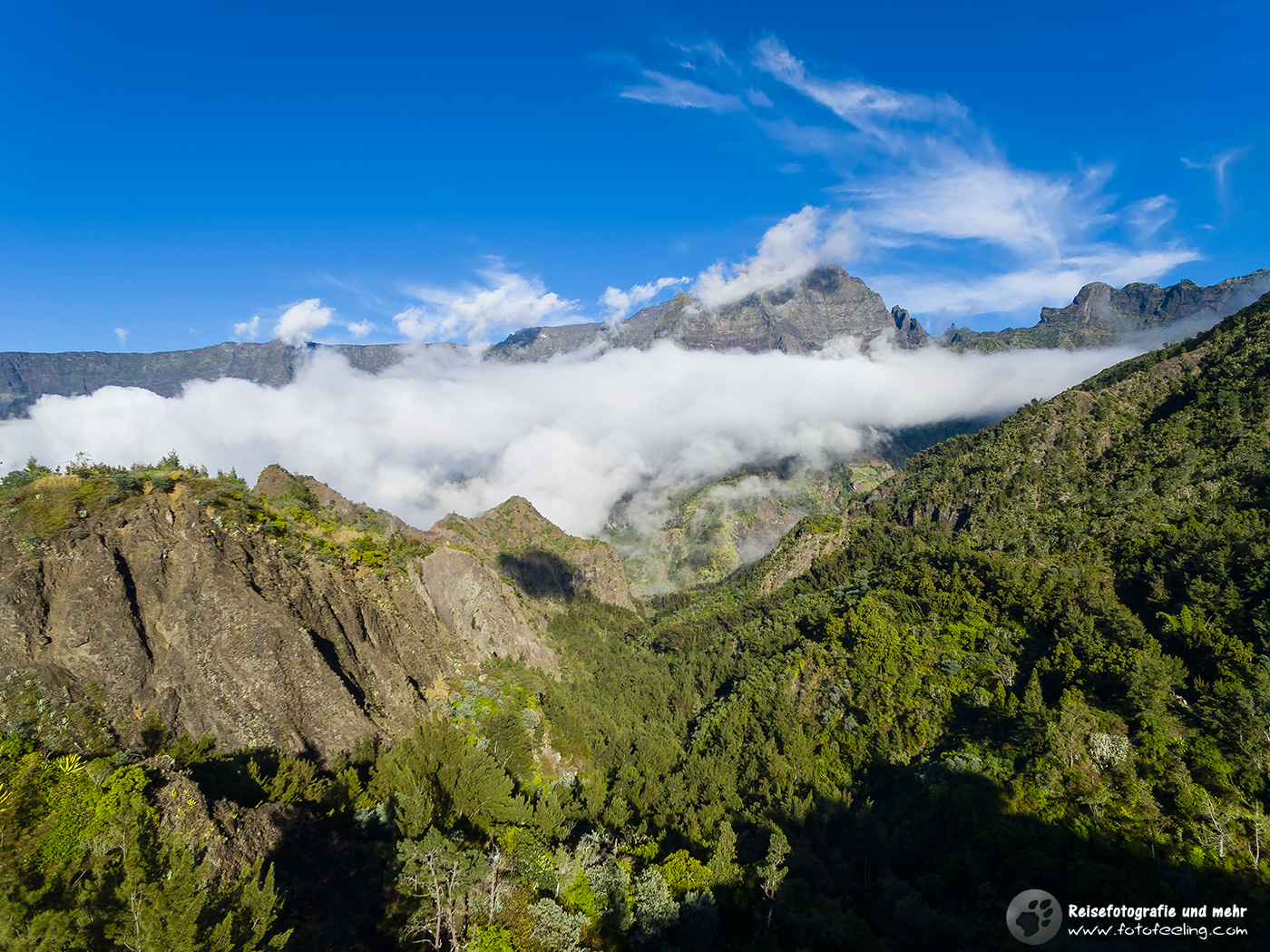Da das Wetter absolut super aussah, beschlossen wir spontan zur Nordseite zum Dos d'Âne zu fahren und vom Cap Noir den Blick in den Talkessel von Mafate zu genießen. Doch vorher mussten wir dorthin kommen. Das sah von hier oben recht einfach aus, denn es lag ja in Blickweite, aber mit dem Auto war das eine ganz andere Geschichte, denn wir mussten zuerst wieder den Berg hinab und danach einmal quer über die Insel. Natürlich staute es sich und es hatte relativ viel Verkehr, aber irgendwann gefühlte Stunden später kamen wir auf dem Parkplatz vom Cap Noir an. Für die knapp 40 Kilometer hatten wir über eine Stunde gebraucht. Natürlich war kein Parkplatz mehr frei und wir mussten etwas weiter unten an der Straße parken. Doch der Grund waren nicht die vielen Wanderer, sondern ein Hubschrauber, der Kisten und Ausrüstung in den Cirque de Mafate transportierte. Wir schauten ein wenig zu und begaben uns dann auf den Trail, der am unteren Ende vom Parkplatz beginnt. Das Wetter war immer noch traumhaft und so wanderten wir frohen Mutes los. Der Weg war gut markiert und wir folgten einfach den Wegweisern zum Cap Noir. Nach ca. 100 Metern gabelte sich der Weg, wir hielten uns rechts und gingen erst einmal etwas bergab. Nach knapp 700 Metern erreichten wir den Aussichtspavillon am Cap Noir und blickten in den Talkessel von Mafate, der von einer senkrecht abfallenden Felswand umrahmt ist. Tief unter uns die Schlucht des Rivère des Galets mit den beiden markanten Bergrücken Crête de la Marianne und Crête d'Aurère sowie dem kegelförmigen Piton Cabris. Ein wirklich atemberaubender Anblick aus einer anderen Perspektive.