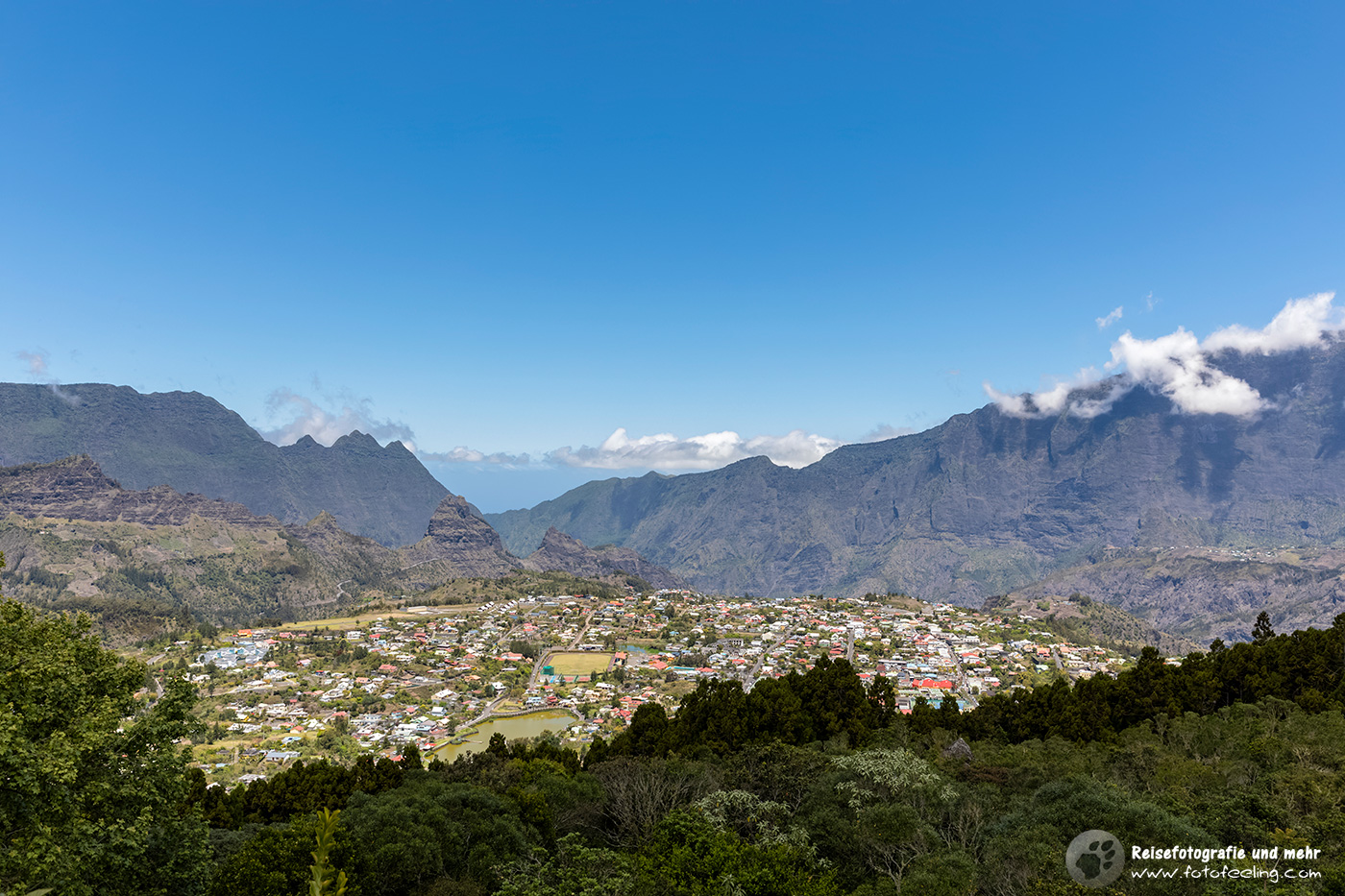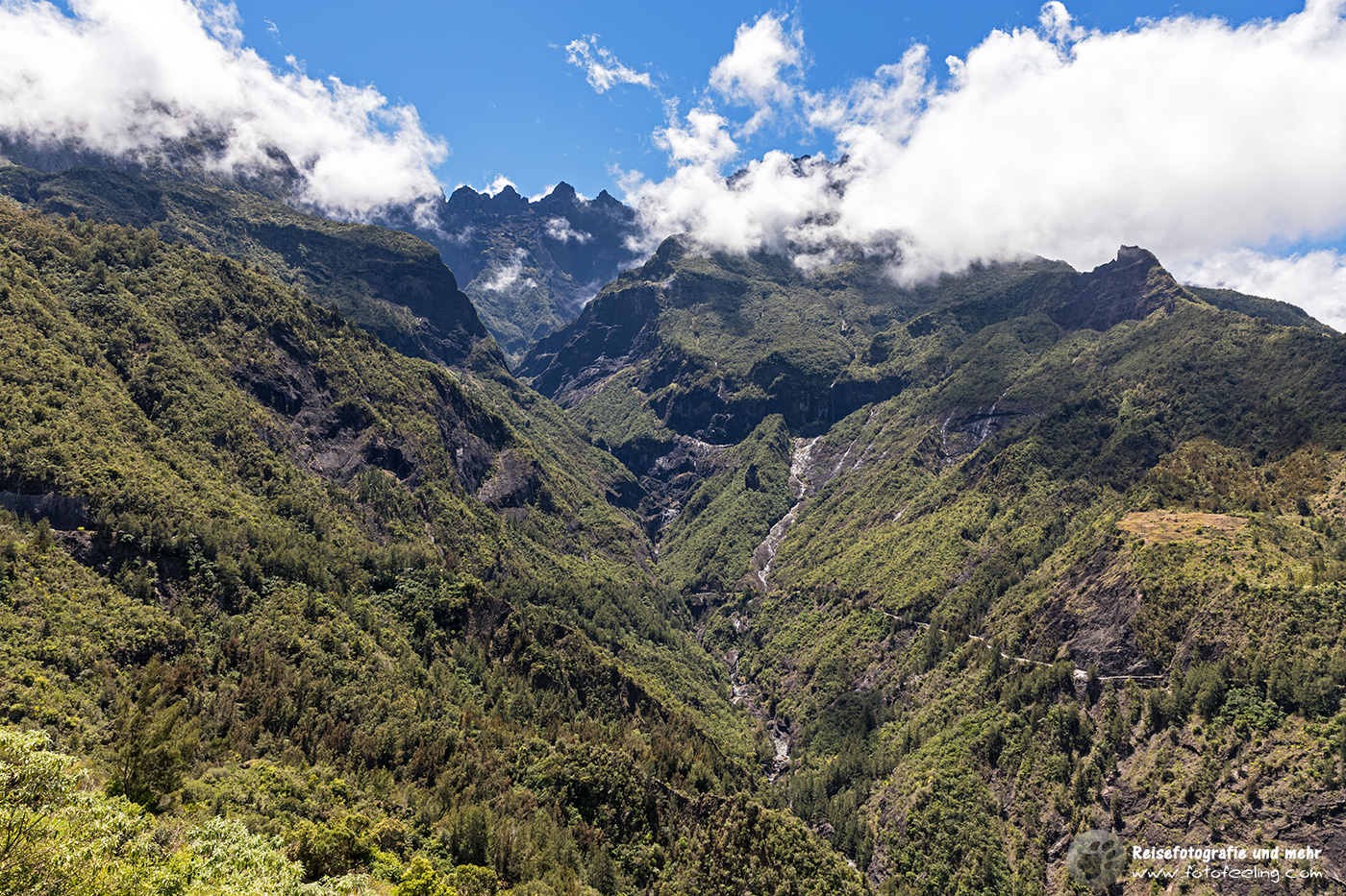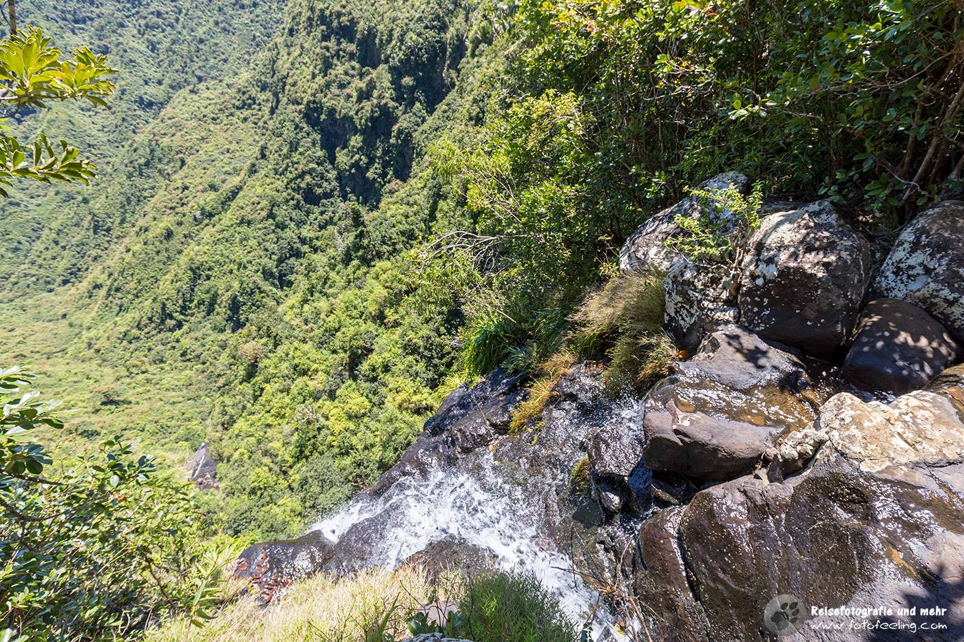 Wir fuhren zur D242, auf der wir gerade noch ein Stück gewandert waren und schauten uns die traumhaften Ausblicke entlang der Straße an. Von hier aus hatten wir immer wieder eine tolle Sicht auf Cilaos, das auf einem Bergplateau liegt und von Bergen umgeben ist. Alles war so grün und Wasserfälle flossen die Hänge hinab.