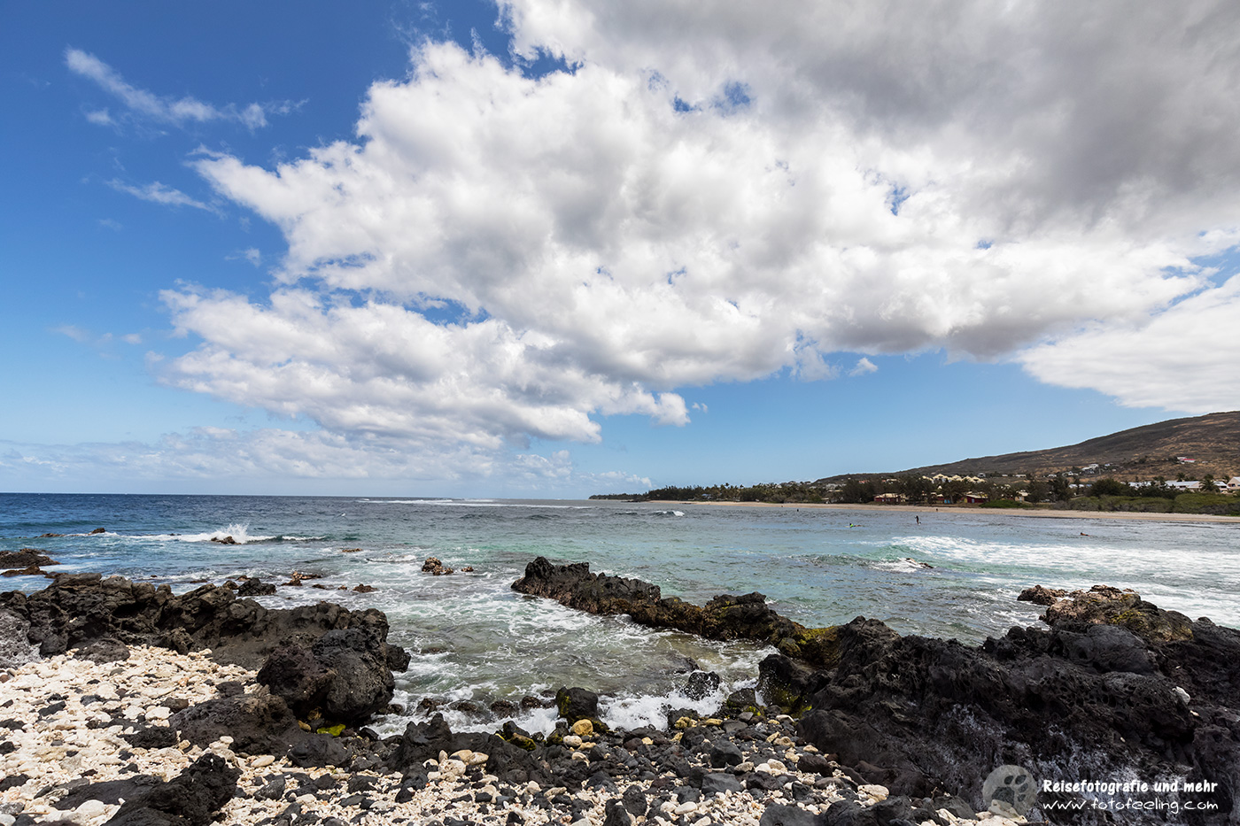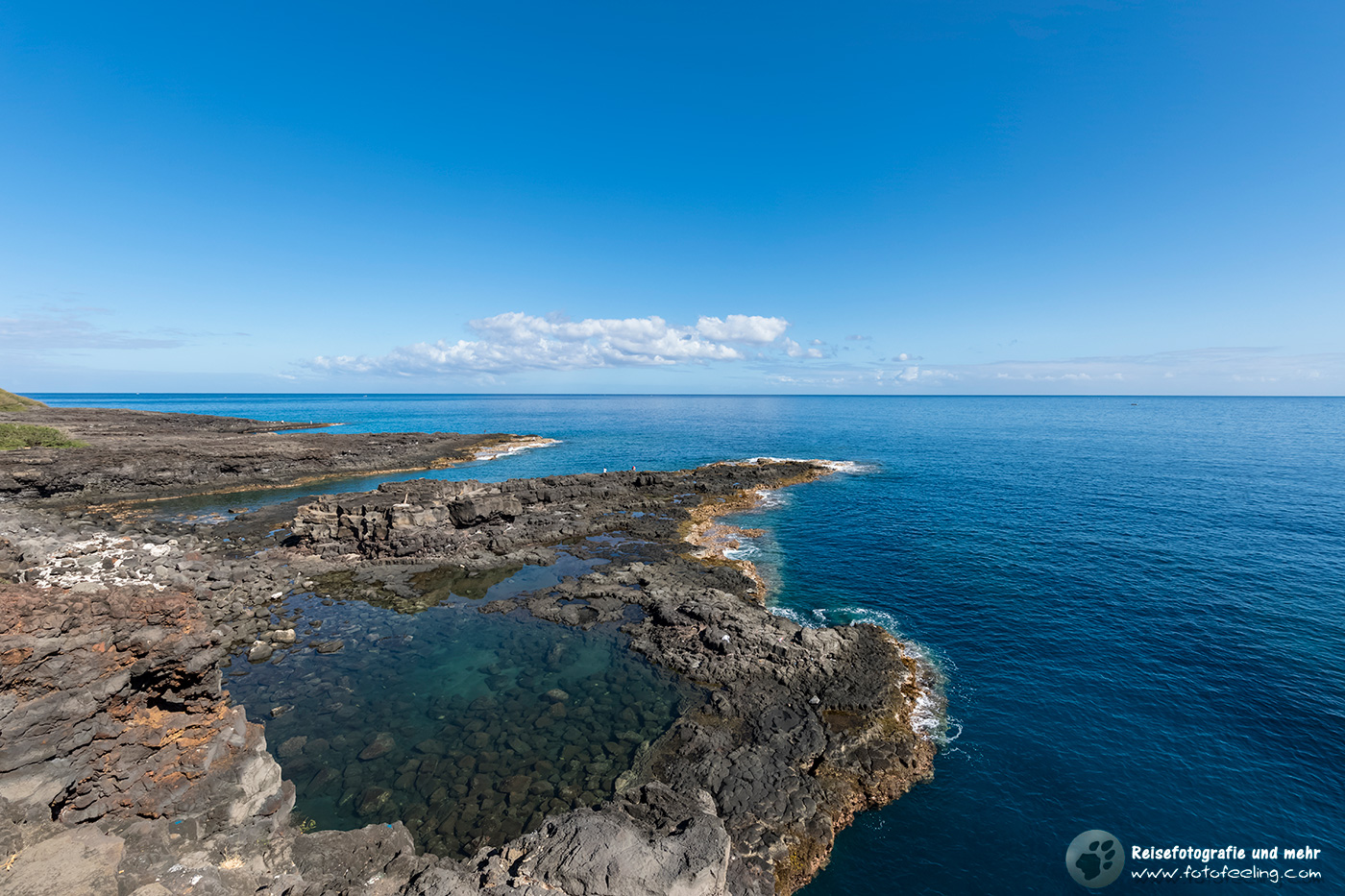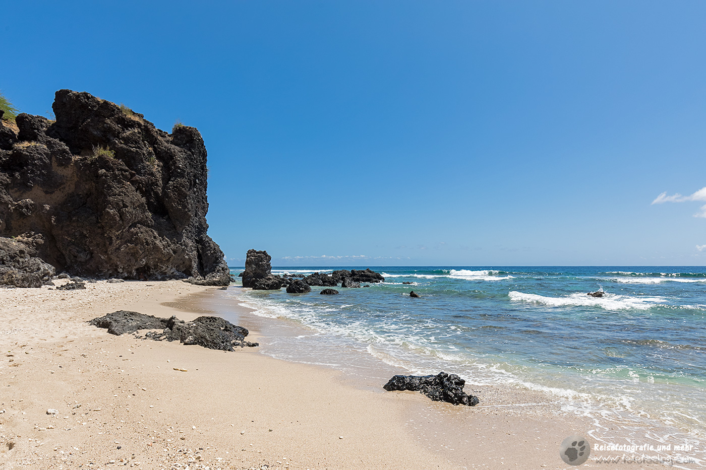 Das Wetter wurde immer besser und schon bald schaute die Sonne heraus. Wir umrunden die gesamte Insel und schauen uns immer wieder die Strände an. Einen Stopp machten wir in Blue Bay, wo man im gleichnamigen Marinepark sehr gut schnorcheln kann. Aber die Boote waren schon weg und außerdem hatten wir unser Schnorchelzeug nicht dabei und wollten ja die Insel umrunden. Dafür holten wir uns wieder frische Ananas, die wir uns gleich schmecken ließen.