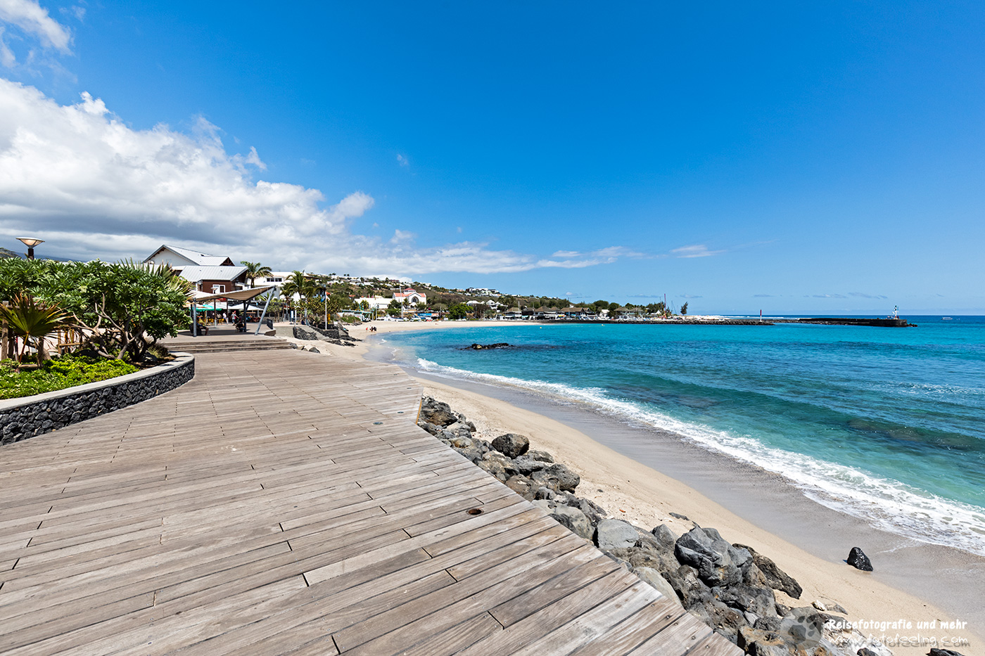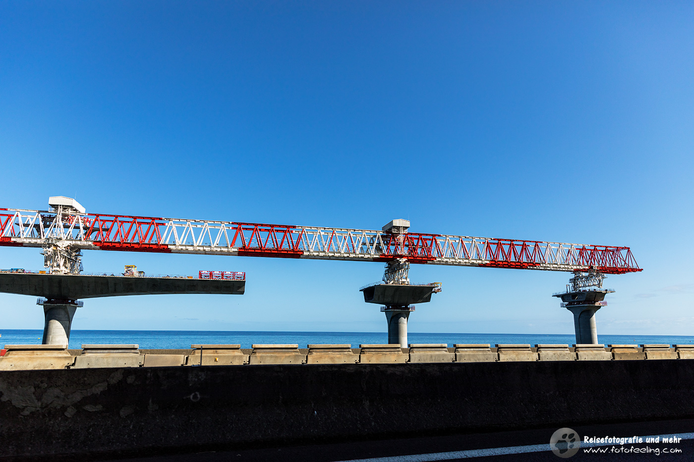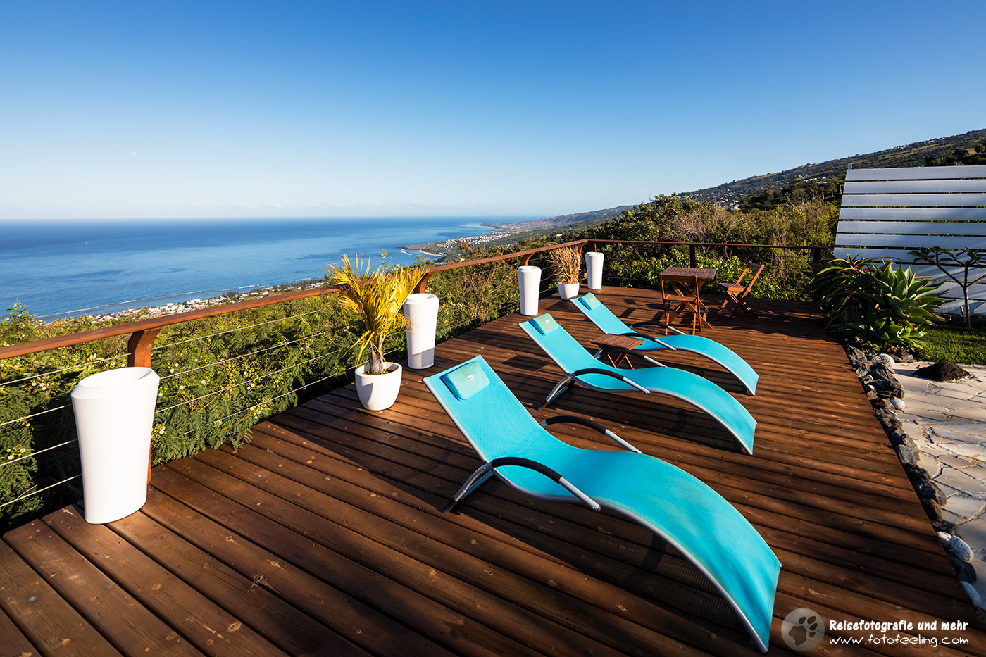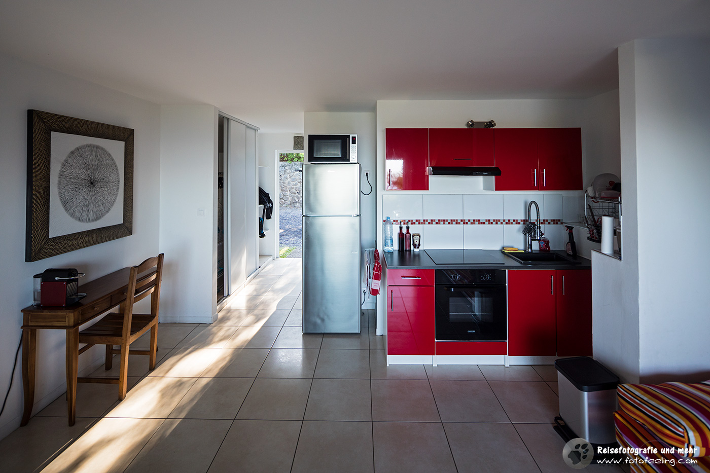 Dank Navi kamen wir gut aus dem Flughafengelände heraus und schon bald kämpften wir uns durch unseren ersten Stau in Saint-Denis bis auf die Ringstraße, die uns in Richtung Saint Leu führte. Ab hier kamen wir jedoch gut voran und bestaunten den Bau einer neuen Straße, die auf hohen Pfeilern im Meer die Küsten entlangführen wird. Entlang vieler kleiner Orte näherten wir uns unserem Ziel - der Unterkunft Kaz Ocean, die ca. 40 km von Saint-Denis entfernt liegt. Wir verließen die Ringstraße und waren auf einmal in einer anderen Welt. Enge kurvige Straßen und zum Teil Gassen führten uns immer höher hinauf bis in den kleinen Ort, wo unsere Unterkunft sich befand. Erst einmal fuhren wir an der engen Einfahrt vorbei, die bergab bis zu unserem Bungalow führte, doch beim zweiten Versuch klappte es und ich fand die Zufahrt zu Fuß. Denn die Straße war wirklich extrem eng und führt steil bergab. Aber alles war richtig und schon bald standen wir auf dem Hof, wo uns Priscilla das Hausmädchen schon erwartete, da die Besitzer Yves und Stephan an diesem Tag verhindert waren. Leider konnten wir überhaupt kein Französisch und sie so gut wie kein Englisch, aber mit Händen und Füßen und viel Gelächter konnten wir uns besser als gedacht verständigen. Das Zimmer gefiel uns auf Anhieb. Es war klein und gemütlich und mit allem ausgestattet, was das Herz begehrte. Eine komplett ausgestattete Küche mit Sitzecke und einer kleinen Terrasse, über die man durch den Garten zum Pool kam. Eine Holztreppe führte hoch zu einer kleinen Galerie, wo unser Bett stand. Ein Obstteller mit exotischen Früchten stand für uns bereit und ein paar Sachen waren schon im Kühlschrank. Wir packten etwas aus und erkundeten die schöne Gartenanlage mit dem Pool und seiner wunderschönen Aussicht auf das blau funkelnde Meer. Hier stand auch der Gasgrill, den Chris unbedingt ausprobieren wollte. Es war herrlich warm und die Vögel zwitscherten.