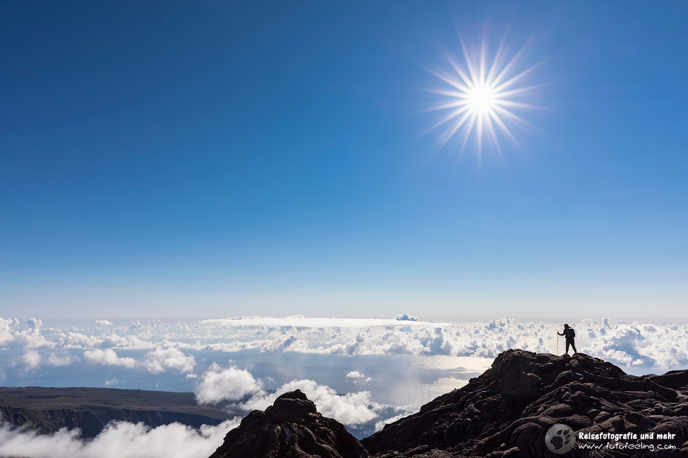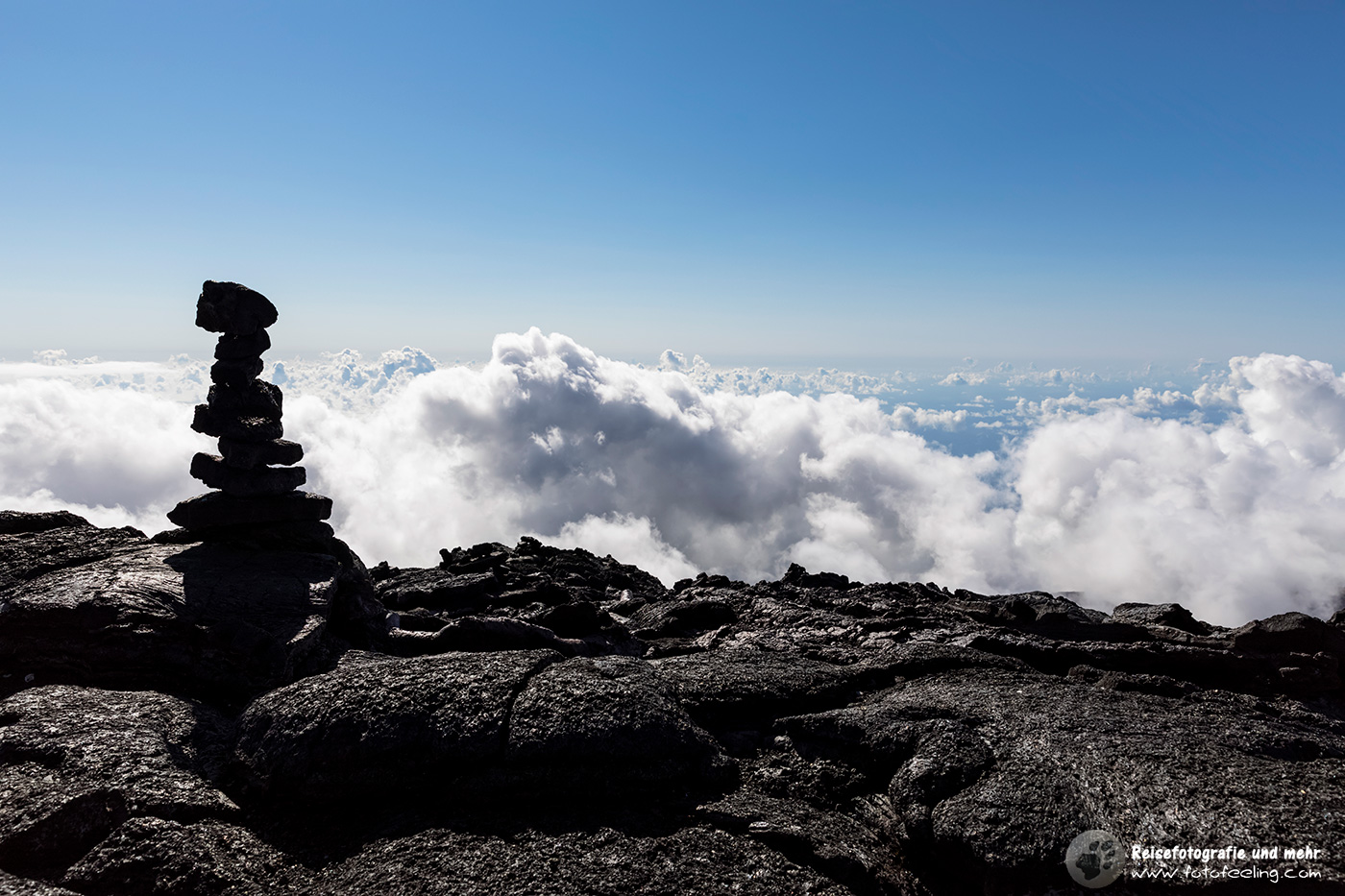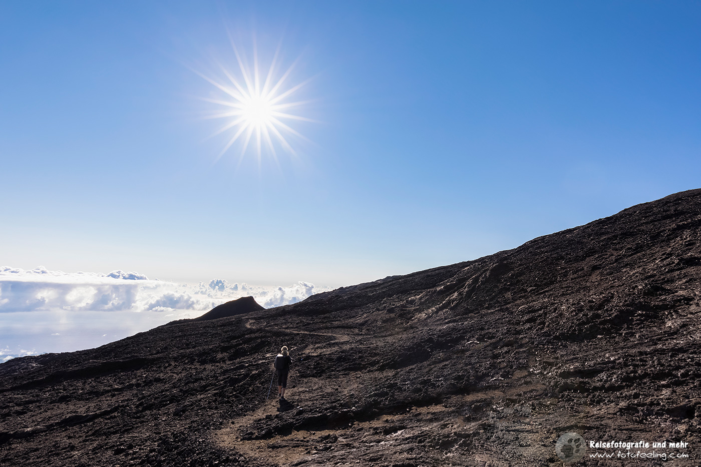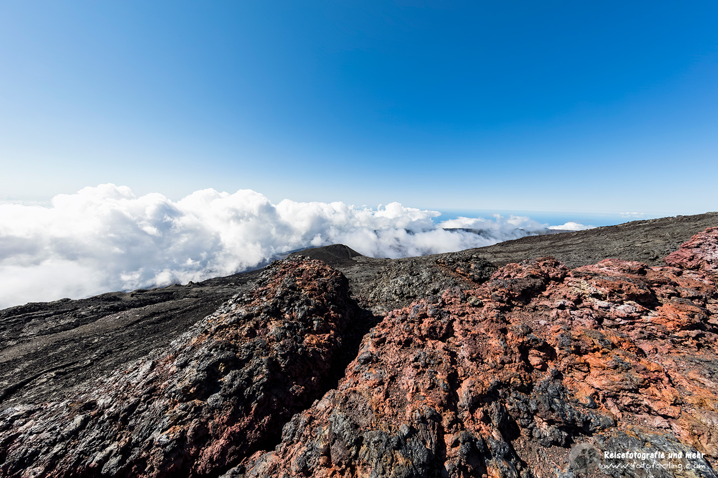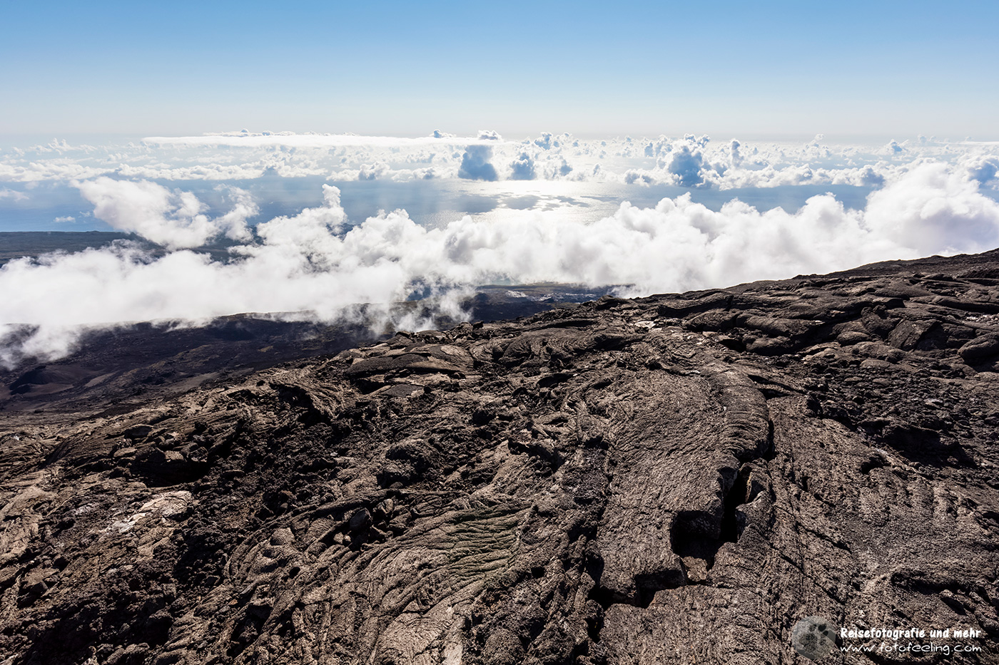 Immer, wenn wir dachten, jetzt haben wir es geschafft und sind bald oben, kam ein neuer Anstieg, doch die Aussicht auf die Vulkanlandschaft unter uns und dem wolkenverhangenem Meer vor uns wurde immer fantastischer. Es war irgendwie so unwirklich. Da liefen wir über die schwarze Lava und kämpften uns stetig bergauf und unter uns glitzerte das Meer, über dem unzählige Wolken weit unter uns auf ihren Auftritt warteten. Was für ein Gefühl!