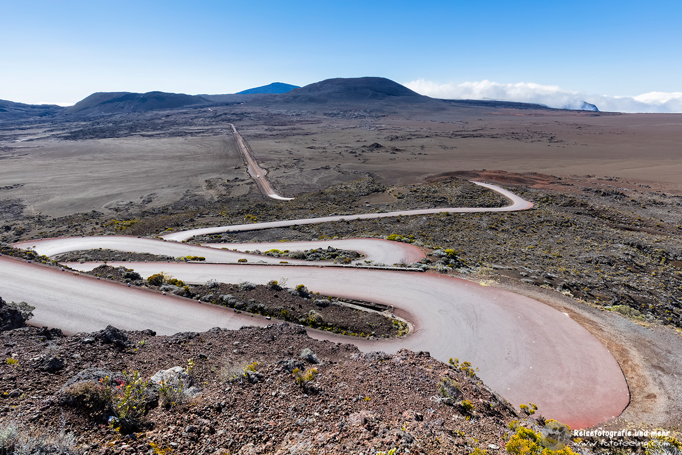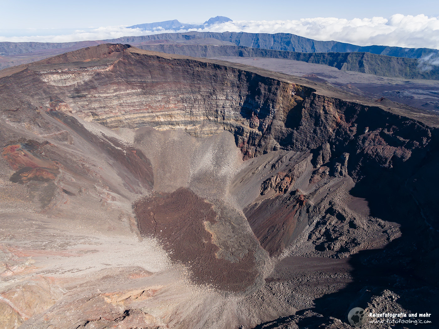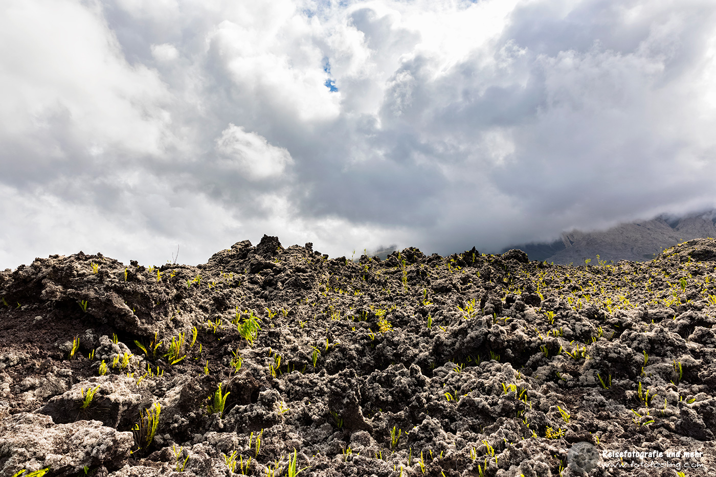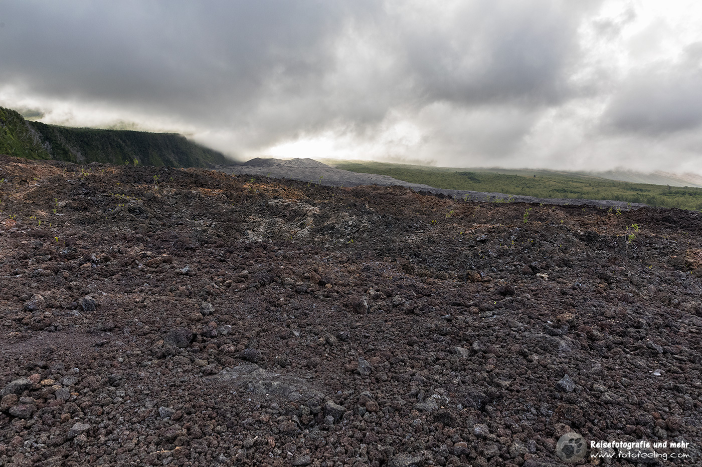 Unser erstes Ziel an diesem Morgen war der 2.632 m hohe Vulkan Piton de la Fournaise. Er entstand vor 380.000 Jahren an der Südseite des Piton des Neiges und ist auch heute noch einer der aktivsten Vulkane der Welt. Er gilt jedoch als vorhersehbar und daher relativ ungefährlich, denn die dünnflüssige Lava läuft ohne größere Gasexplosionen in Richtung Meer. Er ist ein Teil der "Inneren Zone" des 2007 gegründeten Nationalparks Réunion und gehört seit 2010 zum Weltnaturerbe der UNESCO.