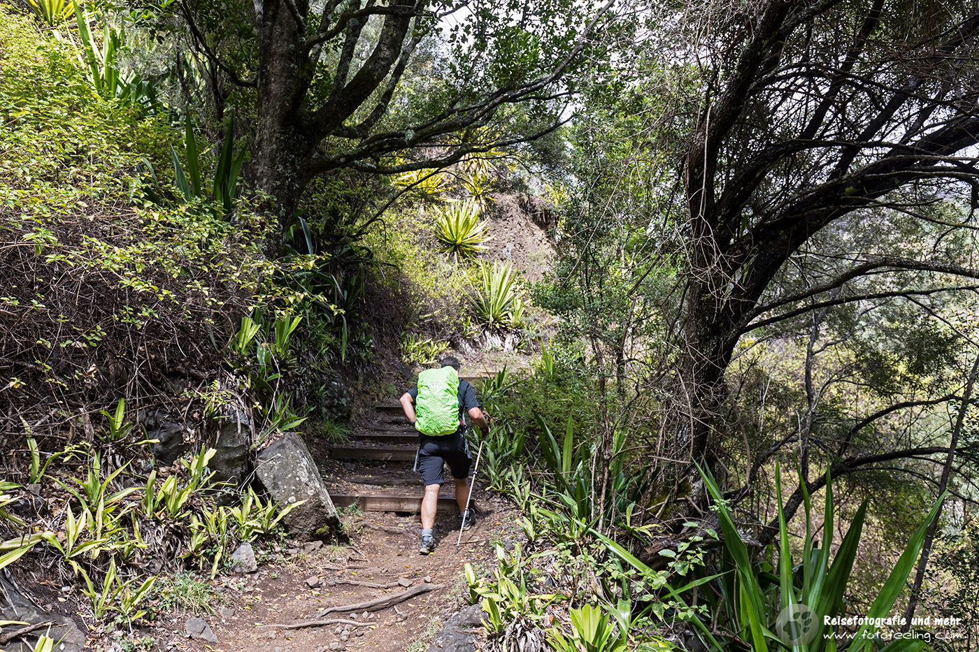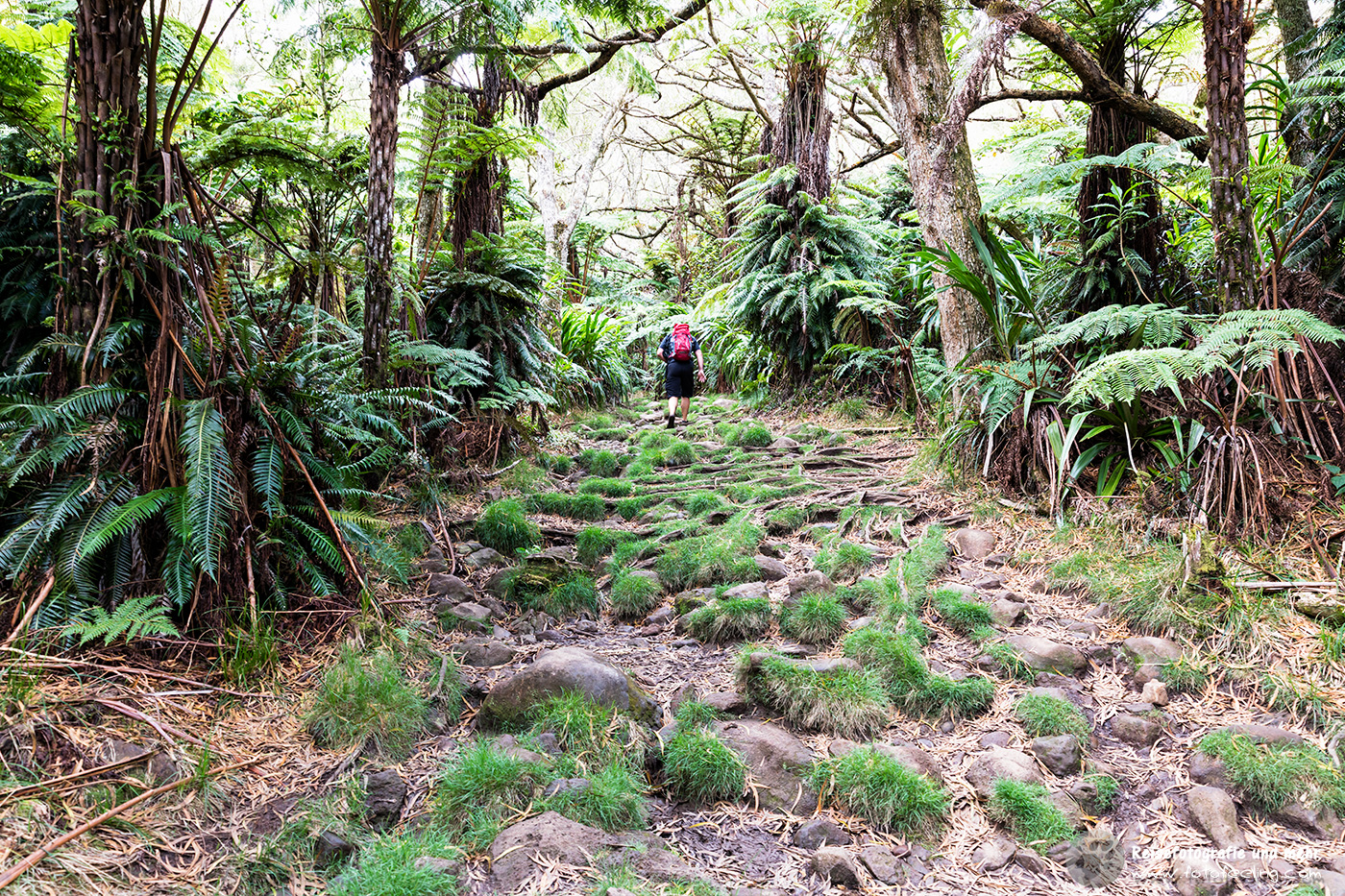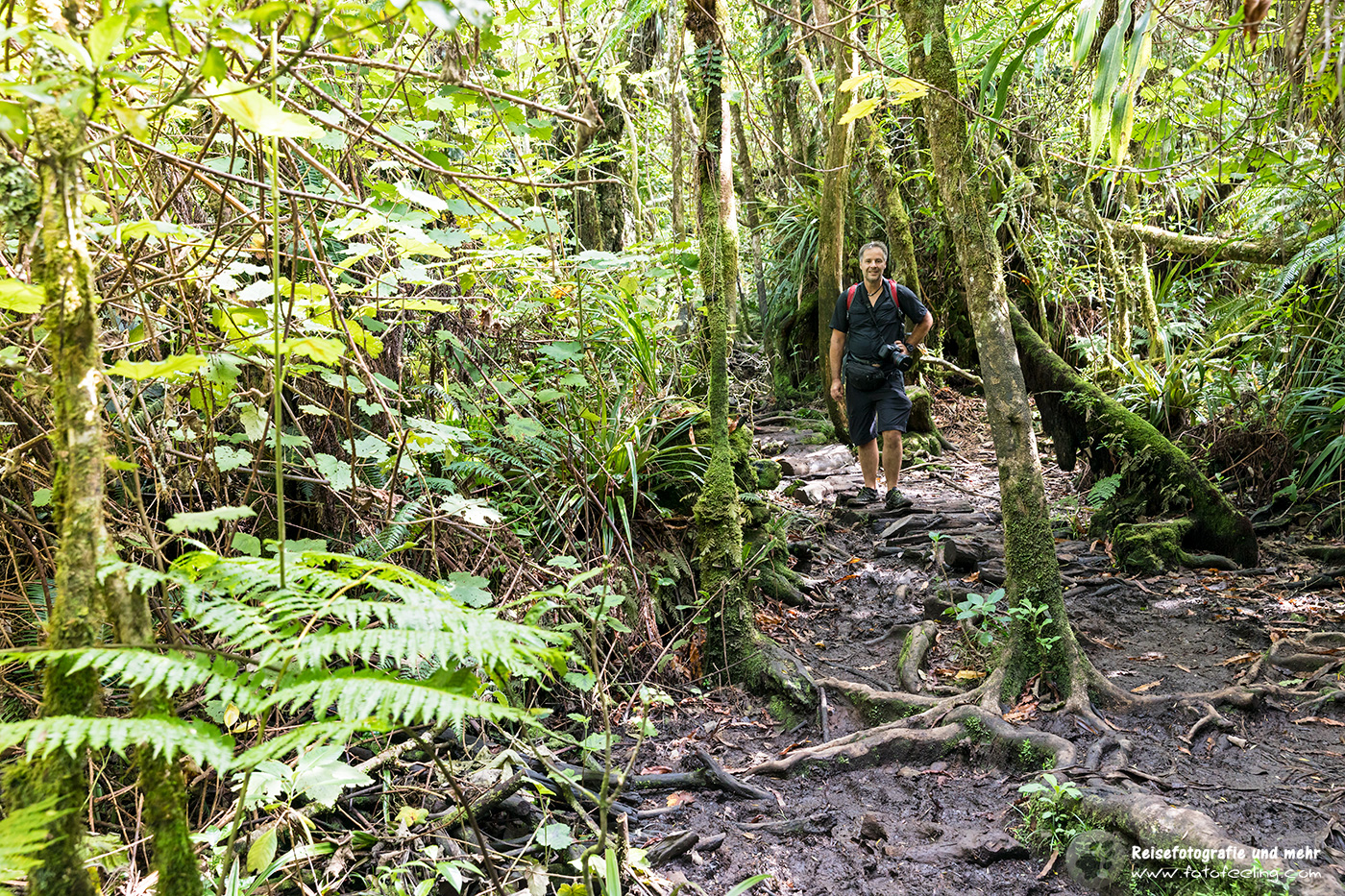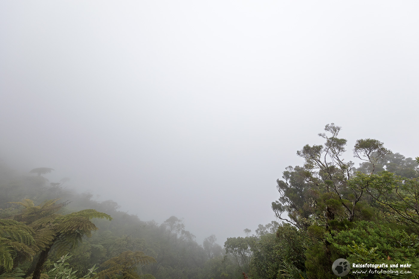 An der Straße D242 hielten wir uns links bis zu dem kleinen Einstieg kurz hinter der Brücke, wo es links hinab ging. Mist, hier wäre auch ein kleiner Parkplatz gewesen…. Wieder traten wir in eine wunderschöne Regenwaldlandschaft ein. Die Pflanzen waren noch feucht und überall tröpfelte es. Stetig ging es steil bergab und mir graute schon vor dem Rückweg. Dann nieselte es auch noch und der Weg wurde ziemlich rutschig. Zum Glück hatte ich meine Stöcke mitgenommen. Trotz der tiefen Wolken waren die Ausblicke einfach nur toll.