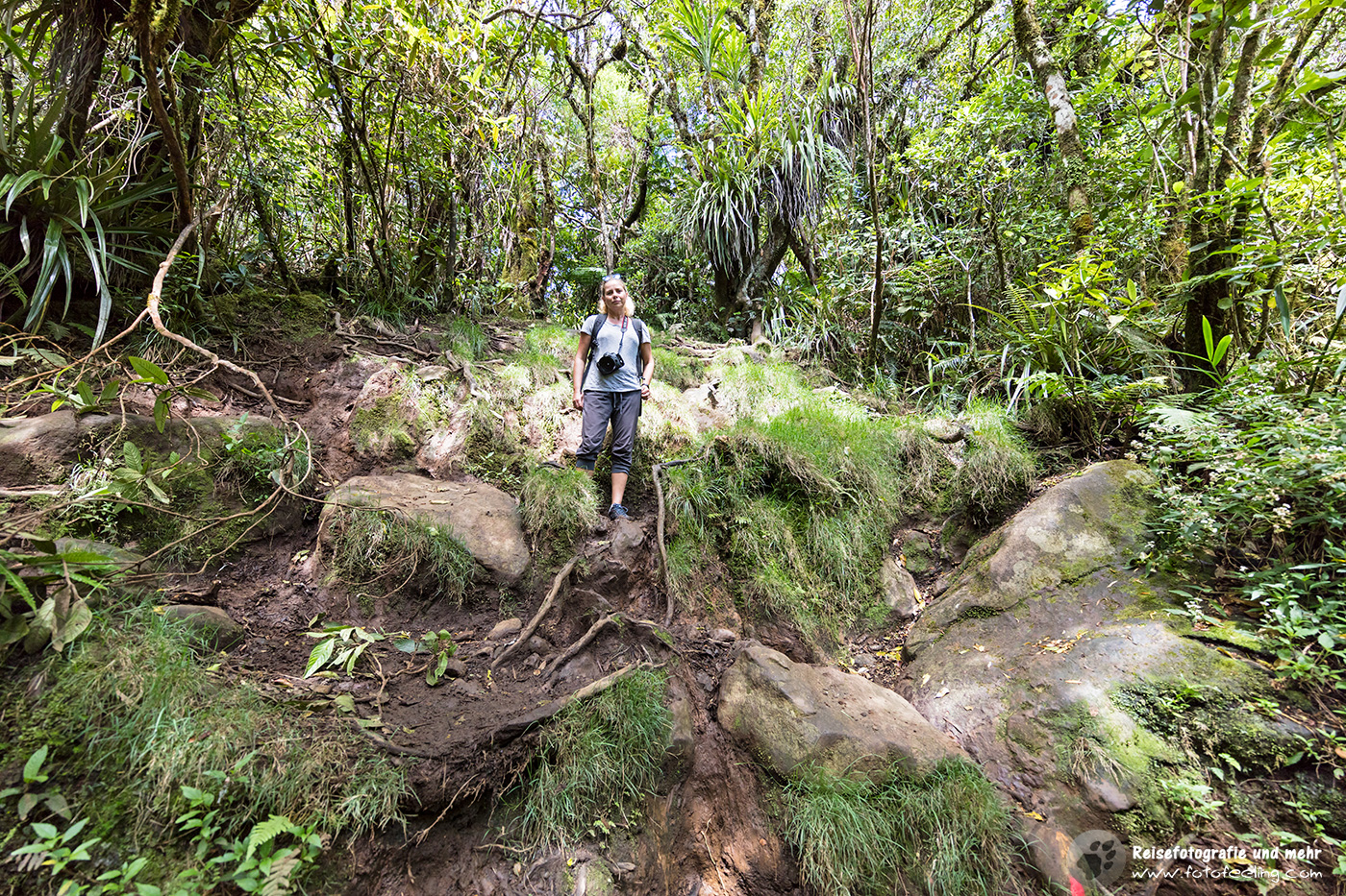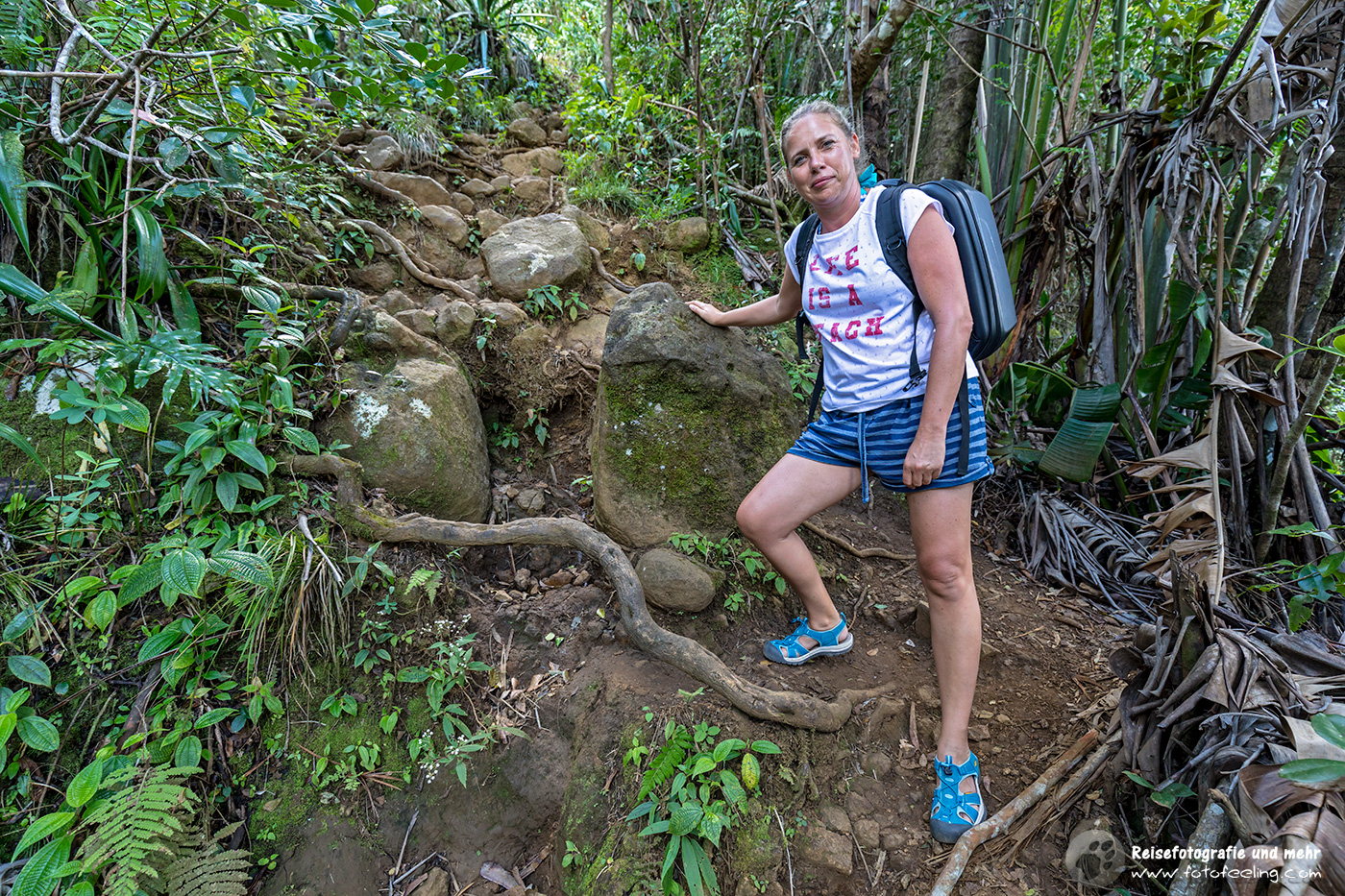 Eigentlich würde der Weg hier durch den Zulauf zum Bras Rouge weiter gehen, aber unser Ziel war aus Zeitgründen nur der Wasserfall. Also wendeten wir und begaben uns auf den schweißtreibenden Rückweg. Steil und rutschig ging es bergauf. Die Regenwolken hatten sich verzogen und die Sonne brannte gnadenlos vom Himmel, so dass wir sehr froh waren, dass der Weg größtenteils schattig war.