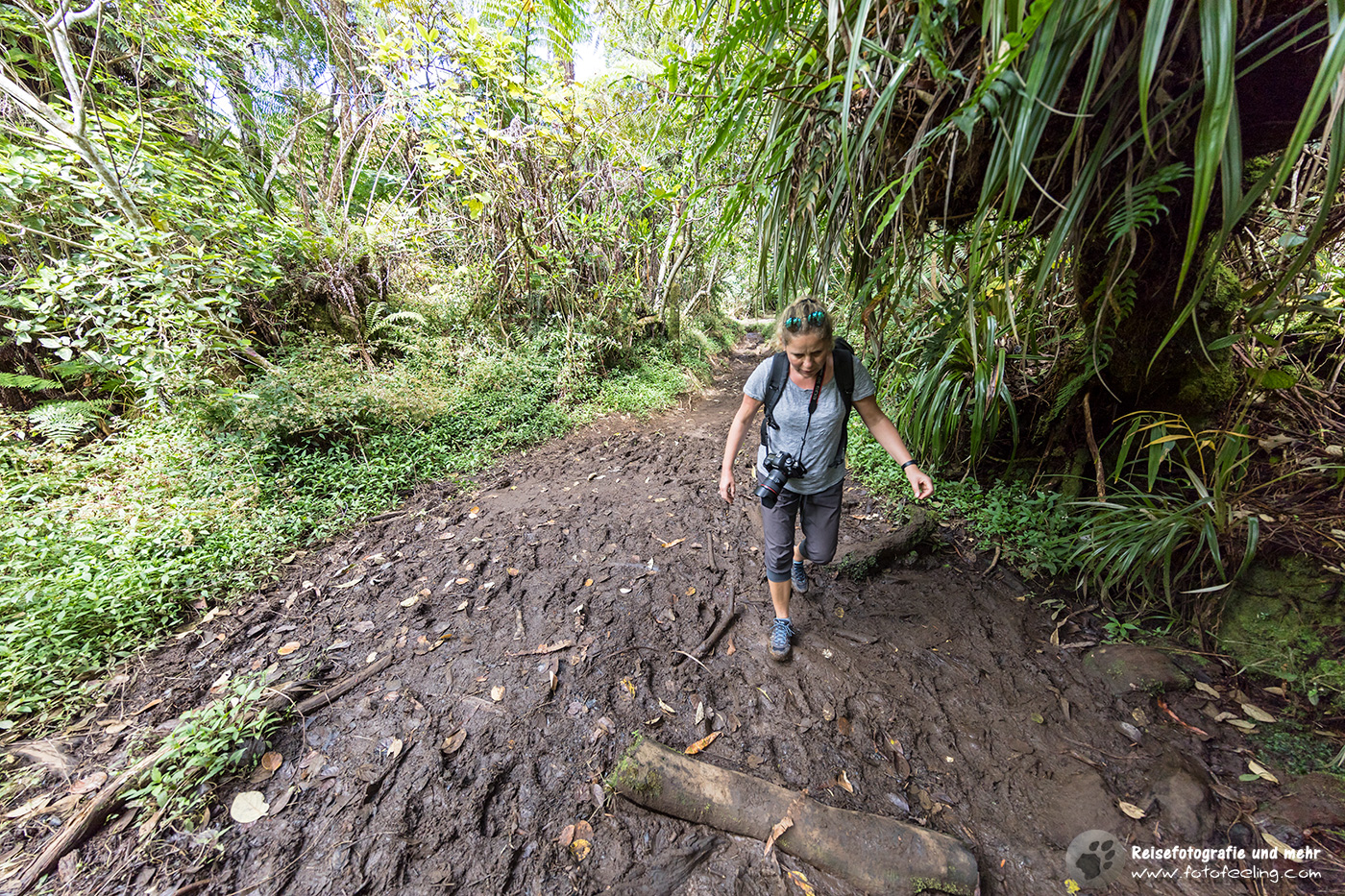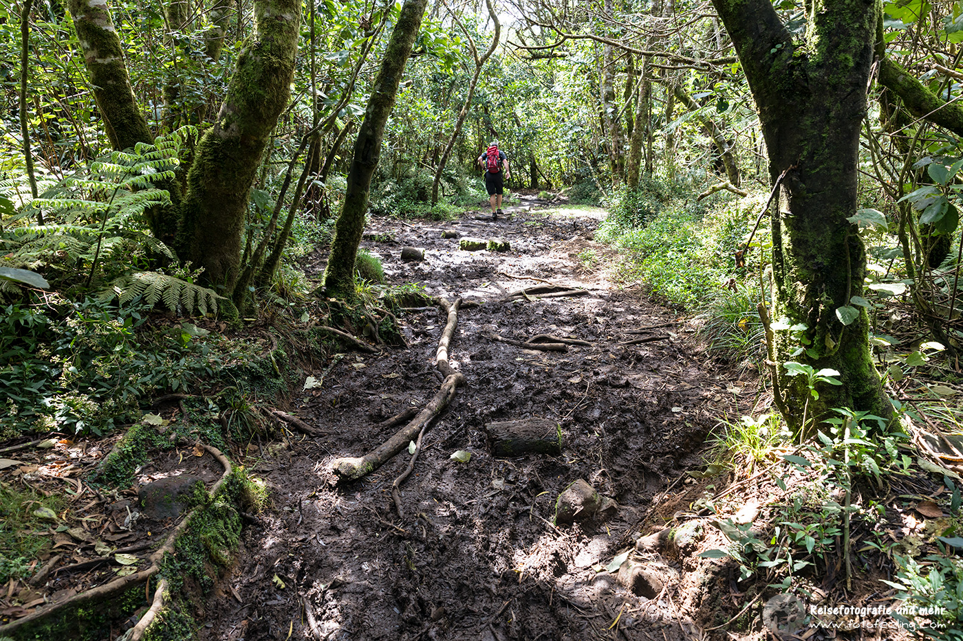 Man könnte fast sagen, dass wir an diesem Tag ausschliefen, denn wir frühstückten erst um 6.00 Uhr auf unserer Terrasse. Die Sonne schien und die Vögel zwitscherten. Fast keine Wolke war am Himmel. Schon um 7.00 Uhr waren wir unterwegs zum Trou de Fer. Bei diesem Wetter musste es einfach klappen! War es letztens viel zu schlecht, hatten wir an diesem Tag fast Bedenken, ob es vielleicht zu schön sei. Um ca. 9.00 Uhr waren wir am fast vollen Parkplatz. Die Fahrt war sehr verkehrsreich und kurvig gewesen, so dass wir nur langsam vorwärts gekommen sind. Vielleicht hätten wir doch eher losfahren sollen… Das würden wir uns an diesem Tag noch mehrmals wünschen! Frohen Mutes sprangen wir in unsere Wanderschuhe und los ging es. Der Weg bis zur Hütte Gîte de Bélouve war recht schön und wenig anstrengend. Danach führte uns der Sentier du Trou de Fer über viele Stufen bergab durch den dichten Regenwald, vorbei an wild wachsenden Tamarindenbäumen und vielen Sträuchern. Teilweise ging es über Holzplanken, die uns vor den schlammigen Urwaldböden schützen sollten und zum Glück anfangs immer dort waren, wo wir sie brauchten. Irgendwann teilte sich der Weg und da wir einen Rundweg machen wollten hielten wir uns links. Außerdem war der Pfad ca. 15 Minuten kürzer angegeben. Am Weg stand zwar ein Zettel, aber leider nur auf Französisch. Da frische Fußspuren in der matschigen Erde waren, machten wir uns keine weiteren Gedanken und wanderten weiter. Anfangs ging der Weg ja noch, aber je weiter wir ihm folgten, desto schlammiger und rutschiger wurde er. Ständig waren die Planken kaputt und wir mussten über glitschige Wurzeln und Steine balancieren. Ab und zu war der Boden so aufgeweicht, dass es zu einer Herausforderung wurde, im Matsch nicht stecken zu bleiben. Schon bald sahen wir ziemlich verdreckt aus, denn der Matsch landete unweigerlich an unseren Schuhen und spritzte uns bis an die Knie. Zum Glück kamen auch immer wieder ein paar trockene Abschnitte, die uns hoffen ließen, aber meistens dauerten sie nicht lange. Ab und zu kamen uns ein paar Wanderer entgegen, also war der Weg begehbar. Aber auch sie sahen total verdreckt aus. Zum Zurückgehen war es eh schon zu spät, denn wir waren viel zu weit vorwärts gekommen, also kämpften wir uns durch den Schlamm. Besonders heftig war noch einmal ein steiler Abstieg über Baumwurzeln, aber dann war es fast vollbracht.