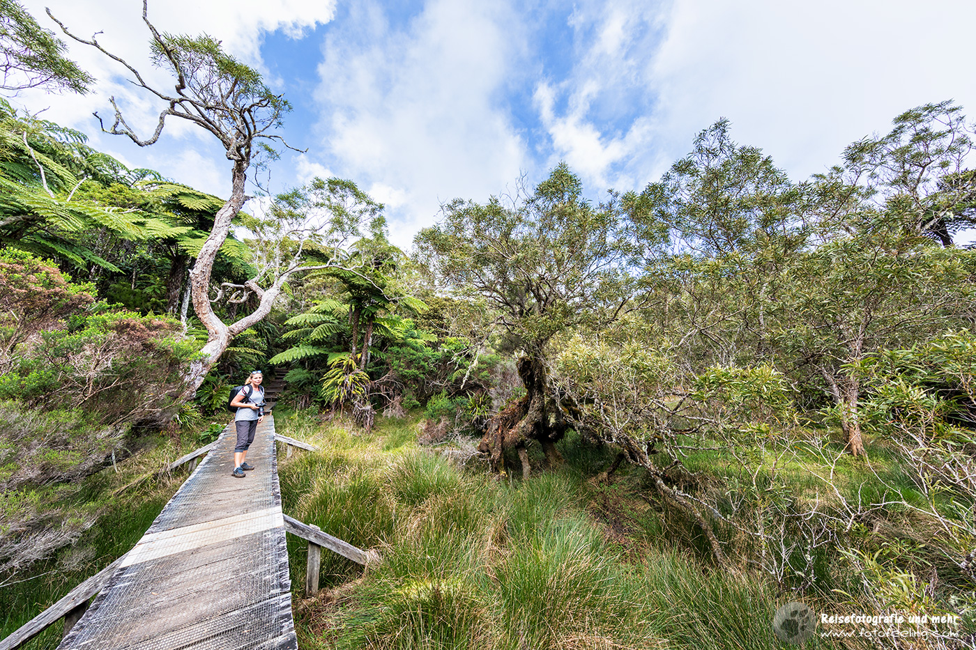 Völlig erleichtert erreichten wir den anderen Weg. Auch hier kamen uns Leute entgegen, aber im Gegensatz zu uns sahen sie sauber aus. Okay, das wird unser Rückweg werden, denn diesem Weg würde ich nur im äußersten Notfall wieder zurückgehen. Über einen Holzbohlenweg und vielen Treppen ging es steil bergab zur Aussichtsplattform des Trou de Fer. Noch ein kleines Stück, dann erreichen wir die Plattform, von wo aus man einen fabelhaften Blick in die Schlucht mit den tollen Wasserfällen hat. Wir konnten die Fälle schon rauschen hören. Nach den Strapazen des Weges freuten wir uns wie wild auf die Belohnung. Doch was war das?! Dichte Wolken türmten sich bis zur Plattform und darüber hinaus auf und blockierten die Sicht. Das konnte doch nicht wahr sein!!! Wir waren fassungslos. Wo kamen die bloß her, denn während der ganzen Wanderung hatten wir Sonnenschein und blauen Himmel. Wieder war alles umsonst und ein drittes Mal würden wir es auf dieser Reise wohl nicht mehr schaffen. Wir warteten zusammen mit etlichen anderen Touristen auf ein Wunder, aber nichts geschah. Was wir leider nicht wussten, aber vor Ort von einer Touristin hörten, war nämlich folgendes: Ab spätestens 9.30 - 10.00 Uhr erobern auch hier die Wolken die Schlucht und man sieht gar nichts mehr. Mist, das hatten wir nirgends gelesen und leider stand davon auch nichts im Wanderführer. Damit erübrigte sich ein weiteres Warten, denn es wurde nach der schweißtreibenden Wanderung inmitten der Wolkensuppe ganz schön kühl, zumal auch noch ein eisiger Wind durch die Schlucht bis zur Plattform pfiff. Leicht enttäuscht machten wir uns auf den Rückweg und blieben natürlich ohne zu zögern auf dem anderen Weg. Je weiter wir uns von der Schlucht entfernten, desto schöner wurde das Wetter. Fast der ganze Weg war gut und führte anfangs über Holzplanken. Später ging der Weg zwar in Schotter über, aber blieb bis auf ein paar kleine Stellen trocken, so dass wir wohlbehalten am Auto ankamen. Dieser Pfad vorbei am Sumpfgebiet des Grand Mare gefiel uns deutlich besser. Wobei der andere kürzere Weg bei Trockenheit auch sehr abwechslungsreich wäre. Bei nassem schlammigem Wetter, war er jedoch die deutlich schlechtere Wahl.