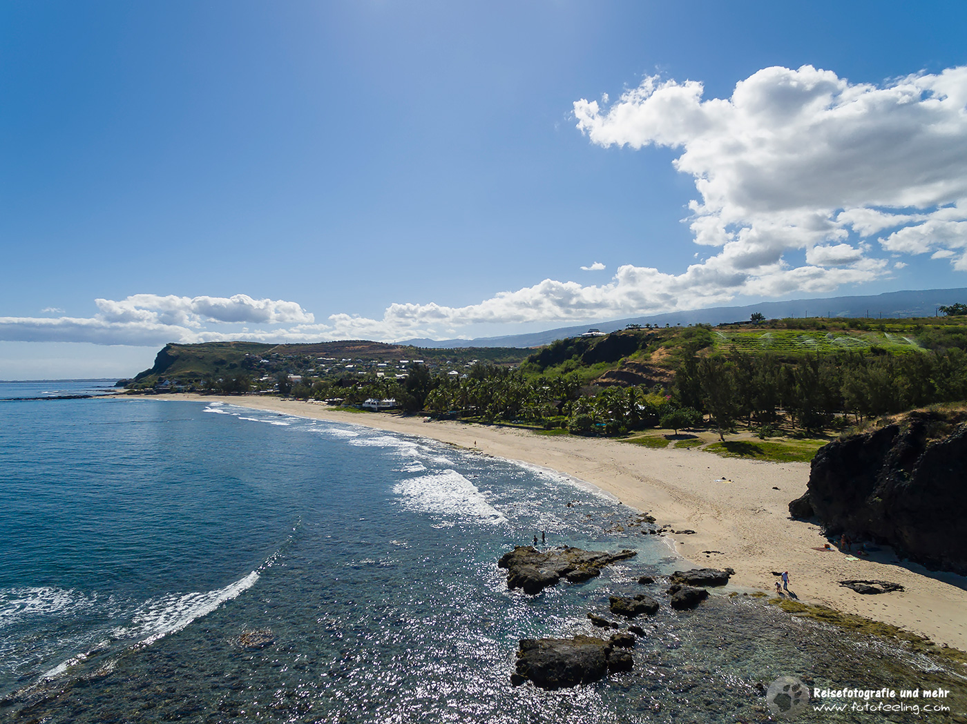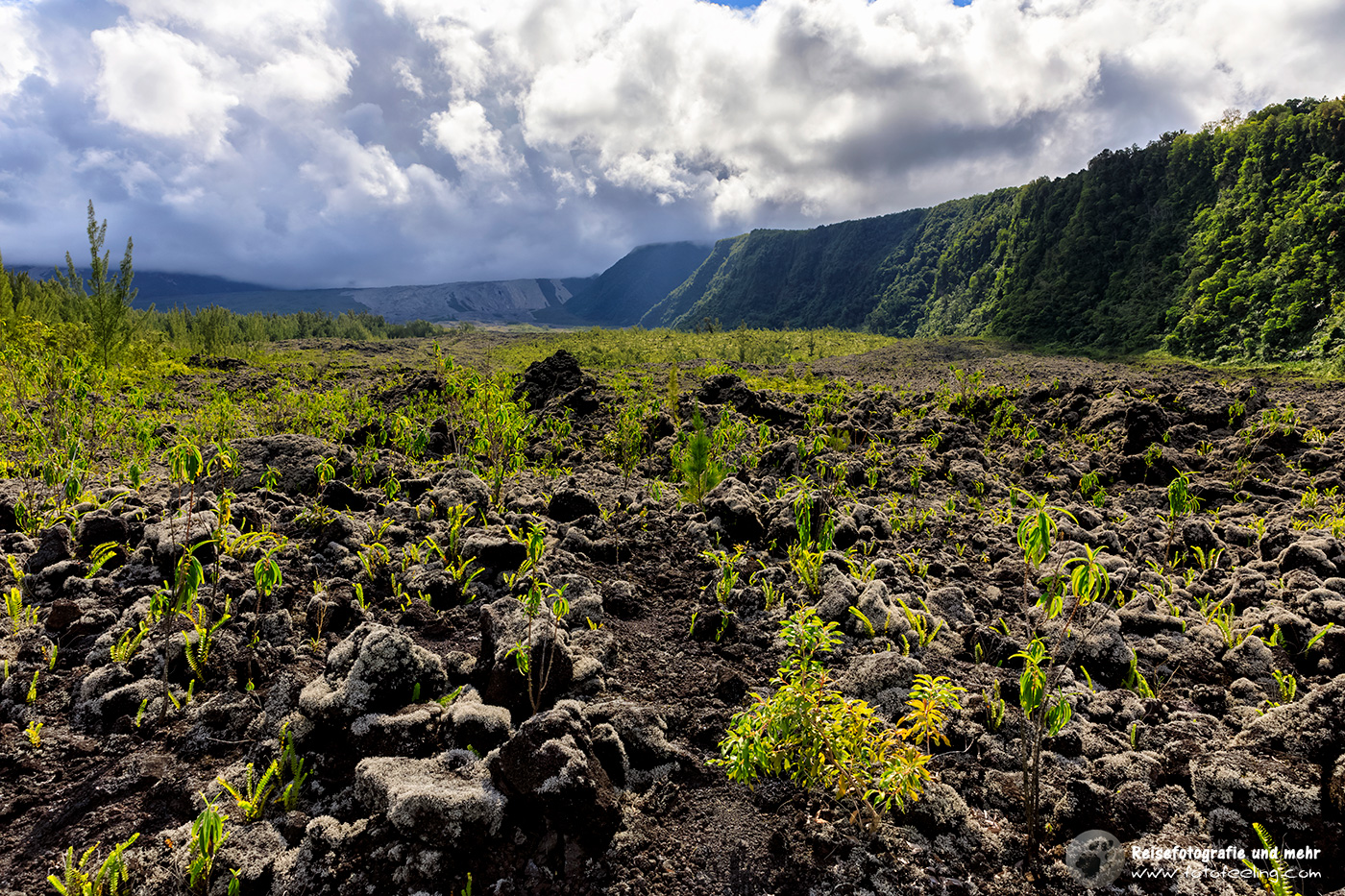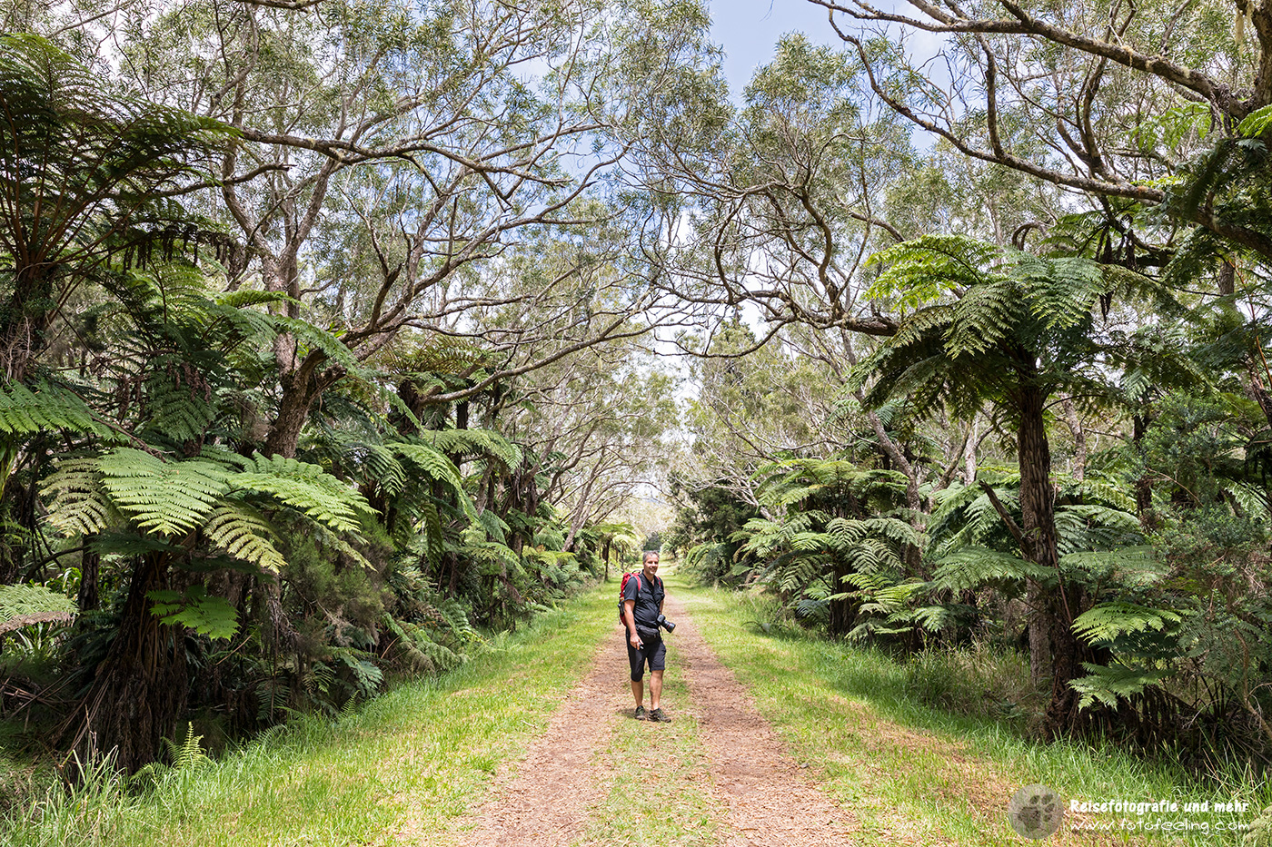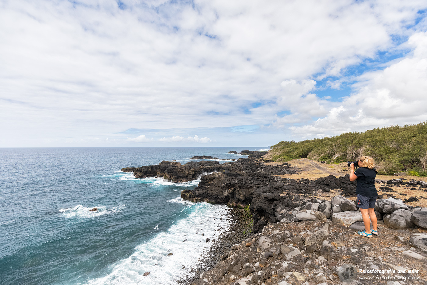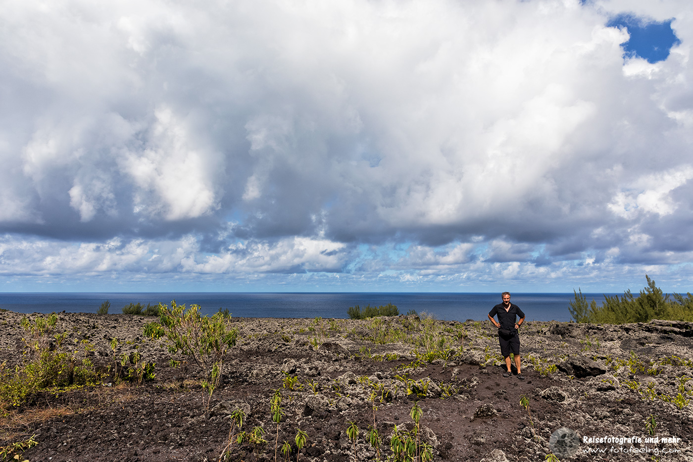 Am Anse des Cascades in der Nähe des Ortes Piton Sainte-Rose machen wir einen Stopp. Hier fallen einige Wasserfälle von den Steilwänden in die Bucht am Meer. Es wuchsen viele Palmen auf einer großen Wiese und luden bei schönstem Wetter zum Picknick ein. Wir schauten uns alles an und liefen auf dem Sentier des Pêcheurs (Pfad der Fischer) ein wenig die Küste entlang. Hier ging es wieder über unebenes Lavagestein aus dem Schraubenbäume wuchsen und etwas Schatten spendeten. Die Küste war wild und Wellen rauschten ungebremst an Land. Ein toller Anblick, aber für heute waren wir genug gewandert, also drehten wir um und gingen zum Auto zurück. Wir fuhren die tolle Straße entlang der Lavafelder, wo man das unterschiedliche Alter der Lava anhand des Bewuchses sehen konnte. Leider hatte sich die Sonne hinter dichten Wolken versteckt, aber es war trotzdem ein toller Anblick.