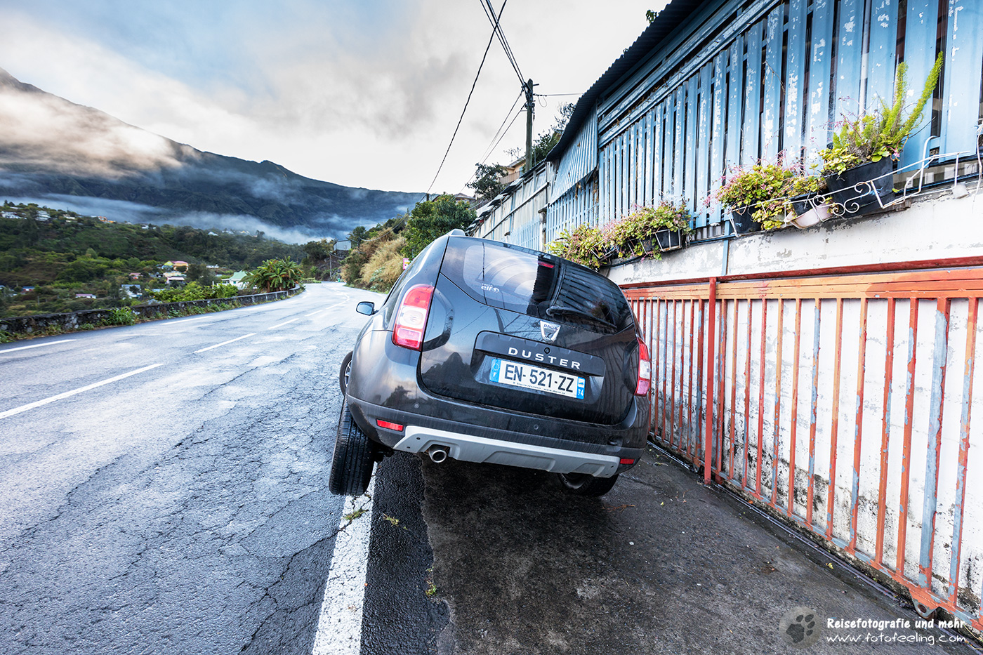 Das Wetter war zwar nicht so optimal, denn es hatte viele Wolken, die recht tief hingen und schon am Morgen bis zum Meer reichten, doch wir wollten unbedingt die RN5 fahren, die als kurven- und tunnelreich bekannt ist. Die Straße wurde 1938 eröffnet, sie führt durch eine gut 30 km lange Bergschlucht (Bras de Cilaos) und besteht aus 420 Kurven und Kehren. So ging es durch dichte Wolken mit stellenweise fast keiner Sicht. Wir schraubten uns in Serpentinen in die Höhe und Chris musste oft ganz schön am Lenkrad kurbeln. Zum Glück waren wir ja hier auf Réunion schon einiges gewohnt und hatten auch auf den einspurigen Stücken keine Hemmung zu Hupen, denn das hatten wir schon in Peru hinter uns gelassen…. So früh am Morgen war uns jedoch das Glück hold und niemand kam uns entgegen. Auch die drei Tunnel waren wirklich interessant, denn wir passten zwar gut hindurch, aber die LKWs und Busse mussten schon etwas den Bauch einziehen. Je höher wir kamen, desto dünner wurden die Wolken. Ab und zu war sogar blauer Himmel zu erkennen und ein erstes Licht fiel auf die Bergspitzen. Irgendwann waren wir dann über den Wolken im schönsten Sonnenschein. Wir kamen durch hübsche Bergdörfer. Rings um uns herum waren die Gipfel der hohen Berge an denen Wolkenfetzen hingen. Ein wirklich zauberhafter Anblick. An einer besonders schönen Aussicht lenkte Chris den Duster auf eine kleine Hauseinfahrt an den Straßenrand und wir machten ein paar Bilder und betrachteten verzückt die wunderbare Berglandschaft um uns herum. Als wir weiterfahren wollten, fuhr Chris etwas vor, als es auf einmal krachte und wir total schief standen. Irritiert verließen wir das Auto. Was war denn das? Ach nein, das konnte doch nicht wahr sein. Durch das meterhohe Gestrüpp am Straßenrand hatten wir nicht gesehen, dass es hier tief in einen Graben hinab ging und so hing unser Auto mit einem Reifen in dem Graben und hinten mit einem Reifen in der Luft. Oh je, was sollen wir denn jetzt machen, fragten wir uns. Natürlich sprachen wir noch immer kein Wort Französisch… Wimg src="/render/w320-c3:2/filepath/ährend wir noch überlegten, hielt ein Auto und ein sehr hilfsbereites Paar stieg aus. Mit Händen und Füßen konnten wir uns etwas verständigen und der Mann deutete uns, dass wir warten sollen. Er rief etwas nach unten in das Tal und kam kurz darauf mit einem weiteren Mann zurück. Jetzt versuchten sie das Auto vorne hoch zu heben, was nicht gelang, aber dann hatten sie die Idee, sich hinten auf das Auto zu stellen und Chris sollte rückwärtsfahren. Das klappte und wie durch ein Wunder war unser Auto wieder frei und es war gar nichts passiert. Nicht einmal ein kleiner Kratzer war zu sehen. Sehr erleichtert bedanken wir uns bei den freiwilligen Helfern, die genauso strahlten wie wir und machten uns wieder auf den Weg.