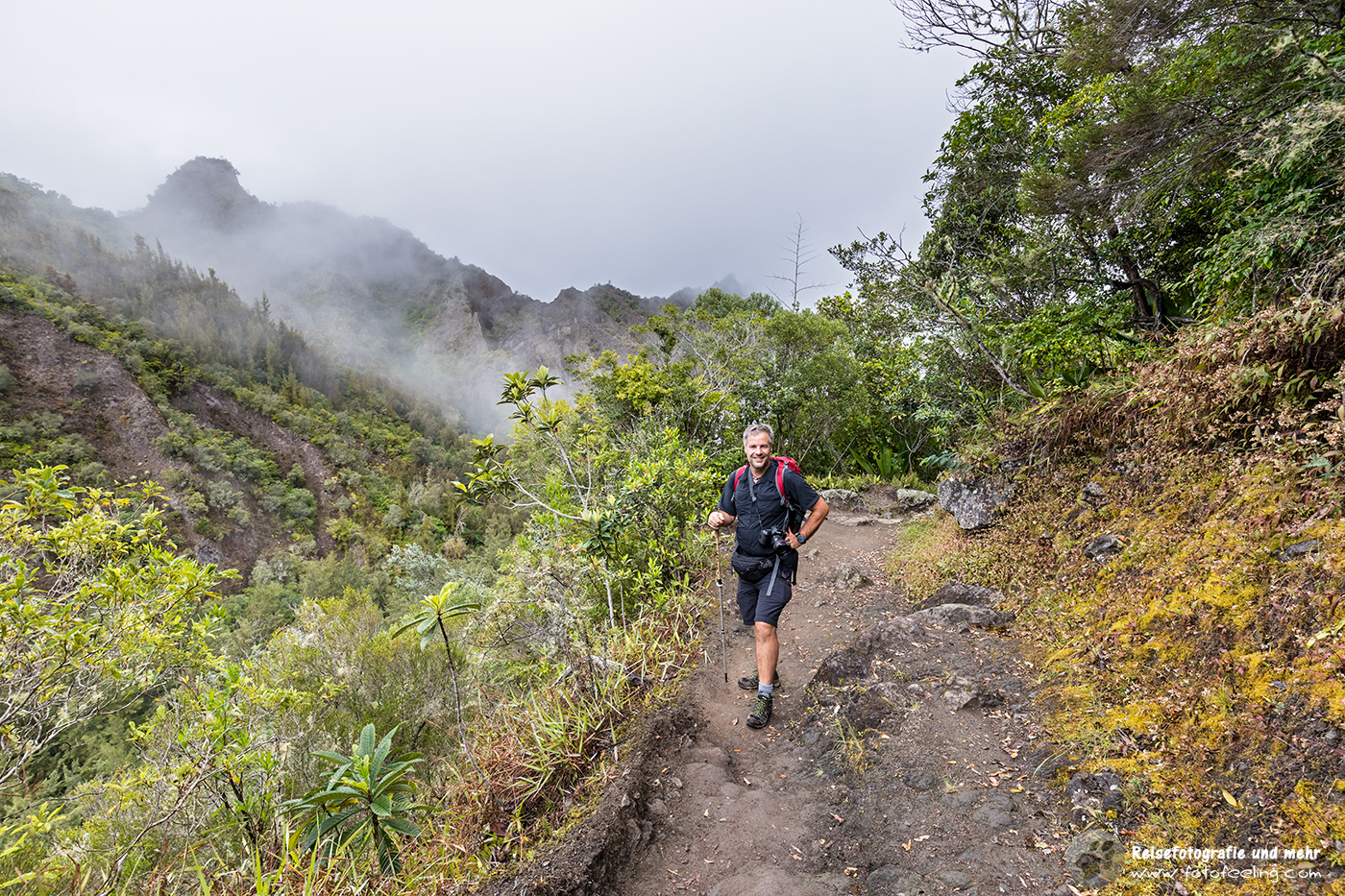 Schon um 4.30 Uhr quälten wir uns aus unserem Bett, denn heute wollten wir eine Wanderung zu der bekannten kesselartige Schlucht Trou de Fer machen. Diese Schlucht ist ein Highlight der Insel, denn hier stürzen von sechs verschiedenen Seiten Wasserfälle 250 - 300 m tief in das Trou de Fer und sollen dabei ein atemberaubendes Dröhnen erzeugen. Wieder ließen wir uns durch unser Navi leiten, als ob wir am Vortag noch nicht genug Kurven gefahren wären. Hinzu kam noch, dass Chris sich mit dem Weg nicht sicher war, den sein Navi ihm vorschlug und so sollte ich noch in Maps Me schauen und ihm den Weg bestätigen, was ich auch tat, bis es einfach nicht mehr ging und ich mich fast übergeben musste. Von da an konnte ich nur noch geradeaus schauen und hatte mit meinem Magen zu kämpfen. Hinzu kam auch noch, dass das Wetter immer schlechter wurde und die Wolken immer tiefer sanken, so dass wir bald schon im dichten Nebel mit Sprühregen unterwegs waren. Kurz vor dem Ziel brachen wir schweren Herzens diese sinnlose Unternehmung ab und fuhren zurück in Richtung Saint Leu. Okay, was tun mit dem angebrochenen Tag. Wir beschlossen den Piton Maïdo, ein 2.204 m hoher Berg, den man befahren kann, zu erkunden. Denn hier war das Wetter viel besser und von oben soll man eine fantastische Aussicht auf die Bergdörfer im Talkkessel von Mafate (Cirque de Mafate) haben und auch weit über das Meer schauen können.