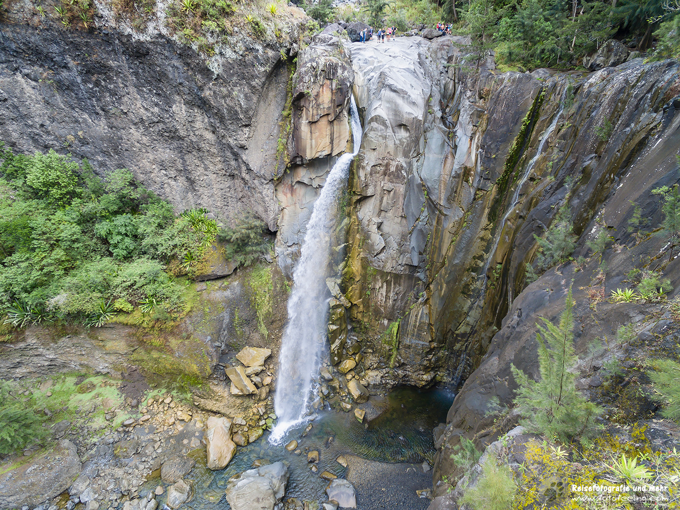 Unten angekommen standen wir an der Abbruchkante des Wasserfalls. Leider konnten wir kaum etwas von dem stattlichen Wasserfall sehen, denn die Steine waren rutschig und somit hielten wir uns von der Kante fern. Doch wir hatten ja den Kopter dabei und Chris machte ein paar tolle Bilder. So konnten wir und auch die anderen Wanderer, die sich hier eingefunden hatten, den Wasserfall und die schöne Schlucht aus sicherem Abstand betrachten.