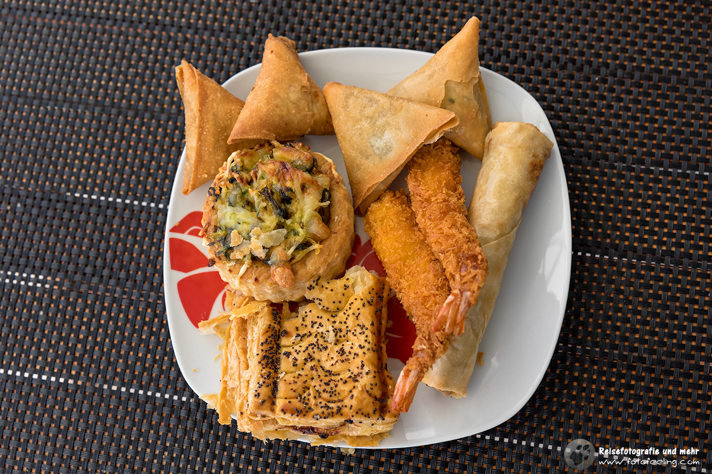 Wir fuhren für eine kurze Mittagspause zurück ins Kaz Ocean. Dafür hatten wir uns von unserem Supermarkt eine Auswahl an frischen Samosa mitgenommen. Yves überraschte uns mit einer kleinen Rumverkostung seines selbst hergestellten Rum-Likörs, der super schmeckte.