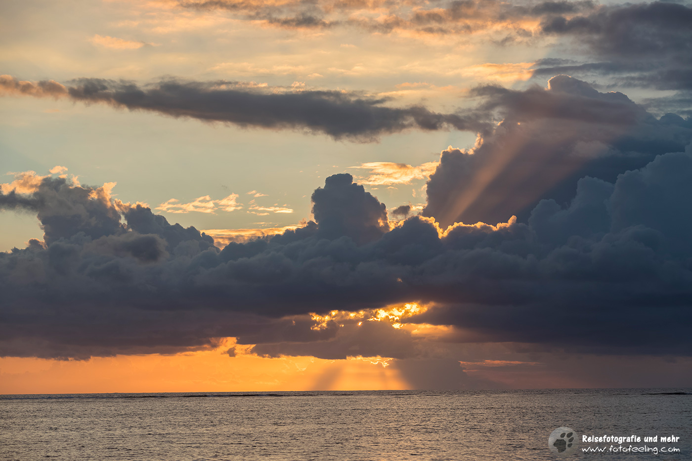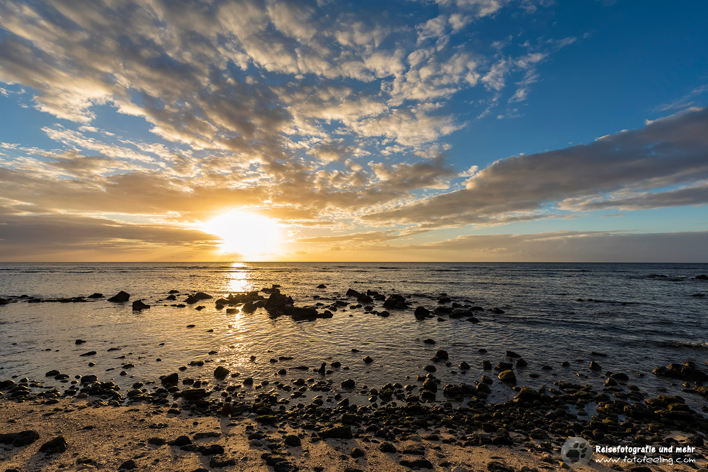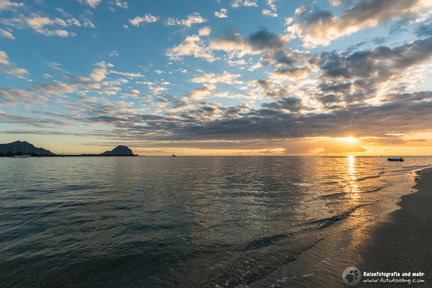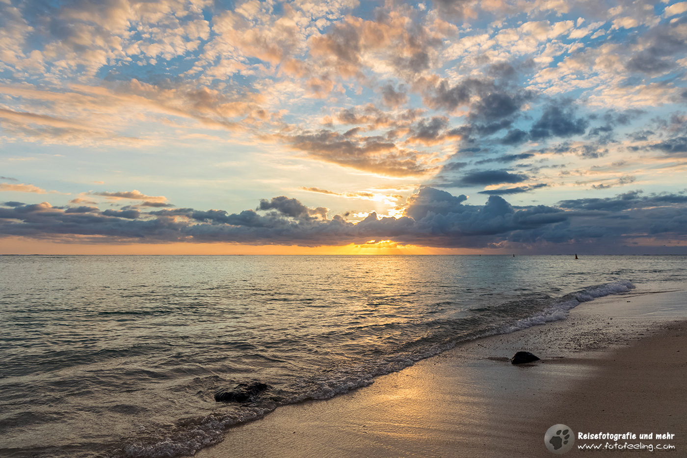Leider zog es wieder etwas mehr zu, aber zum Sonnenuntergang, den wir am linken Strand, dem Pointe aux Piments Public Beach, verbrachten, kam sie wieder raus und versank doch tatsächlich einmal nicht in den Wolken, sondern im Meer. Wie schön! An diesem Sonntag waren hier viele Einheimische und laute Reggaemusik schallte den Strand entlang. Das war so richtig Urlaubsfeeling und wir saßen glücklich und zufrieden am Strand und schauten den Wellen zu, während wir im Takt mit den Füßen wackelten.