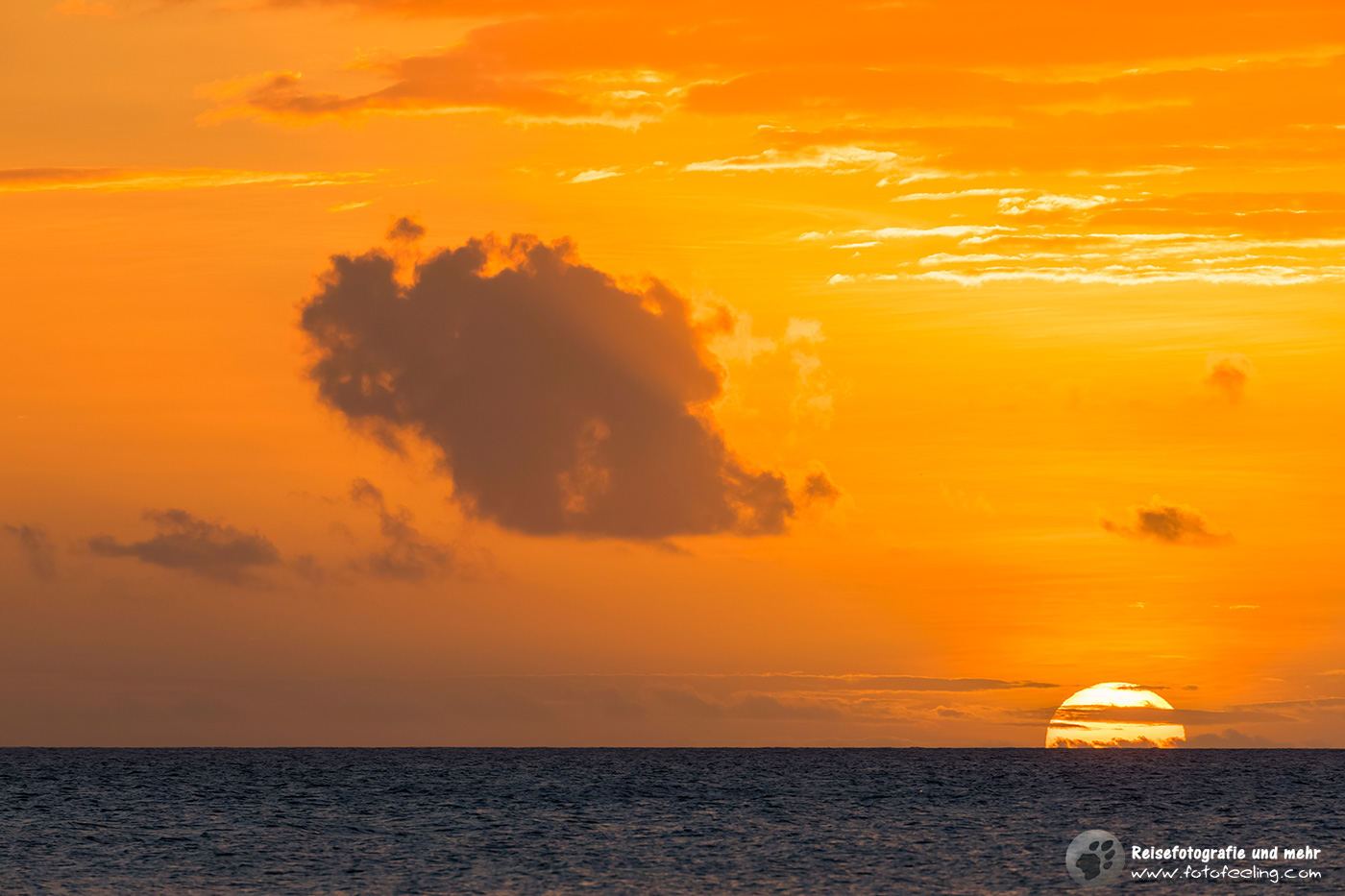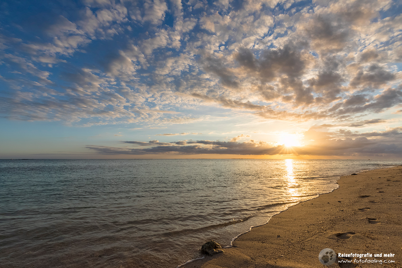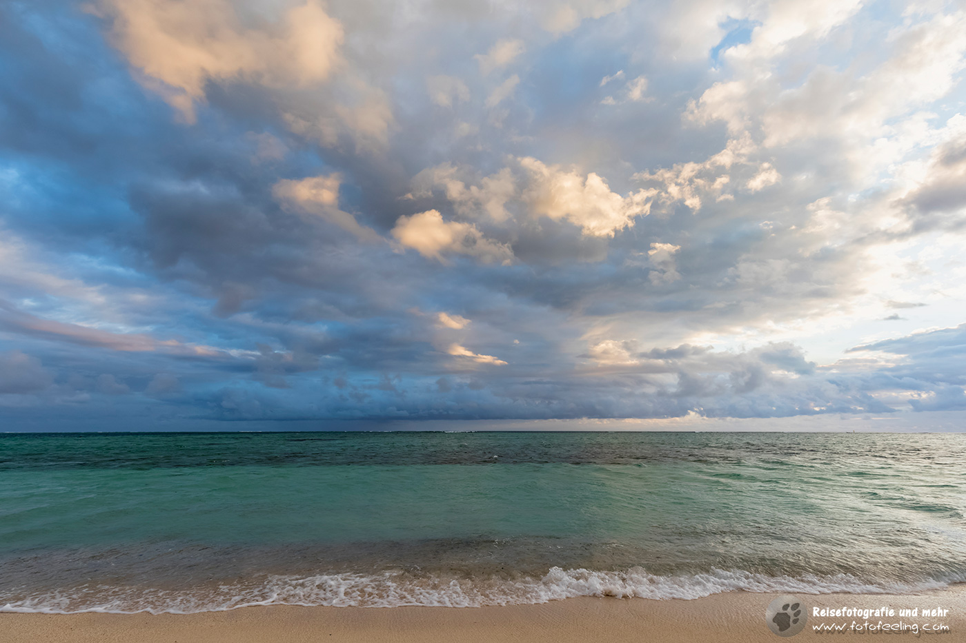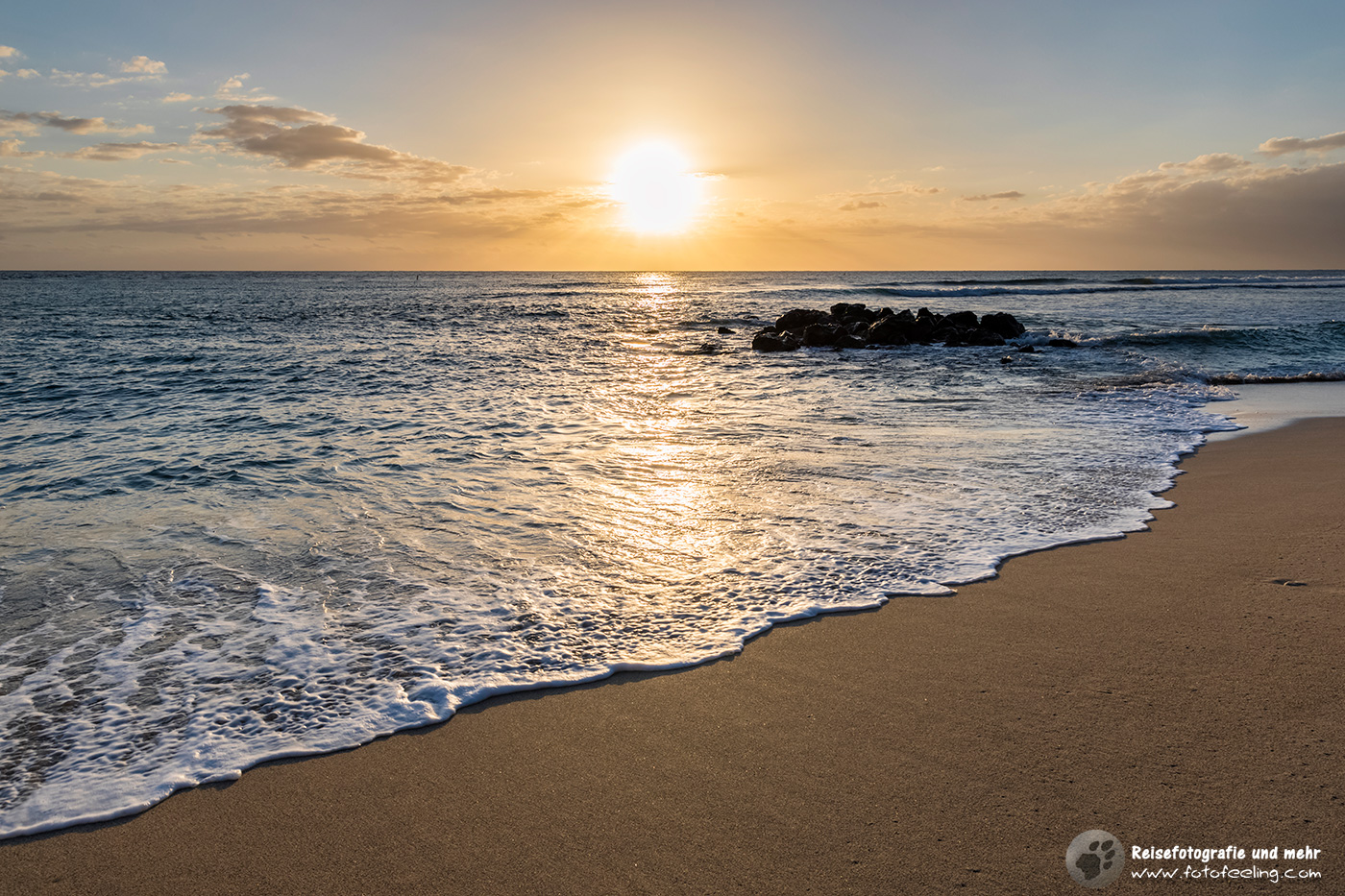 Leider zog es wieder etwas mehr zu, aber zum Sonnenuntergang, den wir am linken Strand, dem Pointe aux Piments Public Beach, verbrachten, kam sie wieder raus und versank doch tatsächlich einmal nicht in den Wolken, sondern im Meer. Wie schön! An diesem Sonntag waren hier viele Einheimische und laute Reggaemusik schallte den Strand entlang. Das war so richtig Urlaubsfeeling und wir saßen glücklich und zufrieden am Strand und schauten den Wellen zu, während wir im Takt mit den Füßen wackelten.