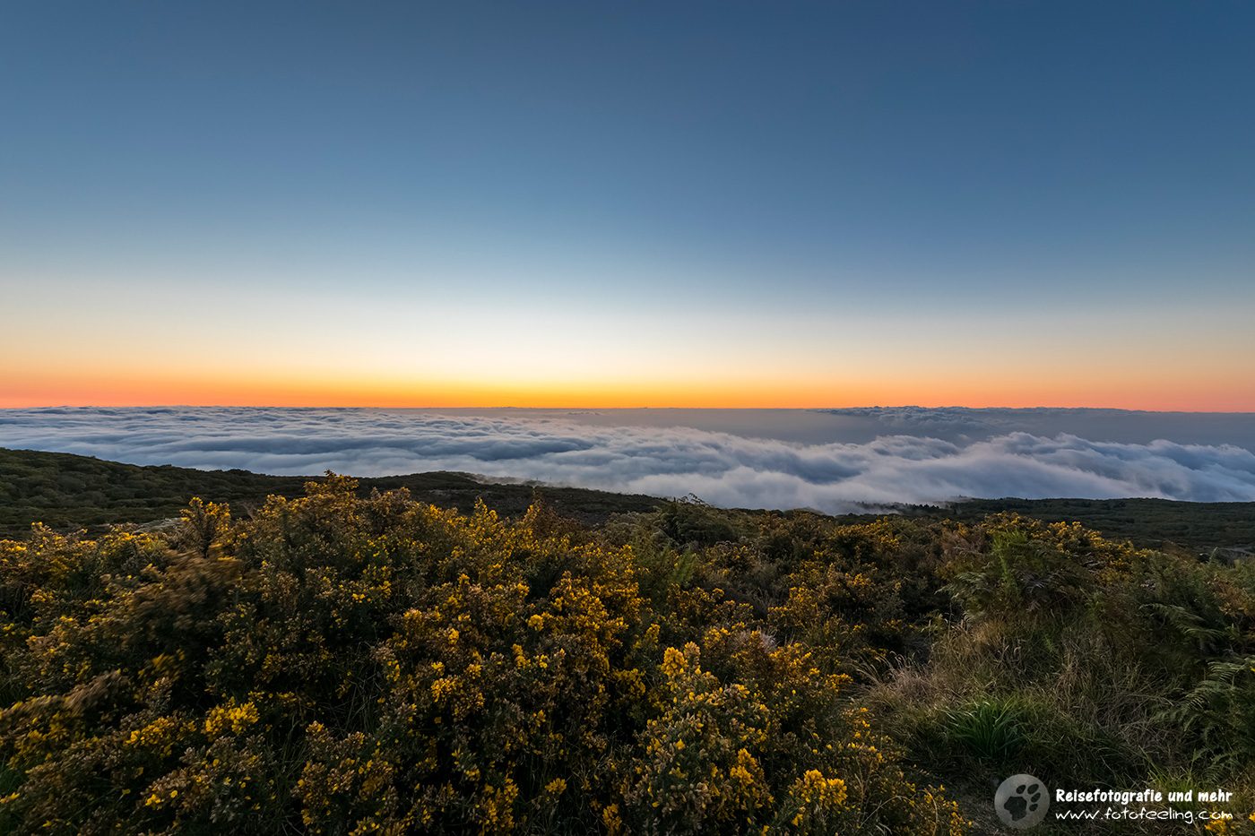 Chris ließ wieder den Kopter fliegen und mit einer Kamera machten wir Timelapse Aufnahmen. Es war einfach nur perfekt. Das Licht wurde immer schöner und wir verbrachten hier den Sonnenuntergang und den Mondaufgang, der langsam hinter den Bergen über dem Tal emporstieg. Auf der anderen Seite ging golden die Sonne in den Wolken unter und beleuchtete den Ginster und die Büsche auf den Felsen vor uns. Was für ein fantastischer Anblick.
