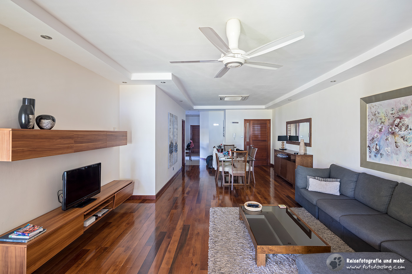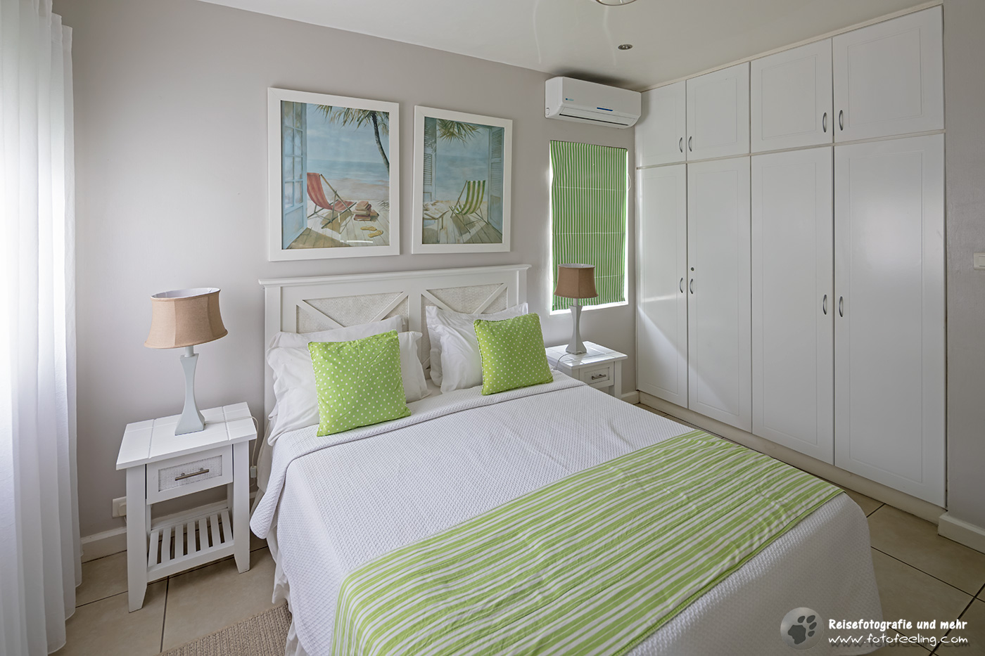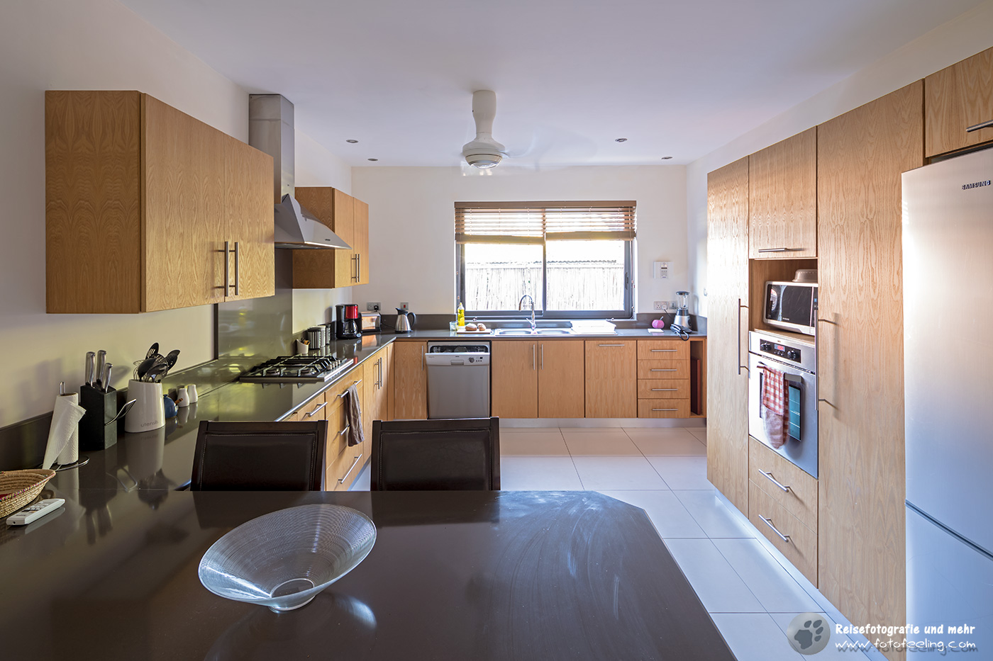 Die Apartmentanlage liegt direkt am Meer, das man über einen gepflegten Garten und einen tollen Pool erreicht. Sie ist mit Zäunen umgeben und im sommerlichen Weiß gehalten. Die Häuser sind zweigeschossig und unser Apartment lag im zweiten Stock. Die Wohnung war wirklich toll, aber durch unsere Wohnung im Olana waren wir einfach verwöhnt und wurden hier nie so richtig warm. Alles war perfekt und doch irgendwie zu steril. Die Möbel waren alle weiß und Meerbilder bzw. Muscheln hingen an den Wänden. Der Balkon war mit einer extra Glasfront versehen, die immer geschlossen sein sollte, wenn wir nicht da sind. Dahinter war eine schöne Sitzecke mit Küche, in der alles zu finden war, außer Eierbecher. Die Wohnung gehört einem Eigentümer, der sie vermietet und sie in seinen Ferien selbst nutzt. Dadurch waren einige Schränke verschlossen, aber es war genug Platz für unsere Sachen vorhanden. Sogar der Kühlschrank war gefüllt mit einer Willkommensmahlzeit und trotzdem irgendwas fehlte uns, um uns so richtig wohl zu fühlen.