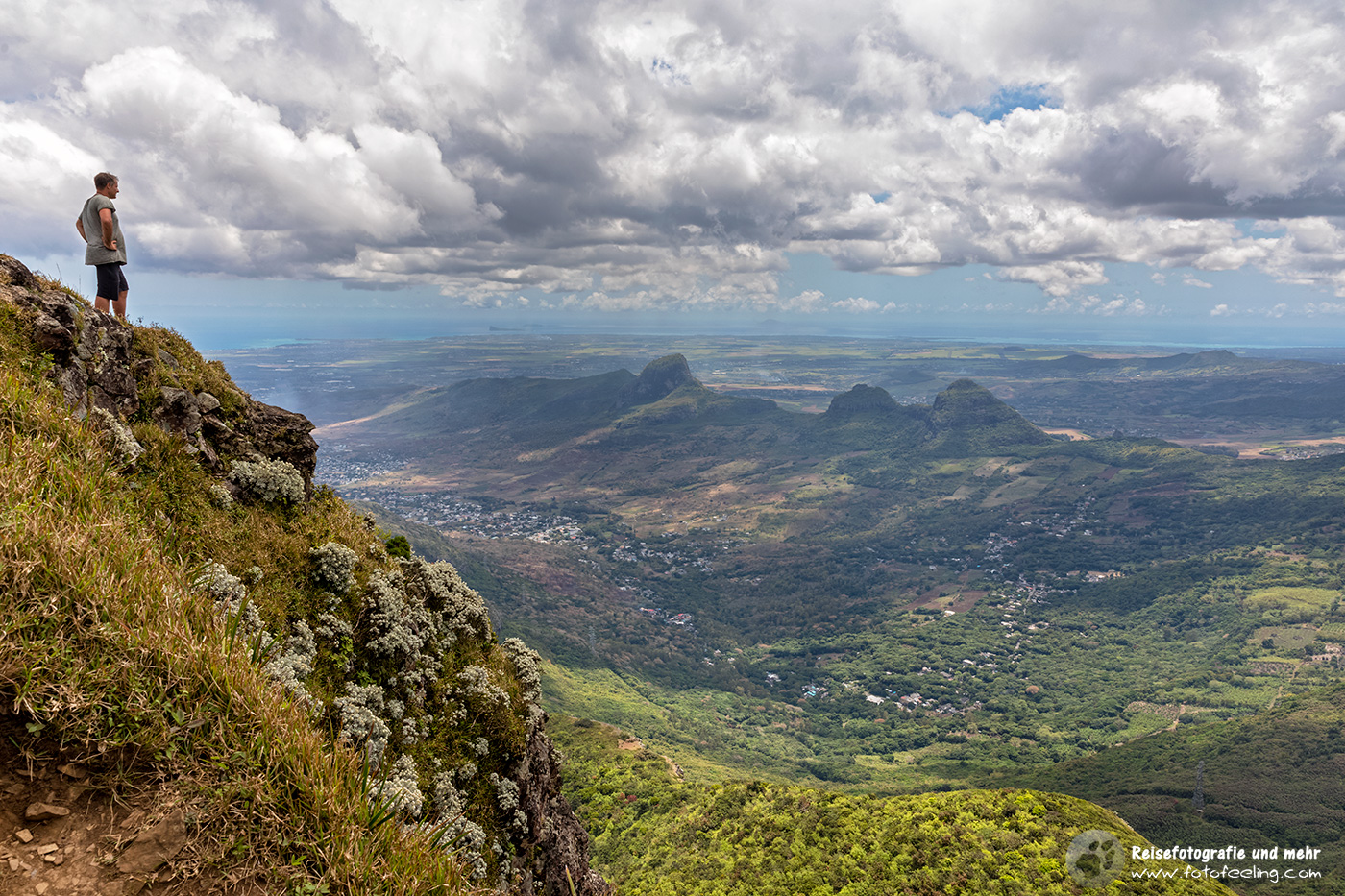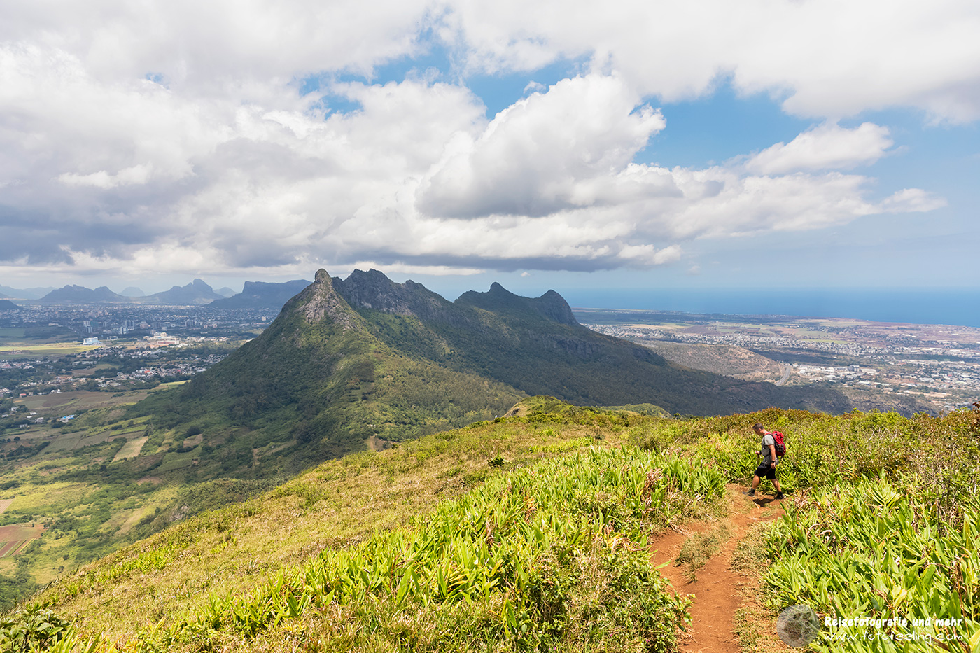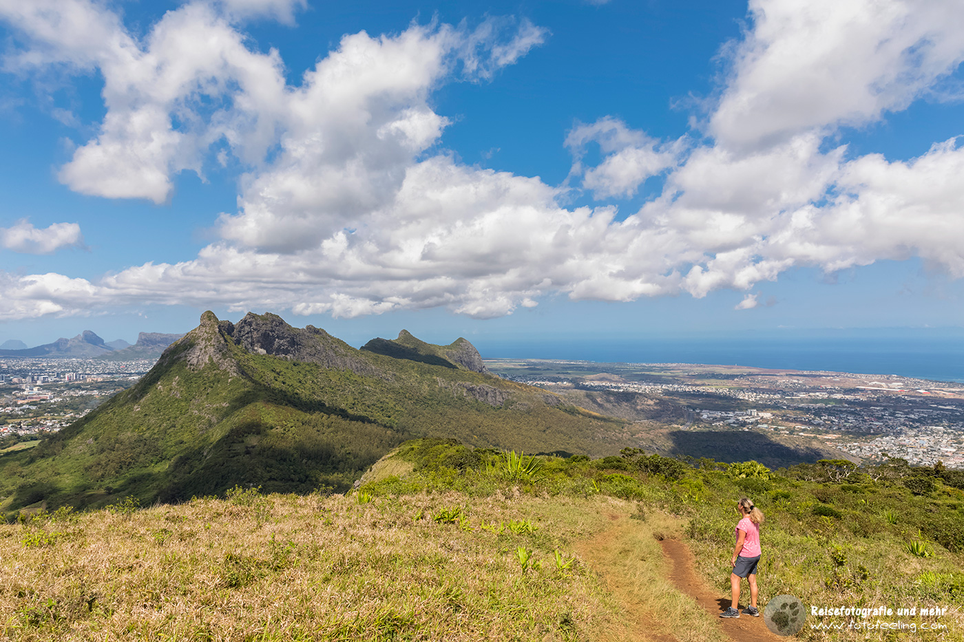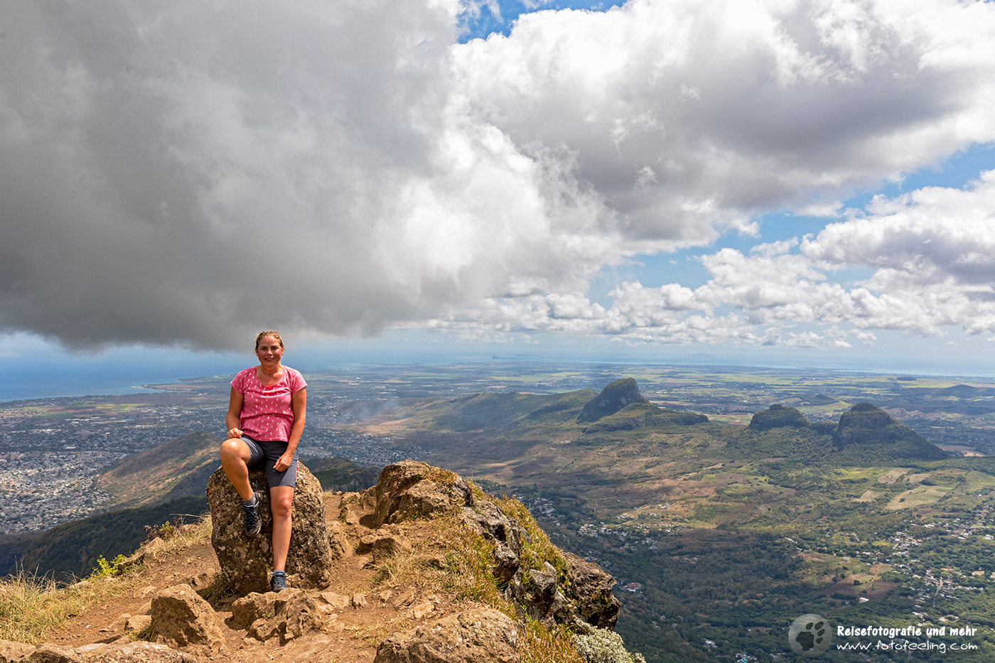 Weiter ging es in die kleine Ortschaft Moka und von dort aus noch ein Stück weiter bis zum Trailhead. Einige Jugendliche warteten darauf, abgeholt zu werden. Sie hatten die Nacht auf dem Berg verbracht und bestätigten uns, dass hier der Parkplatz sei, den man nicht auf Anhieb als selbigen erkannte. Die Jungs sagten zwar nichts, aber schauten verstohlen auf Chris Flip Flops. Nein, so würden wir natürlich nicht loswandern. Also schnürten wir die Wanderschuhe, ich schnappte meine Stöcke und los ging es. Anfangs wanderten wir durch Zuckerrohrfelder moderat dahin, dann wurde es steiler und ganz schön schweißtreibend. Dafür gingen wir ein ganzes Stück durch den schattigen Wald. Leider war der Weg ein unebenes Geröllfeld, was das Wandern nicht unbedingt leicht machte. Doch wir gewannen schnell an Höhe und erreichten schon bald das erste Plateau. Der Weg wurde nunmehr zu einem schmalen Pfad und führte uns in einem Bogen um den Berg herum. Sahen wir anfangs auf Moka und die Umgebung hinab, so bekamen wir langsam einen Blick auf Port Louis, das klein zwischen den Bergen vor uns lag. Was für ein toller Ausblick. Wir verweilten lange Zeit und schauten einfach nur. Neben uns hielt ein Wanderer, der aus Port Louis kam und uns erzählte, dass er von Moka stammt und diese Wanderung macht, um seinen Kopf frei zu bekommen. Genau das passiert hier. Man vergisst alles, was einem Sorgen macht und genießt das Sein bei dieser fantastischen Aussicht. Doch wir waren noch nicht am Ziel und weiter führte uns der Weg stetig leicht bergan bis zu einem zweiten Plateau, von dem aus wir auf die andere Seite der Insel schauen konnten. Die Berge vor uns und das Meer in weiter Ferne. Einfach traumhaft. Durch Büsche ging es steiler bergauf und man konnte den Weg nicht mehr verlassen, denn zum Teil waren die Gewächse höher als wir. Dann kam der letzte und anstrengendste Teil, es ging steil den Gipfel hinauf mit Klettereinlagen. Zwei Männer mit einigen Jungs kamen gerade wieder vom Gipfel hinunter – hm, das sollte doch machbar sein, munterte ich mich auf. Doch es ging links und rechts ewig weit in die Tiefe und ich merkte einmal wieder, dass ich nicht schwindelfrei bin. Gerade als ich Chris überzeugt hatte, dass ich den Absatz auf keinen Fall schaffe, fand er eine kleine Umgehung und half mir hinauf. Der Rest war einfach und kurz darauf standen wir auf dem Gipfel. Ich war so glücklich, dass ich es geschafft hatte und somit diesen 360 Grad Panoramablick genießen konnte. Wir konnten fast ganz Mauritius überblicken und ließen unsere Augen schweifen. Wir waren ewig oben und genossen die Aussicht, ehe wir uns auf den Weg zurück nach Moka machten. Der Abstieg hatte noch eine heikle Stelle, aber dank Chris Hilfe war sie halb so wild und schon bald ließen wir den Gipfel hinter uns. Der Rest des Wegs war angenehm und wir genossen noch einmal die Aussicht, ehe wir zurück am Auto waren. Mittlerweile war der Parkplatz gut gefüllt, aber einige Einheimische gingen hier nur ein wenig spazieren, denn sie hatten wirklich nur Flip Flops an.