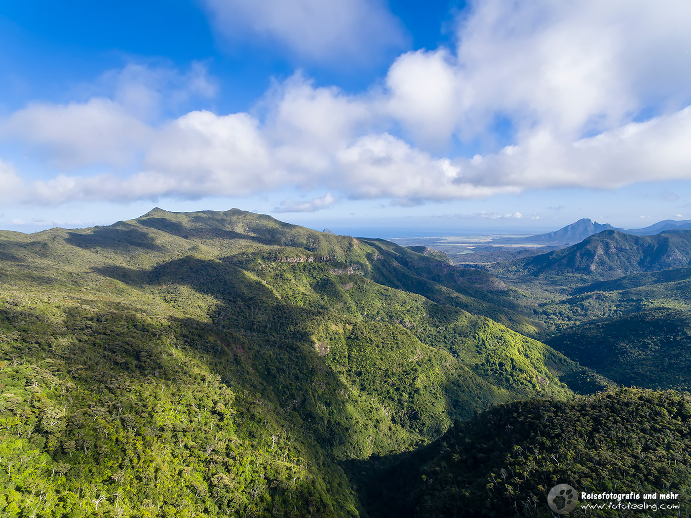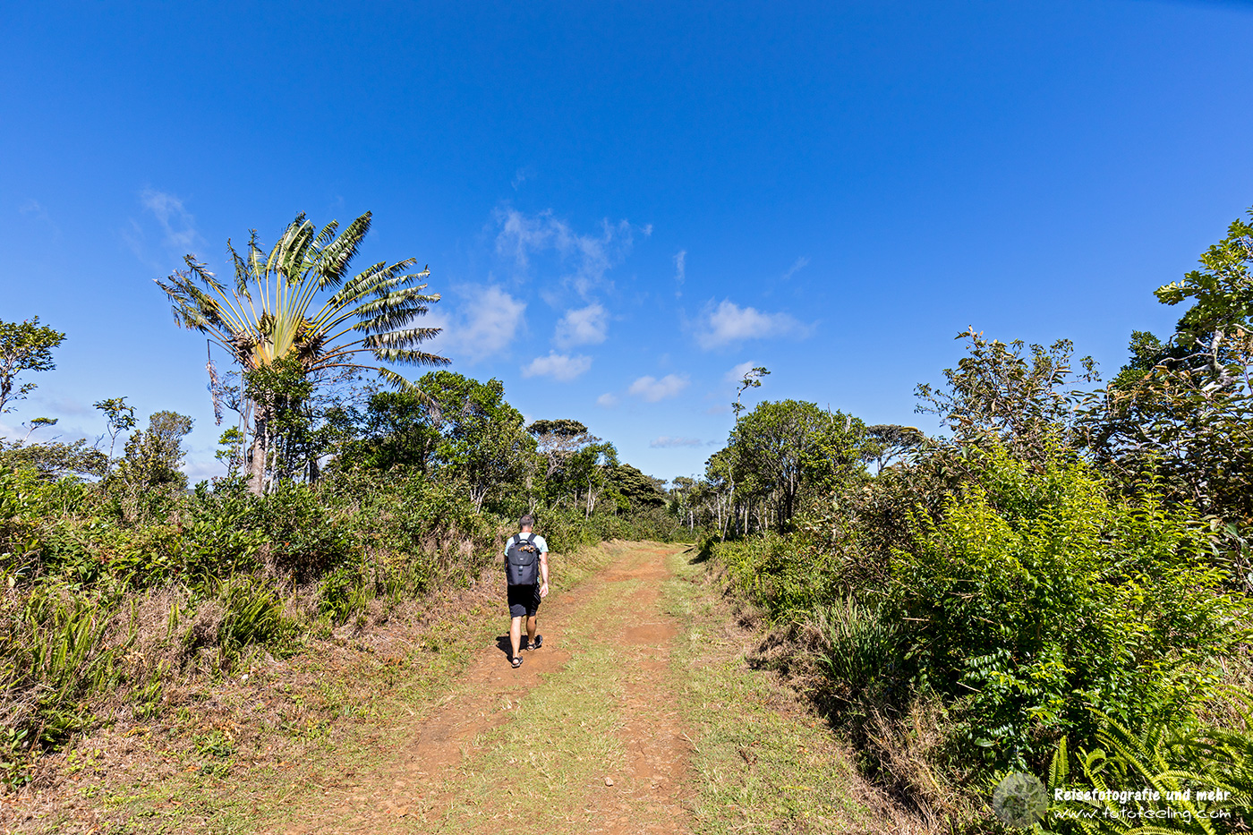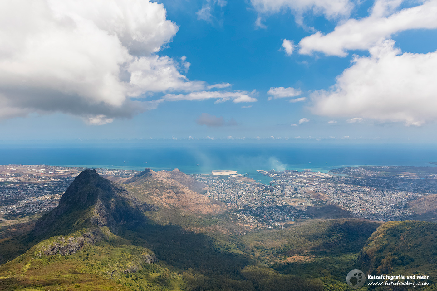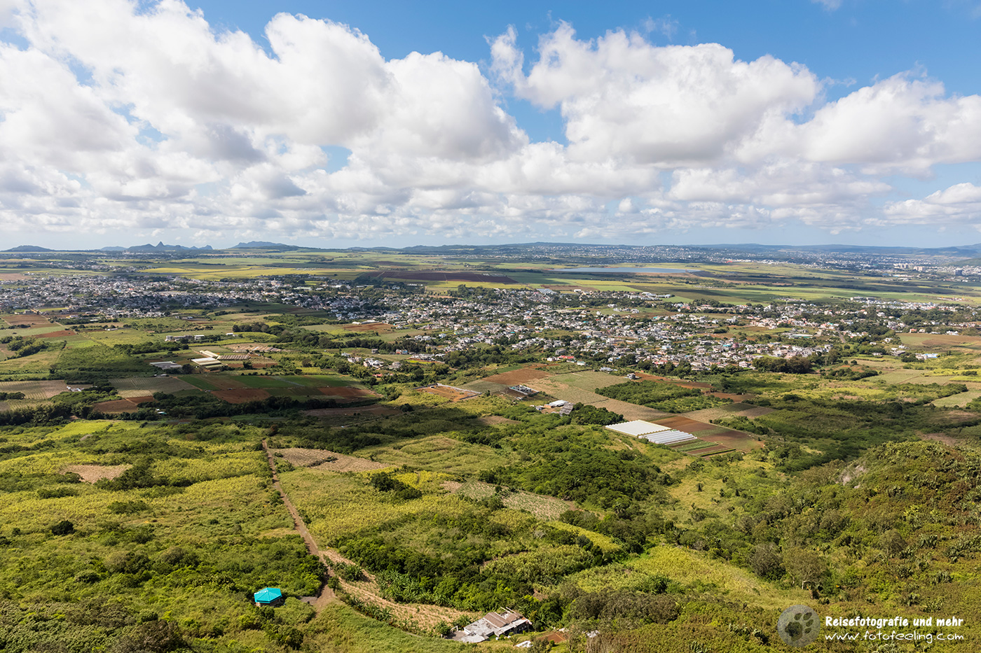 Weiter ging es in die kleine Ortschaft Moka und von dort aus noch ein Stück weiter bis zum Trailhead. Einige Jugendliche warteten darauf, abgeholt zu werden. Sie hatten die Nacht auf dem Berg verbracht und bestätigten uns, dass hier der Parkplatz sei, den man nicht auf Anhieb als selbigen erkannte. Die Jungs sagten zwar nichts, aber schauten verstohlen auf Chris Flip Flops. Nein, so würden wir natürlich nicht loswandern. Also schnürten wir die Wanderschuhe, ich schnappte meine Stöcke und los ging es. Anfangs wanderten wir durch Zuckerrohrfelder moderat dahin, dann wurde es steiler und ganz schön schweißtreibend. Dafür gingen wir ein ganzes Stück durch den schattigen Wald. Leider war der Weg ein unebenes Geröllfeld, was das Wandern nicht unbedingt leicht machte. Doch wir gewannen schnell an Höhe und erreichten schon bald das erste Plateau. Der Weg wurde nunmehr zu einem schmalen Pfad und führte uns in einem Bogen um den Berg herum. Sahen wir anfangs auf Moka und die Umgebung hinab, so bekamen wir langsam einen Blick auf Port Louis, das klein zwischen den Bergen vor uns lag. Was für ein toller Ausblick. Wir verweilten lange Zeit und schauten einfach nur. Neben uns hielt ein Wanderer, der aus Port Louis kam und uns erzählte, dass er von Moka stammt und diese Wanderung macht, um seinen Kopf frei zu bekommen. Genau das passiert hier. Man vergisst alles, was einem Sorgen macht und genießt das Sein bei dieser fantastischen Aussicht. Doch wir waren noch nicht am Ziel und weiter führte uns der Weg stetig leicht bergan bis zu einem zweiten Plateau, von dem aus wir auf die andere Seite der Insel schauen konnten. Die Berge vor uns und das Meer in weiter Ferne. Einfach traumhaft. Durch Büsche ging es steiler bergauf und man konnte den Weg nicht mehr verlassen, denn zum Teil waren die Gewächse höher als wir. Dann kam der letzte und anstrengendste Teil, es ging steil den Gipfel hinauf mit Klettereinlagen. Zwei Männer mit einigen Jungs kamen gerade wieder vom Gipfel hinunter – hm, das sollte doch machbar sein, munterte ich mich auf. Doch es ging links und rechts ewig weit in die Tiefe und ich merkte einmal wieder, dass ich nicht schwindelfrei bin. Gerade als ich Chris überzeugt hatte, dass ich den Absatz auf keinen Fall schaffe, fand er eine kleine Umgehung und half mir hinauf. Der Rest war einfach und kurz darauf standen wir auf dem Gipfel. Ich war so glücklich, dass ich es geschafft hatte und somit diesen 360 Grad Panoramablick genießen konnte. Wir konnten fast ganz Mauritius überblicken und ließen unsere Augen schweifen. Wir waren ewig oben und genossen die Aussicht, ehe wir uns auf den Weg zurück nach Moka machten. Der Abstieg hatte noch eine heikle Stelle, aber dank Chris Hilfe war sie halb so wild und schon bald ließen wir den Gipfel hinter uns. Der Rest des Wegs war angenehm und wir genossen noch einmal die Aussicht, ehe wir zurück am Auto waren. Mittlerweile war der Parkplatz gut gefüllt, aber einige Einheimische gingen hier nur ein wenig spazieren, denn sie hatten wirklich nur Flip Flops an.