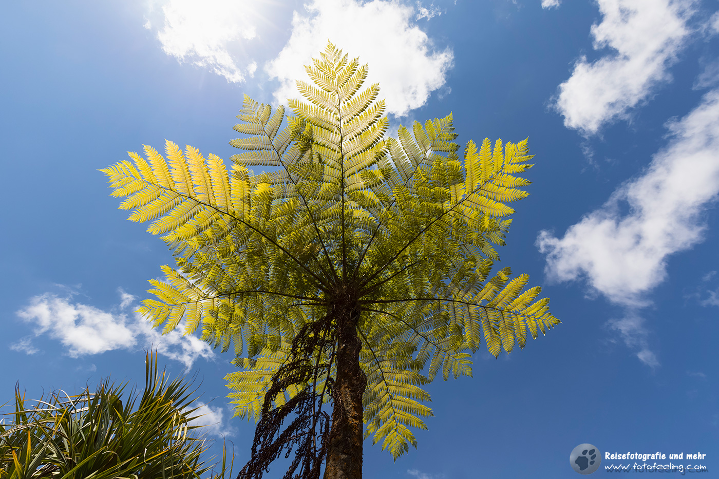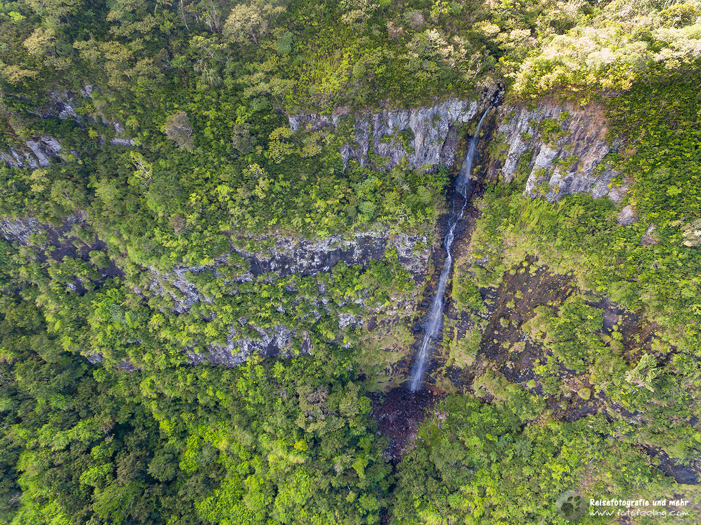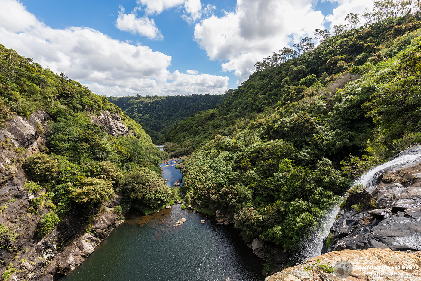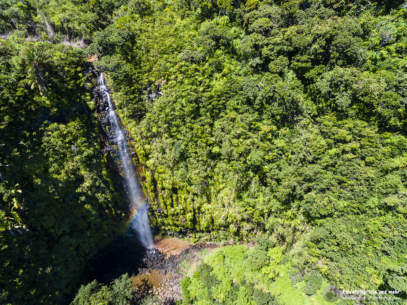 Einen weiteren Stopp machten wir an den Tamarin Falls nahe des Ortes Henrietta. Der Ausgangspunkt war gar nicht so einfach zu finden und es war wohl auch nicht gedacht, dass man sich alleine auf den Weg macht. Aber wir fanden problemlos den Einstieg und schon bald befanden wir uns auf dem Feldweg am Fluss entlang. Relativ schnell ging es jedoch nach links in die Büsche und der Weg wurde steil, rutschig und steinig. Wir waren froh, unsere Wanderschuhe an den Füßen zu haben, denn so hatten wir Halt und merkten nicht jedes Steinchen. Auch Mücken gab es hier zahlreich, so dass ich mich nach ein paar Stichen einschmierte. Nach einer gefühlten Ewigkeit erreichten wir die erste Stufe des 7 stufigen Wasserfalls. Weiter wollten wir an diesem Tag auch nicht, denn für alle 7 Stufen braucht man den ganzen Tag. Weiter unten kann man in den Wasserbecken baden, aber auch das wollten wir nicht an diesem Tag. So verweilten wir an der ersten Stufe und Chris ließ den Kopter steigen. Durch ihn hatten wir wieder eine super gute Sicht auf die Wasserfälle, was uns völlig ausreichte.