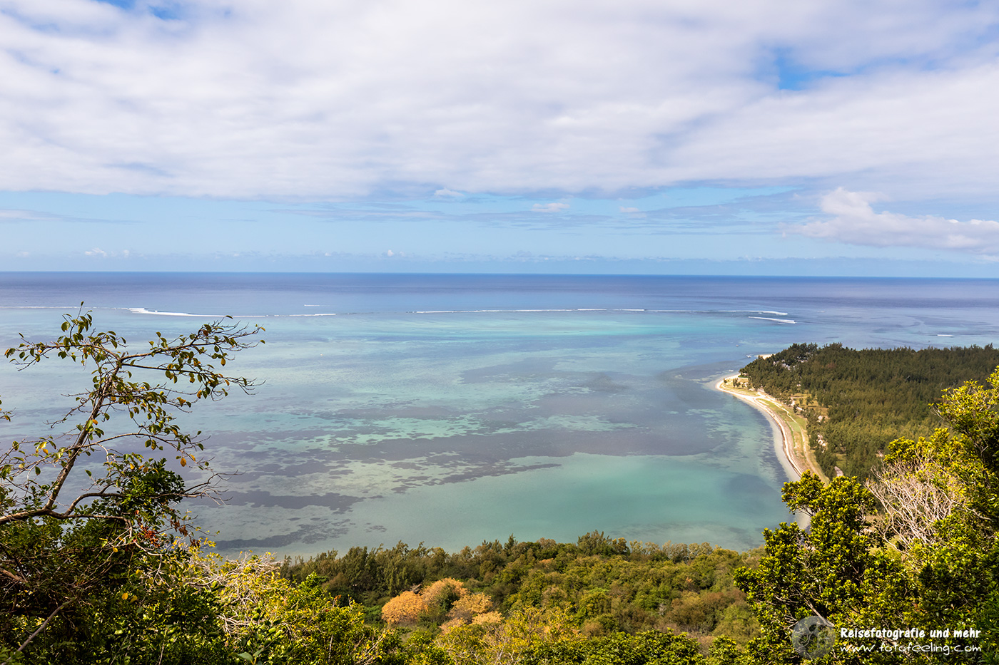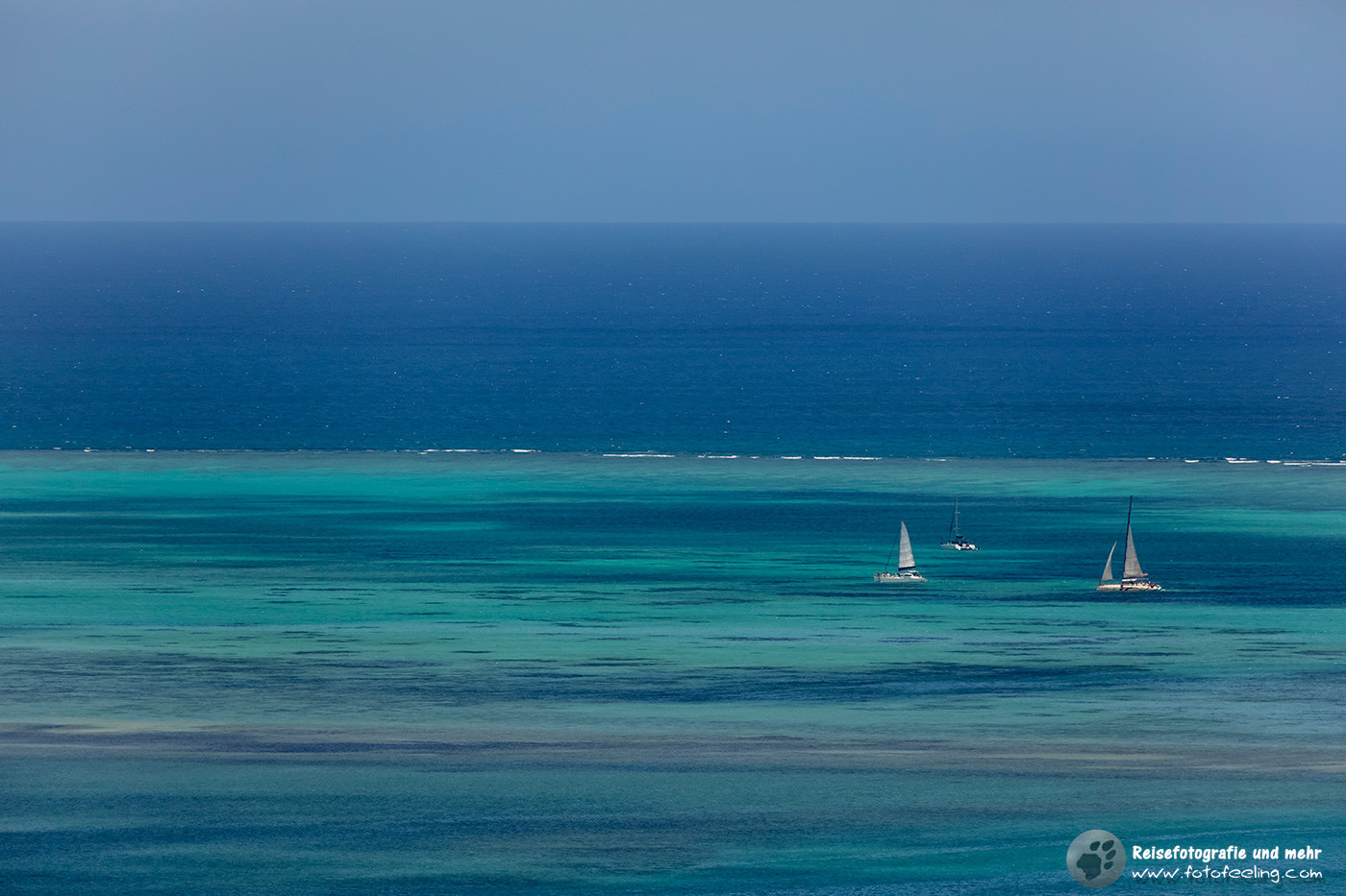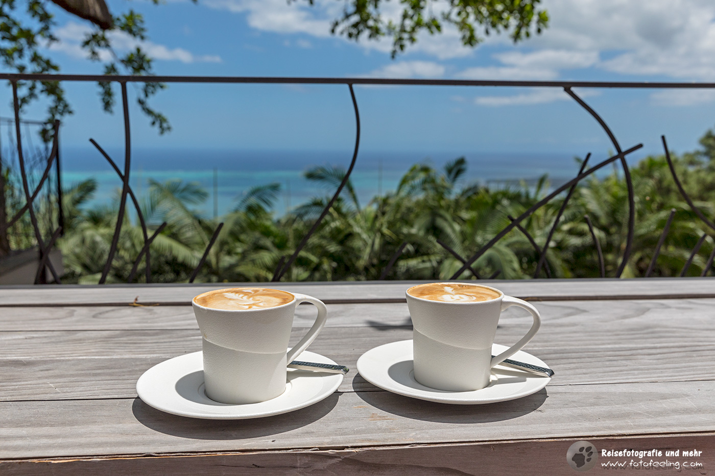 Danach stoppten wir noch am Chamarel Restaurant und tranken einen leckeren Cappuccino mit Aussicht. Die Sonne lachte vom Himmel und das Wasser leuchtete in den schönsten Blautönen. Der Cappu schmeckte köstlich, was nicht nur an der Aussicht lag.