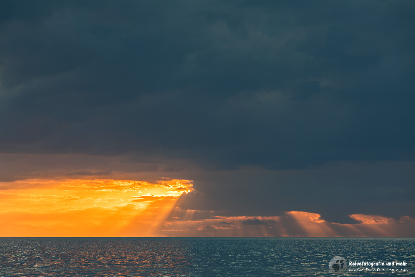 Wir kauften noch ein und fuhren dann zurück zu unserer Unterkunft, wo wir erst einmal Brotzeit machten. Danach gönnten wir uns ein erfrischendes Bad im Pool. Mittlerweile sahen die Wolken an den Bergen echt bedrohlich aus, aber bei uns schien immer noch die Sonne. Doch die Regenfront zog näher und vertrieb uns aus dem Pool. Schnell flitzten wir zurück in unser Zimmer und schauten zu, wie ein tropischer Regenguss in Sekunden alles pitschnass machte. Jetzt gingen die Wolken fast bis zum Horizont und überall regnete es. Dafür war der Sonnenuntergang dramatisch mit tollen Farben.