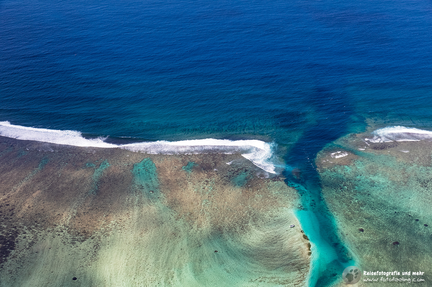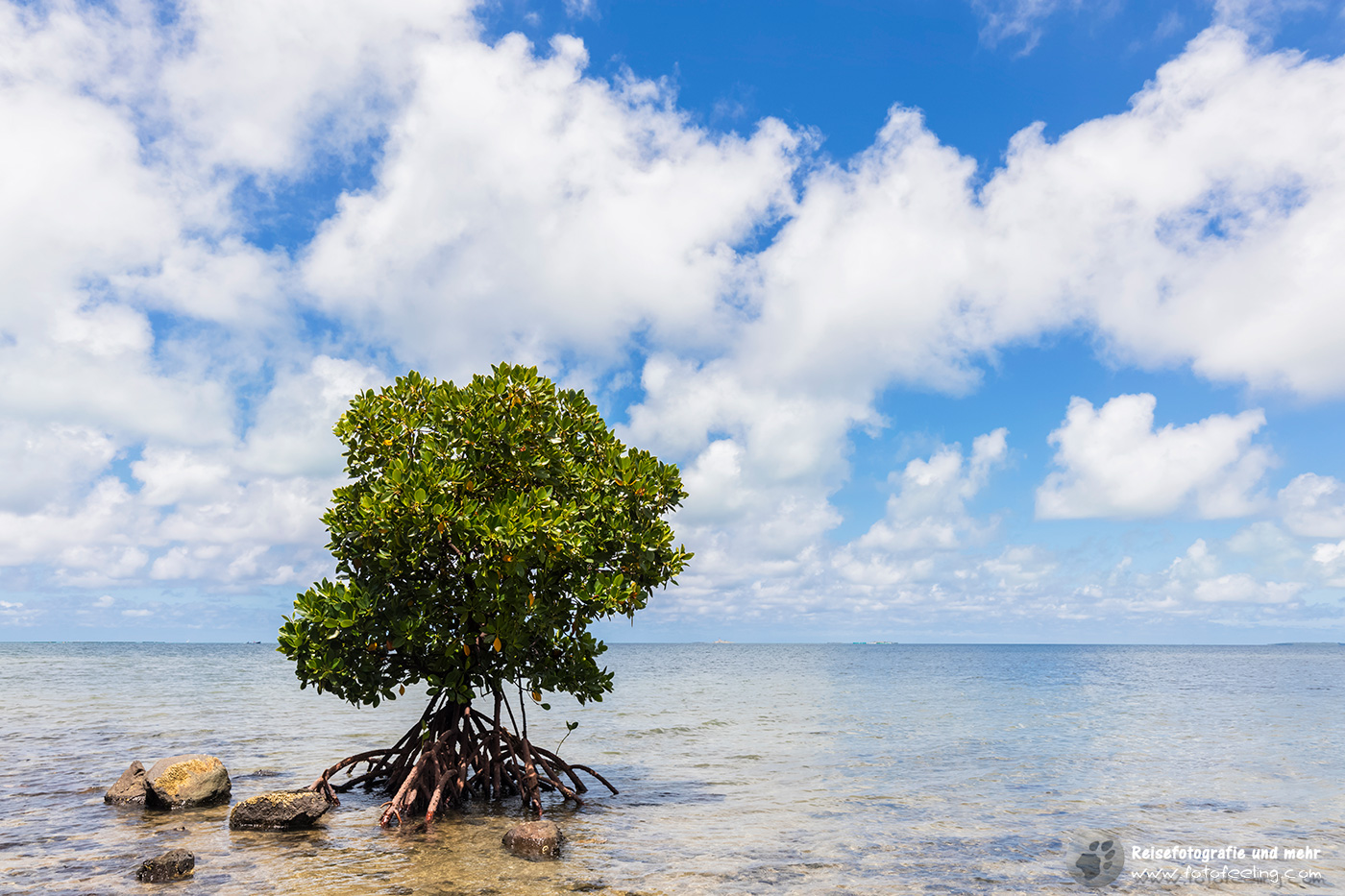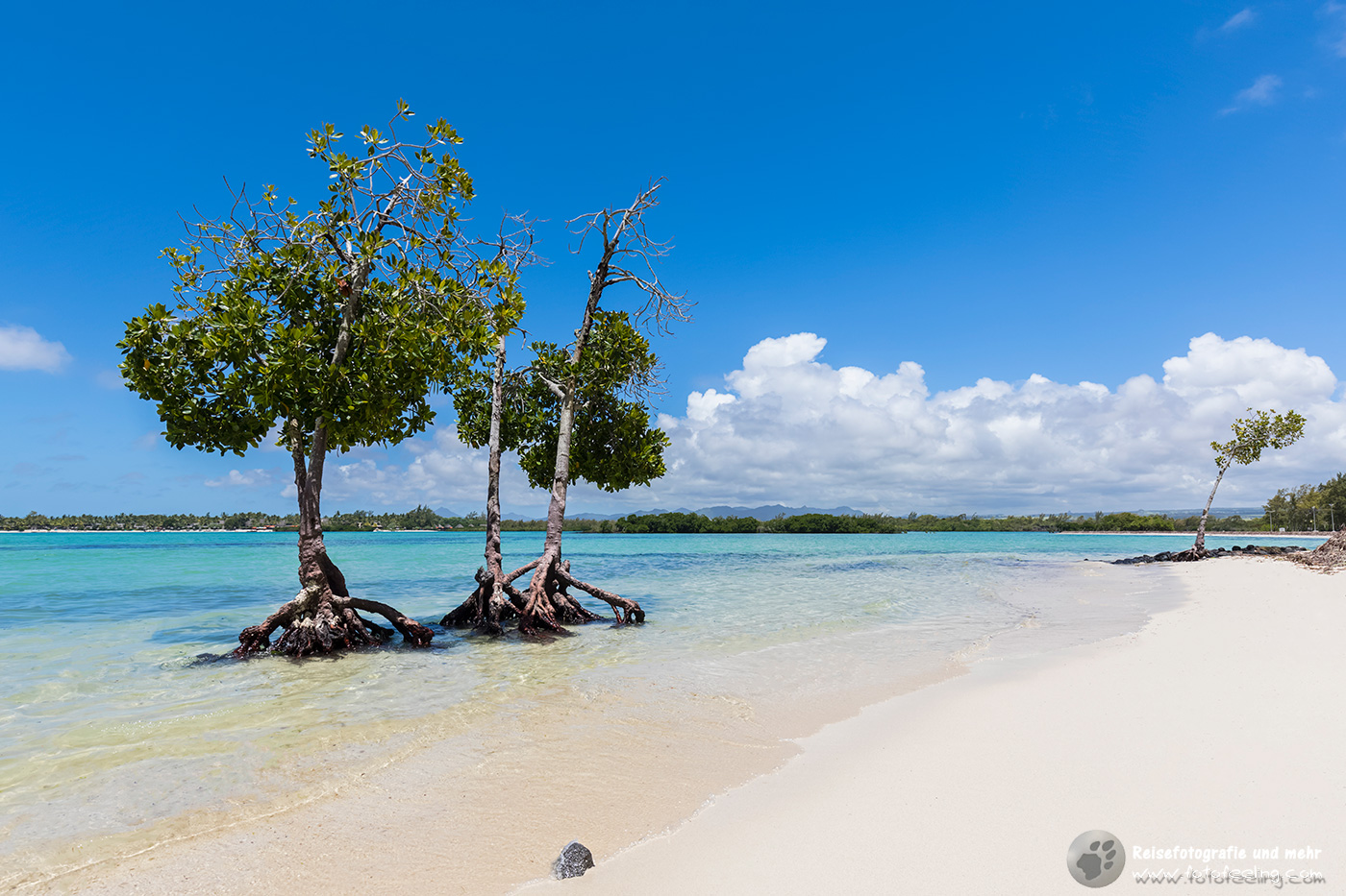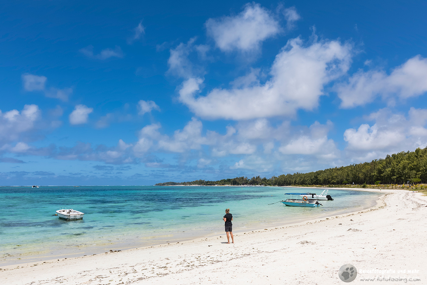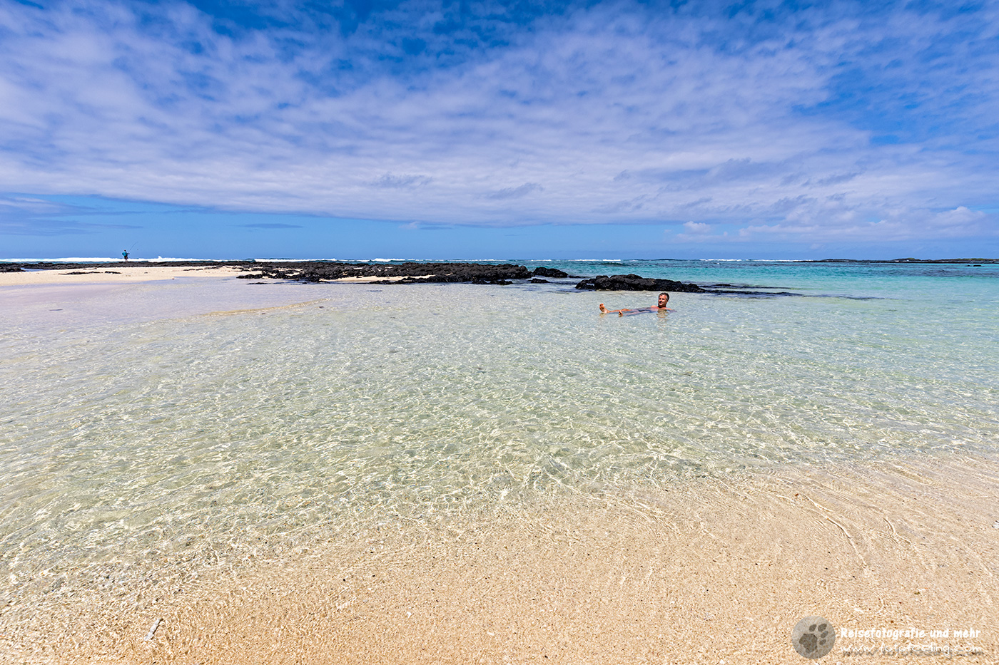 Dafür wurde der Rest des Tages umso besser. Wir hielten noch einmal an der Kirche Notre Dame Auxiliatrice de Cap Malheureux und besuchten ein paar wirklich tolle Strände. An einem Mangrovenstrand stand nur ein einzelner Fischer im Wasser und ringherum kein einziger Mensch. Hier zogen wir uns aus und sprangen ins kristallklare kühle Wasser. War das ein Genuss. Das wiederholten wir an jedem schönen Strand und waren einmal so richtig ausgiebig baden. Was für ein schöner Tag. Außerdem ließ Chris ab und zu die Drohne fliegen und machte ein paar tolle Strand- und Meeraufnahmen.