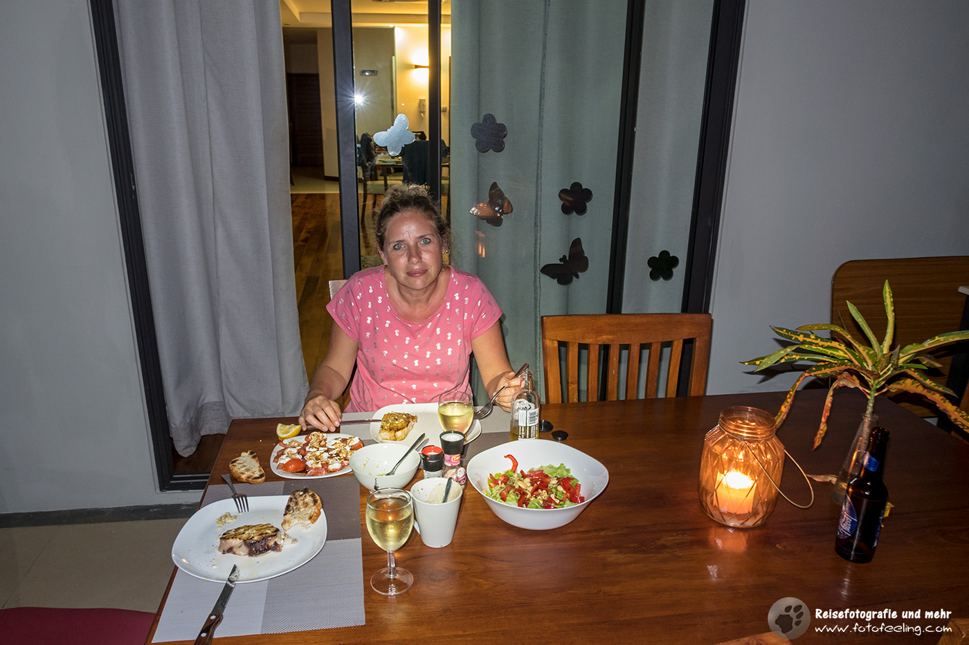 Zurück im Kaz Ocean machten wir Brotzeit und ließen uns den besten Trüffelkäse aller Zeiten sowie andere Leckereien mit frischen knackigen Weintrauben schmecken. Es blieb stark bewölkt an diesem Nachmittag. So schliefen wir etwas und lasen in unseren Büchern. Am Abend grillte Chris Thunfischsteaks mit dem Grill am Pool und ich machte uns einen Salat dazu. Gutes Baguette hatten wir eh noch und es wurde ein absolutes Spitzenessen. Der Thunfisch war so zart, dass er auf der Zunge zerging und dabei schmeckte er auch noch aromatisch.