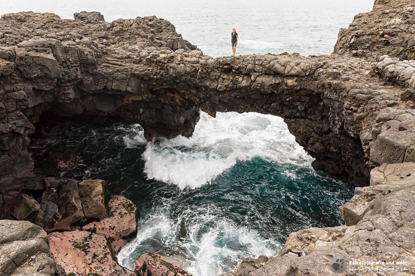 Wir wanderten an der wilden rauen Steilküste entlang. Die Steinbrücke war riesig und man konnte sie sogar überqueren. Mächtige Wellen schlugen dagegen und Gischt spritzte bis zu uns hoch. Ein toller Anblick dafür hatte sich die Rüttelfahrt durch die Zuckerrohrfelder gelohnt.