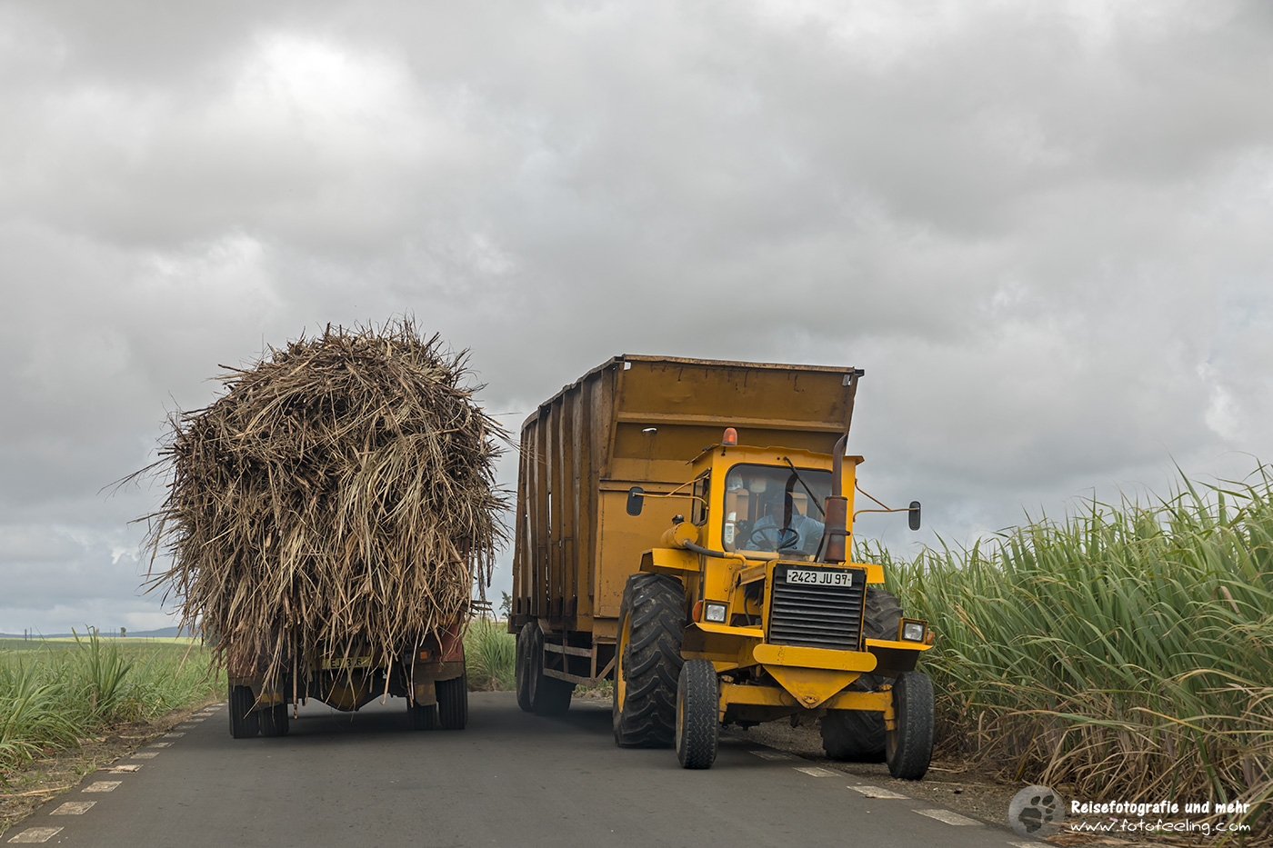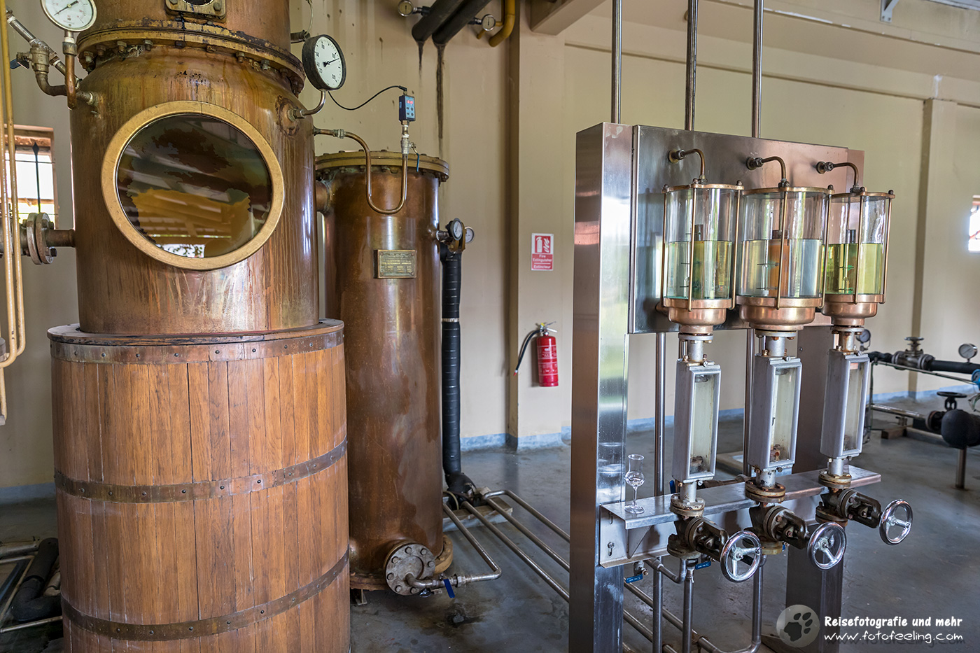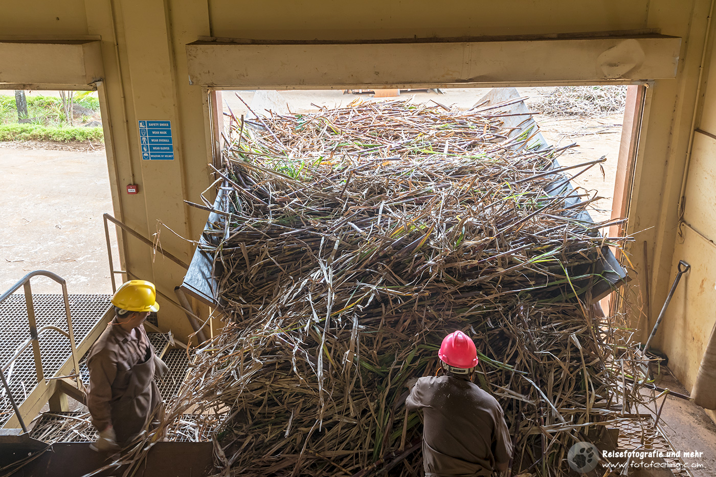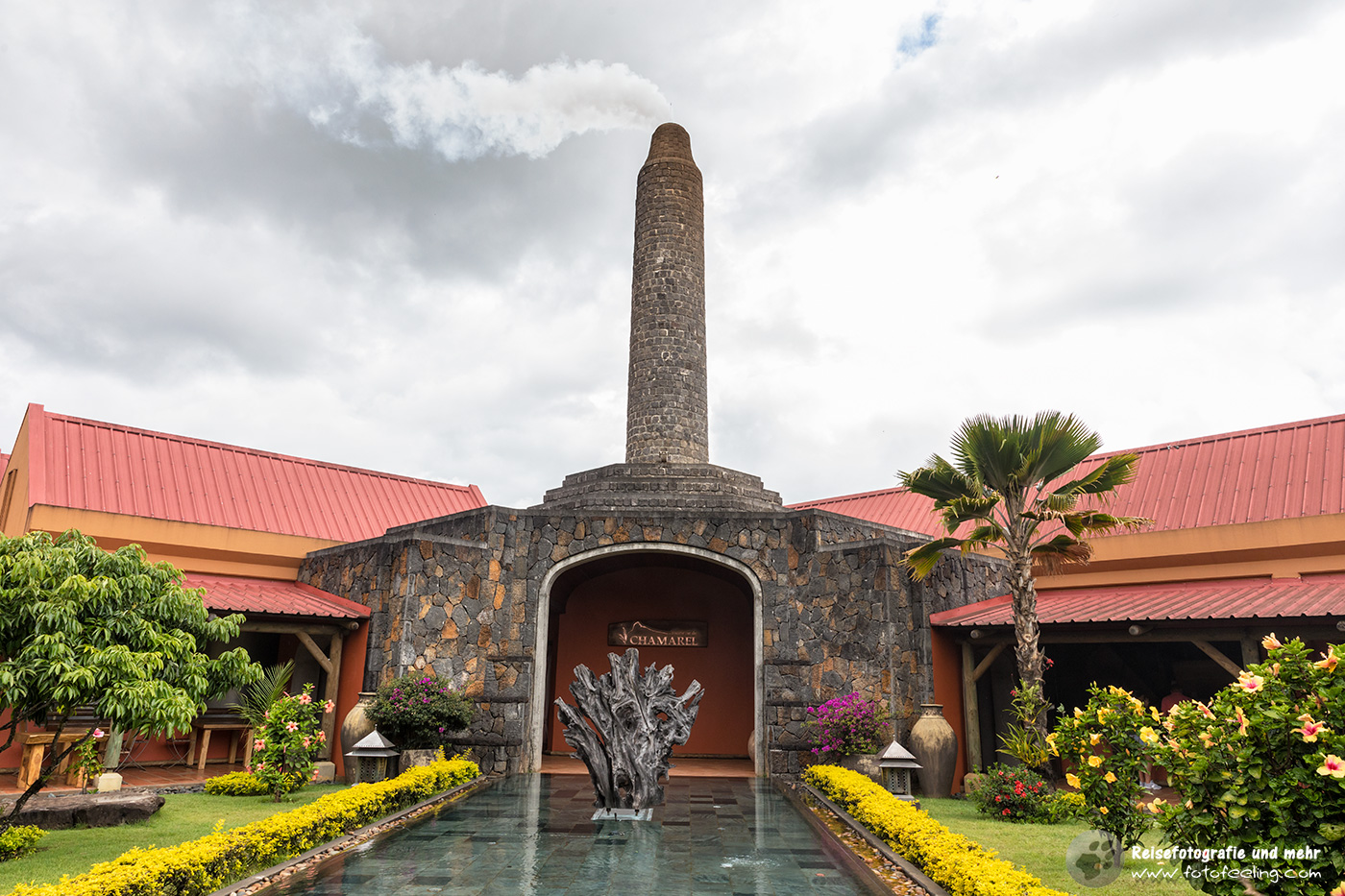 Als wir wieder an der Rumfabrik "Rhumerie de Chamarel" vorbei kamen, beschlossen wir spontan eine Besichtigung zu machen. Genug Zuckerrohrfelder hatten wir ja schon gesehen. Jetzt wollten wir auch noch erfahren, wie man Rum daraus macht. Auf Mauritius sind nämlich ca. 80 Prozent der landwirtschaftlichen Nutzfläche mit Zuckerrohr bebaut. Ein Abfallprodukt der Zuckerherstellung ist die Melasse und daraus wird der Rum gewonnen.