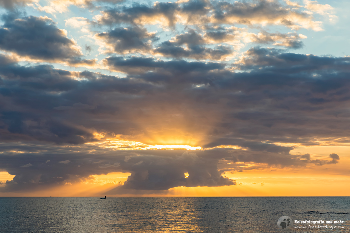 Nach dem super Frühstück mit knusprigen Semmeln und Croissants machen wir uns auf, um die Strände der Umgebung zu erkunden. Leider passierte Chris gleich am Anfang unseres Ausflugs ein dummes Missgeschick. Wir hielten an einem kleinen Strand und er ging eine Bootsrampe hinunter, um ein paar bunte Boote auf dem Meer zu fotografieren. Er war so abgelenkt von dem Motiv, dass er nicht nachdachte und auf die nassen Steine stieg, die natürlich extrem rutschig waren. Es kam wie es kommen musste. Ich hörte nur einen Aufschrei und als ich schaute, lag er am mit schmerzverzerrtem Gesicht am Boden und hatte Schwierigkeiten auf der „Schmierseife“ wieder Halt zu finden. Zum Glück war nichts weiter passiert, nur ein paar blaue Flecken und Abschürfungen, aber das hätte echt dumm laufen können.