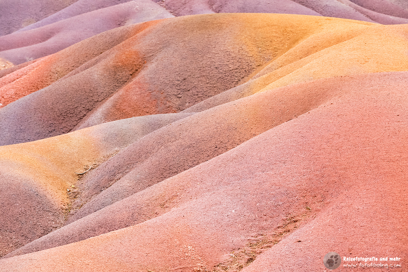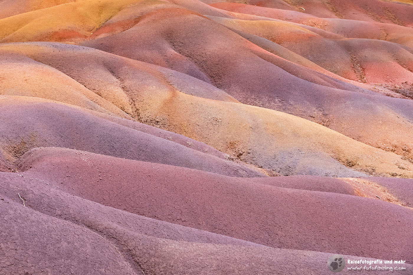 Danach folgten wir der Straße bis zum nächsten Parkplatz. Hier war es so voll, dass wir ein wenig warten mussten, bis eine Parkbucht frei wurde. Dann folgten wir dem Pfad bis zum Kassenhäuschen, wo noch einmal unsere Tickets kontrolliert wurden. Nach einem kurzen Weg standen wir vor der „Siebenfarbigen Erde“ und waren wirklich begeistert. Sie ist durch getrocknete Lava entstanden und wegen der Mineralarmut wachsen hier keine Pflanzen. So lag die hügelige Landschaft in den schönsten Erdtönen von ockerfarben, über rot und grün bis hin zu violett leuchtend vor uns. Die Farben kommen durch eine hohe Konzentration an Eisen und Aluminium zustande. Man kann sie sogar von allen Seiten betrachten, denn ein Wegsystem führt auf die gegenüberliegende Seite. Wir waren wirklich beeindruckt, auch wenn das Gebiet nicht sehr groß war. Die Farben und die Wellen waren einfach klasse.