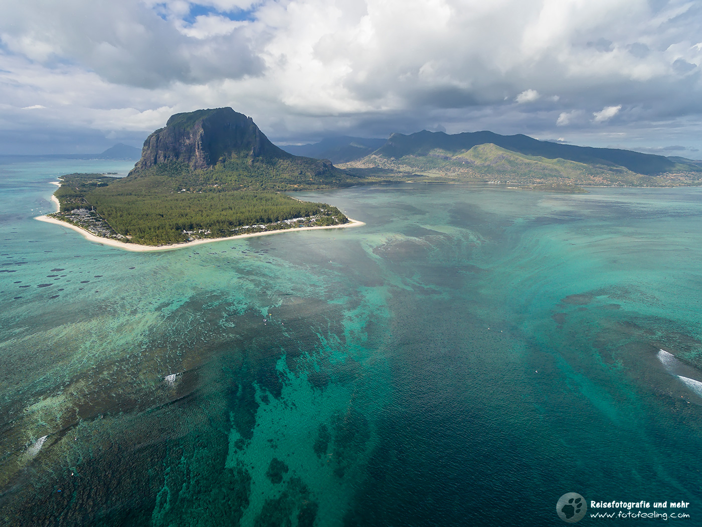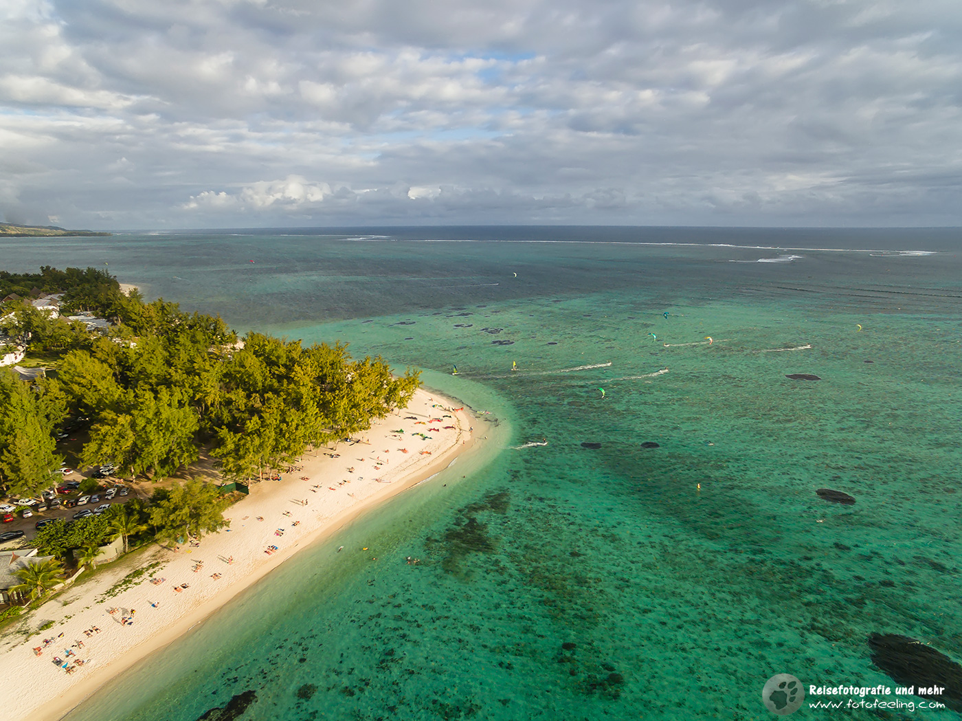 Wir verabschiedeten uns von den Beiden und fuhren vor zum Le Morne Beach, wo Chris noch einmal den Kopter aufs Meer schickte, um den Unterwasserwasserfall auch damit abzulichten. Er flog fast 1,5 km aufs Meer hinaus und hatte jetzt auch mit der Drohne Erfolg. Wir badeten und genossen das schöne Wetter am Strand. Diesmal erkundeten wir auch den rechten Strandabschnitt, wo an diesem Tag die Kite Surfer durch das Wasser glitten, denn hier war richtig viel Wind, während am linken Strandabschnitt überhaupt kein Wind war. Wir holten uns noch gebratene Nudeln an einem Strandwagen, die richtig super schmeckten und als kleiner Nachmittagssnack gerade richtig waren.