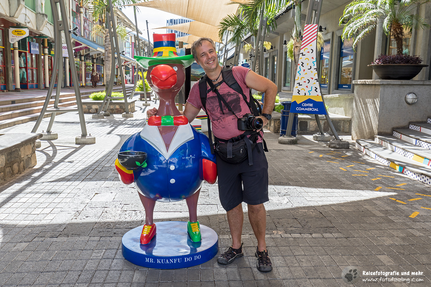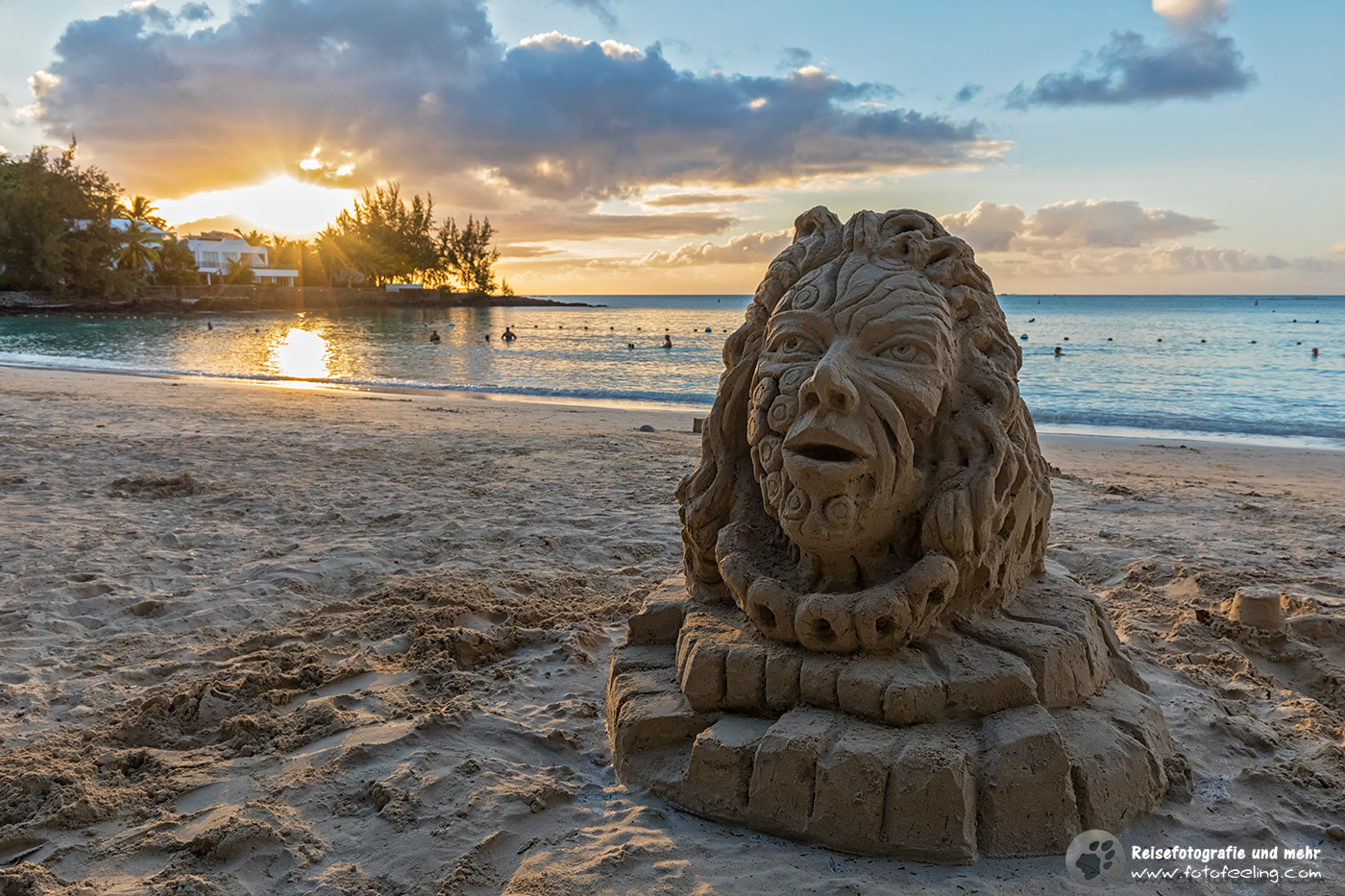 An diesem Abend wollten wir wieder Essen gehen und so reservierte Chris einen Tisch im Grill & Chill in Pereybere Grand Baie. Wir fuhren etwas eher los, da wir den Sonnenuntergang an dem kleinen netten Strand vor Ort verbringen wollten. Als wir an den Strand kamen, entdeckte Chris eine tolle Sandfigur, die er sogleich fotografierte. Der Künstler freute sich und erzählte, dass er den ganzen Tag dafür gebraucht hatte. Er hatte aus Sand ein richtiges Kunstwerk geschaffen, das sich wunderschön vor dem hellen Sand und dem Meer im Gegenlicht machte.