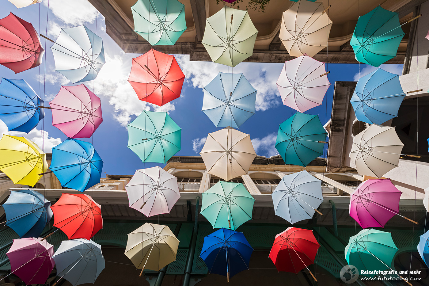 Das Wetter war richtig schön geworden und die Sonne lachte vom Himmel. Wir setzten uns in ein Straßencafé tranken Cappuccino und aßen dazu ein exquisites Eistörtchen. Danach schlenderten wir noch etwas durch die Gassen der Stadt. Besonders gefielen uns die vielen bunten Schirme, die zwischen die Häuser gespannt wurden, aber auch der Blick auf den Hafen und die Häuser der Promenade. Die Waterfront war wirklich gut gelungen und es machte Spaß, hier entlang zu laufen.