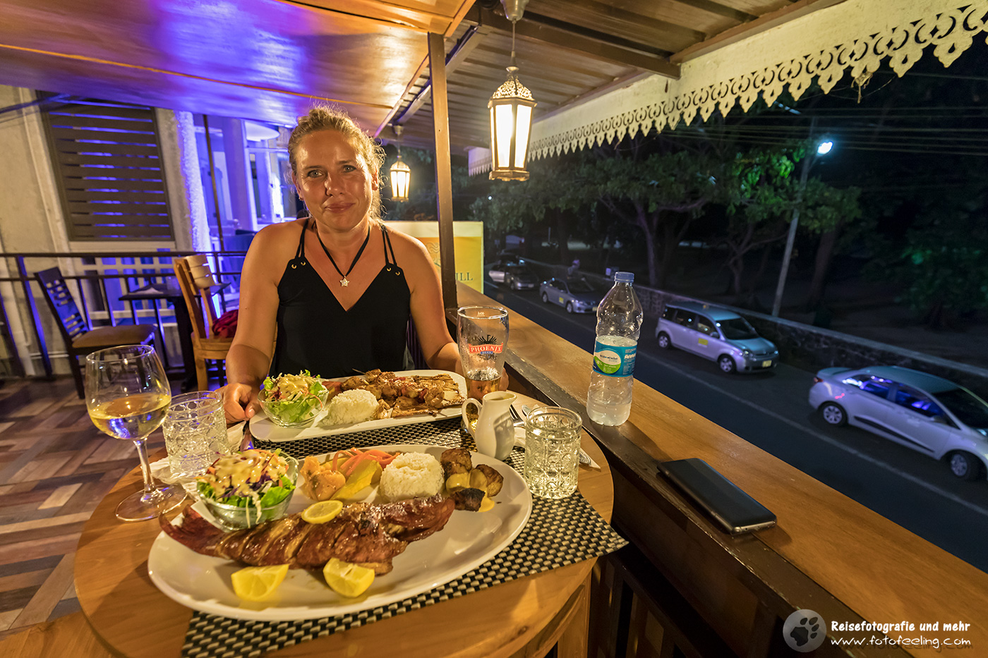 Leider versank die Sonne wieder in den Wolken und so gingen wir etwas eher ins Restaurant. Wir saßen auf dem Balkon im ersten Stock. Chris bestellte Red Snapper und ich einen Fisch-Shrimp-Spieß. Anfangs waren wir ganz alleine, aber nach und nach füllte sich das Restaurant. Der Fisch war gut, richtig lecker waren jedoch die Bratkartoffeln in Senfsoße, die knusprig und gut gewürzt waren.