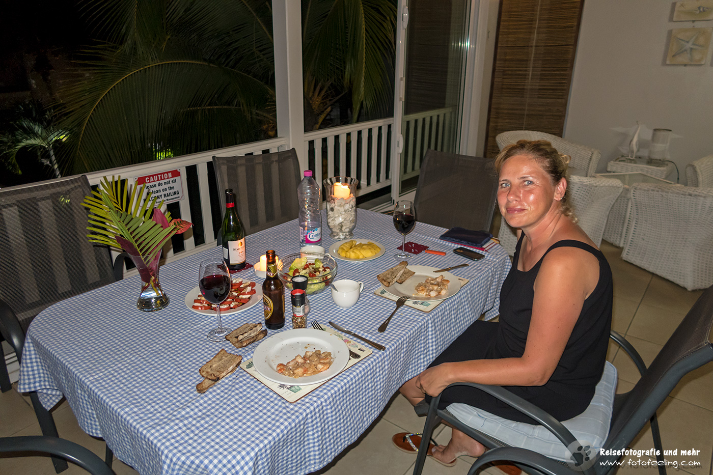 Wir grillten unsere Lobster, saßen noch lange draußen auf dem Balkon und lauschten dem Rauschen des Meeres und dem Rascheln der Palmenblätter im Wind bei Kerzenschein und einem Glas Wein.