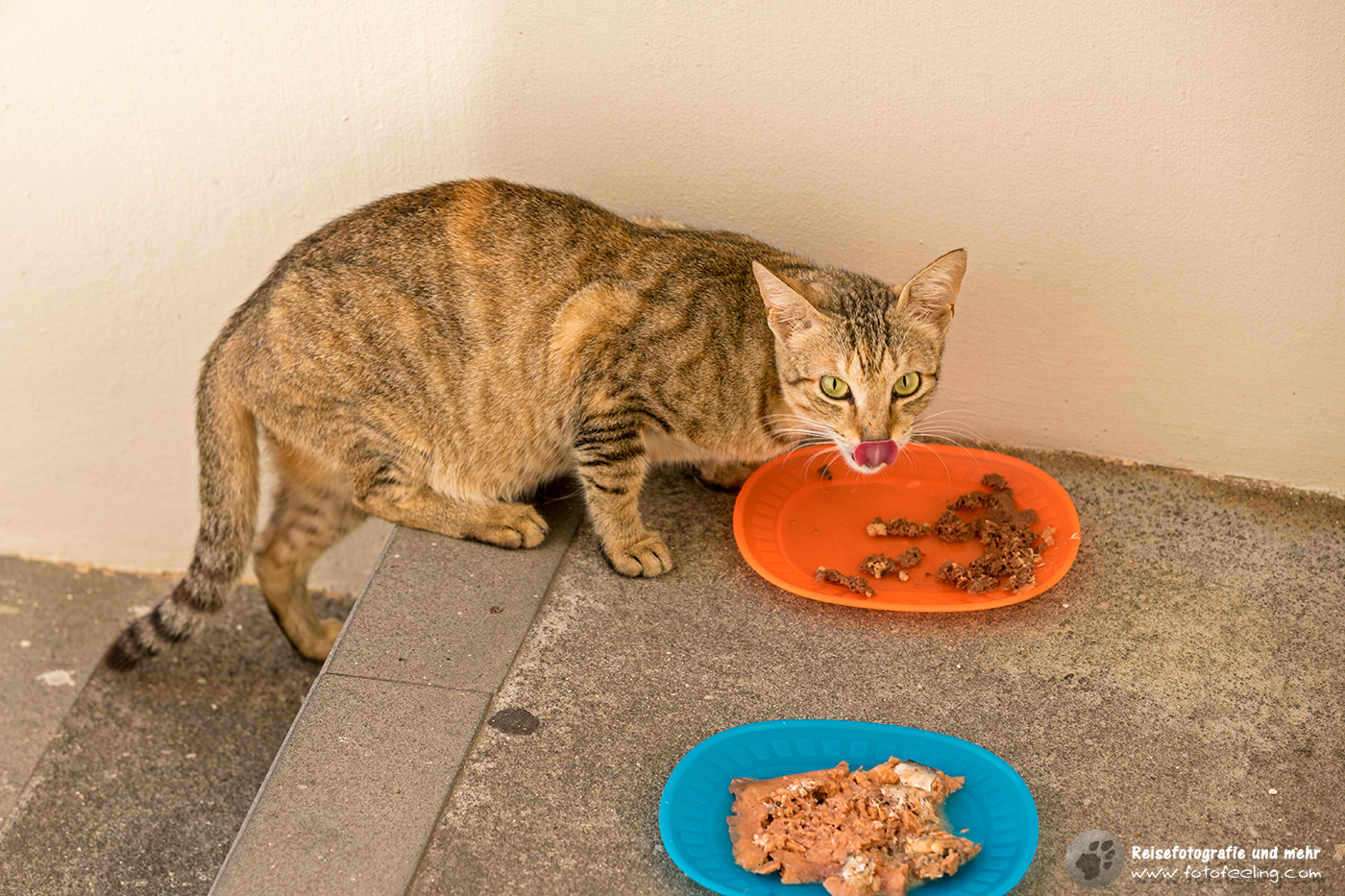 Zum Abendessen gab es diesmal Rib Eye vom Grill mit frischem Salat und unser Obst als Nachspeise. Schon am Ankunftstag waren uns einige Katzen aufgefallen, die von der Dame, die unter uns wohnte, versorgt wurden. Leider reiste sie ab und zurück blieben mehrere hungrige Katzen, die sie suchten. Sie war wohl eine Eigentümerin und hat hier eine lange Zeit verbracht, aber leider kümmerte sich nun niemand mehr um die Tiere. Das konnten wir natürlich nicht zulassen und besorgten Katzenfutter, so dass sie zumindest während unseres Aufenthaltes versorgt waren.