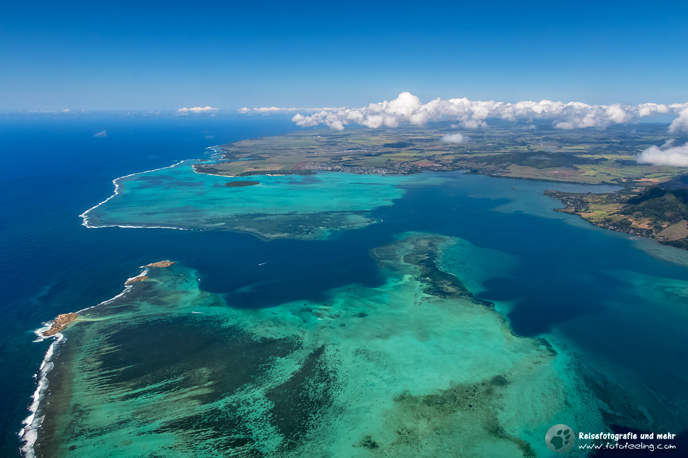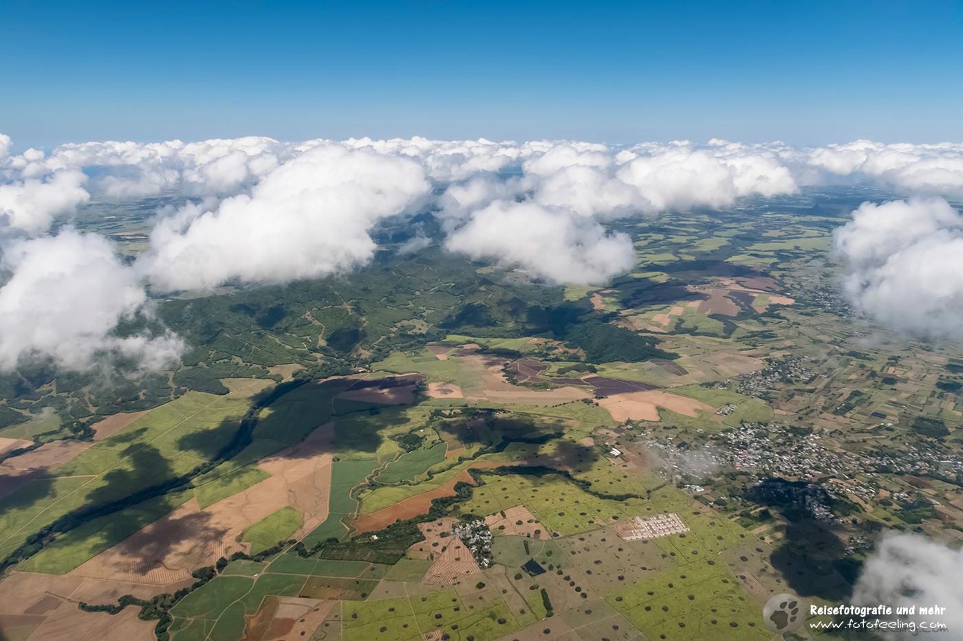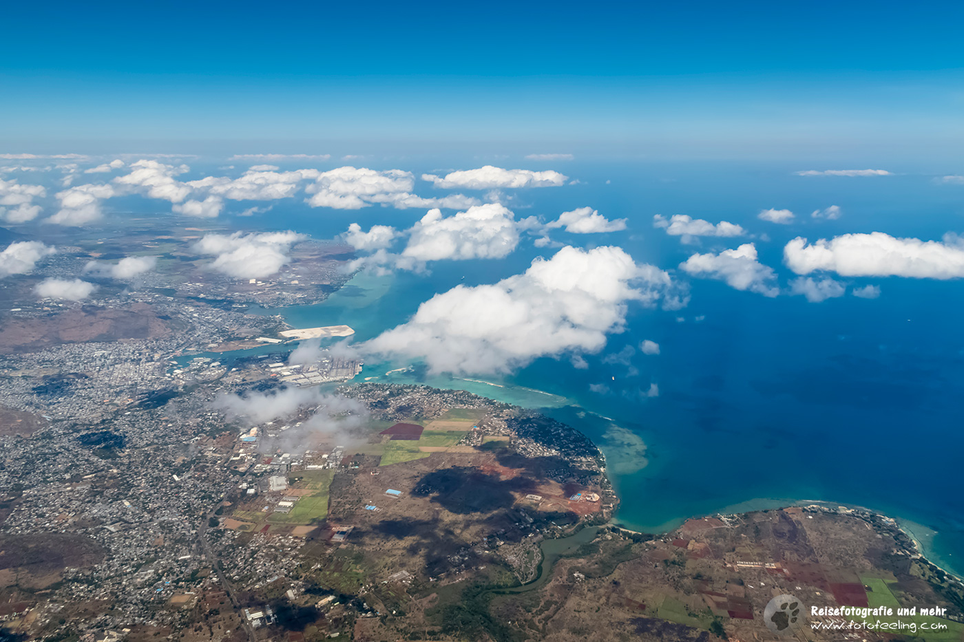 Auf dem Weg zum Flughafen stoppten wir an unserer Lieblingsstelle inmitten der Zuckerrohrfelder, dann rissen wir uns los und brausten nach Port Louis. Um 8.00 Uhr waren wir am Airport und gaben das Auto zurück. Die Rückgabe verlief kurz und schmerzlos. Auch der Check-in war angenehm. Wir tranken noch einen Cappuccino und um 10.36 Uhr startete die Condor zurück nach München. Eigentlich war das unser Urlaub, doch wir bekamen noch einen Bonus, denn der Flieger flog einmal quer über die Insel und wir bekamen noch einmal ein paar tollen Luftansichten von der Blue Bay und Port Louis.